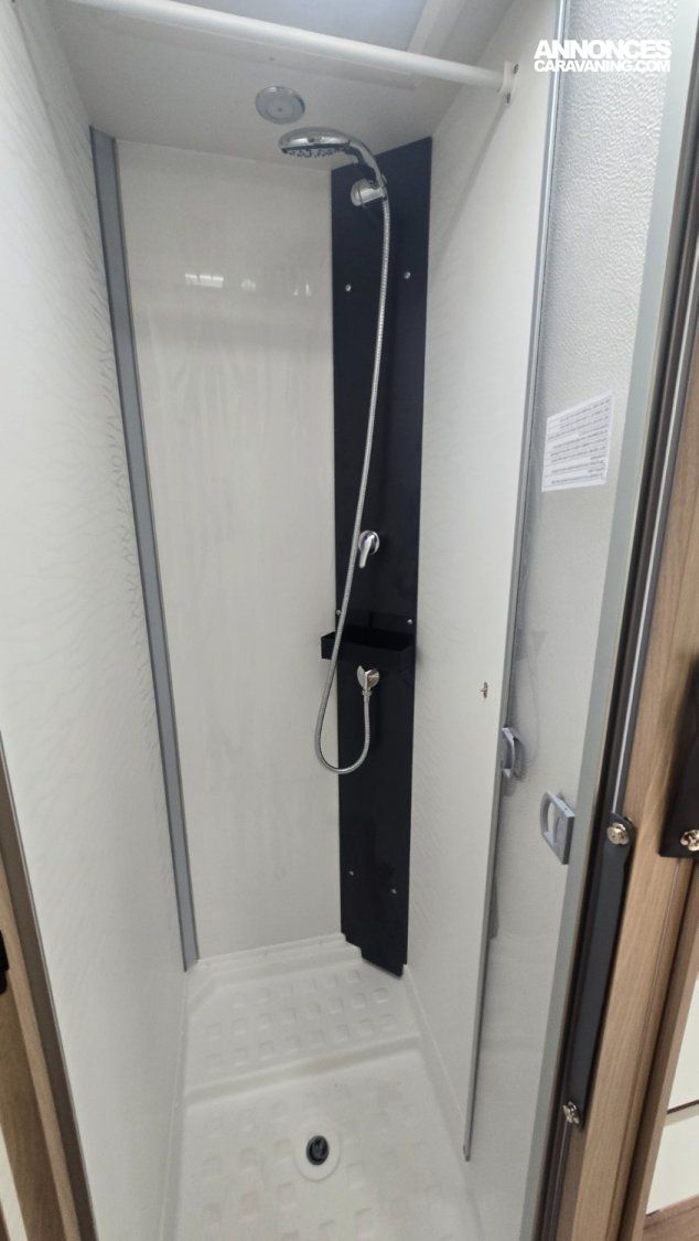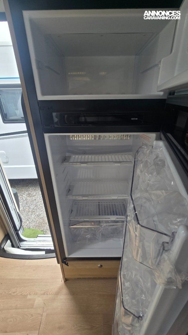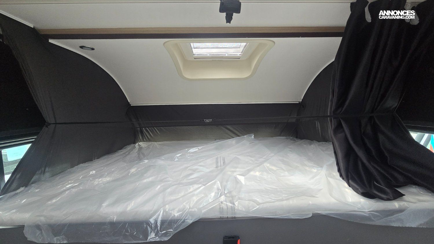 Chambre enfants avec 3 couchages, double penderie, douche séparée, évier inox avec grand plan de travail et réfrigérateur 145L et un grand salon.
