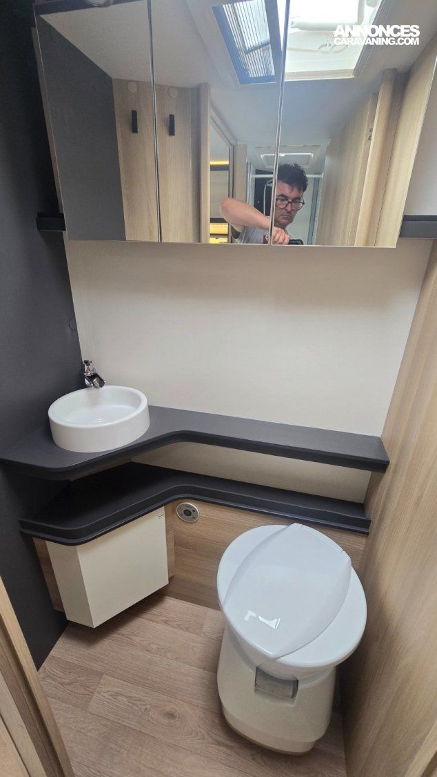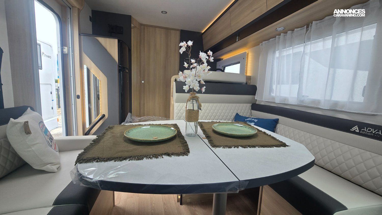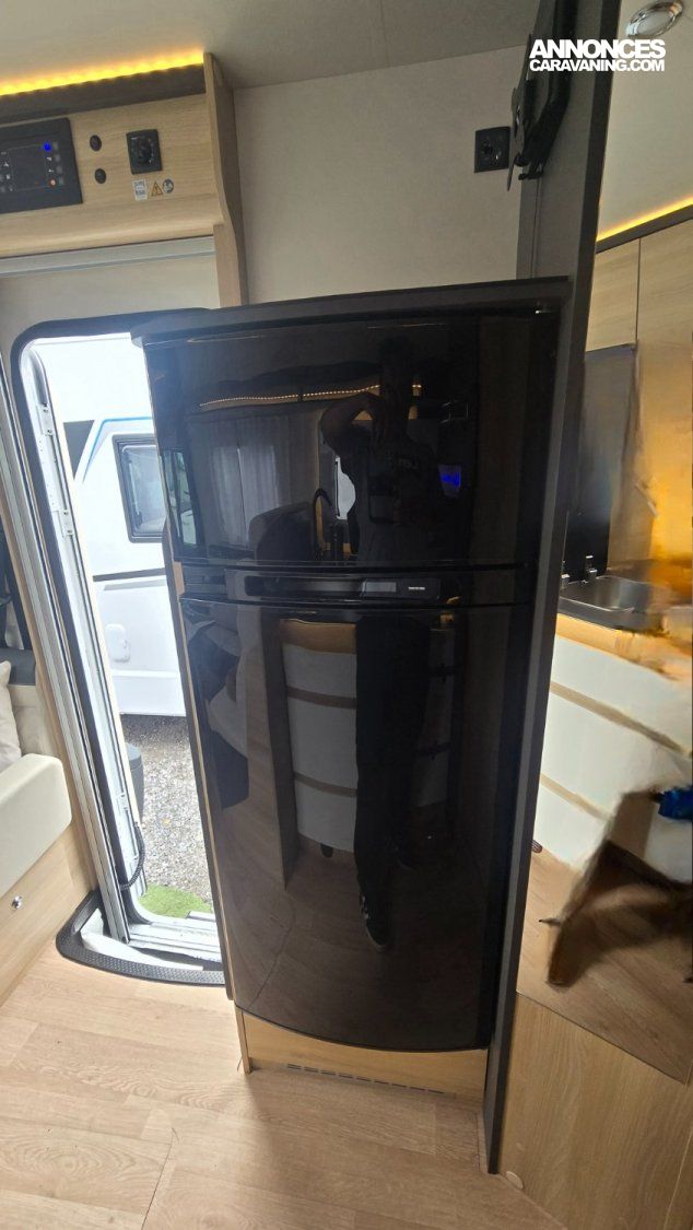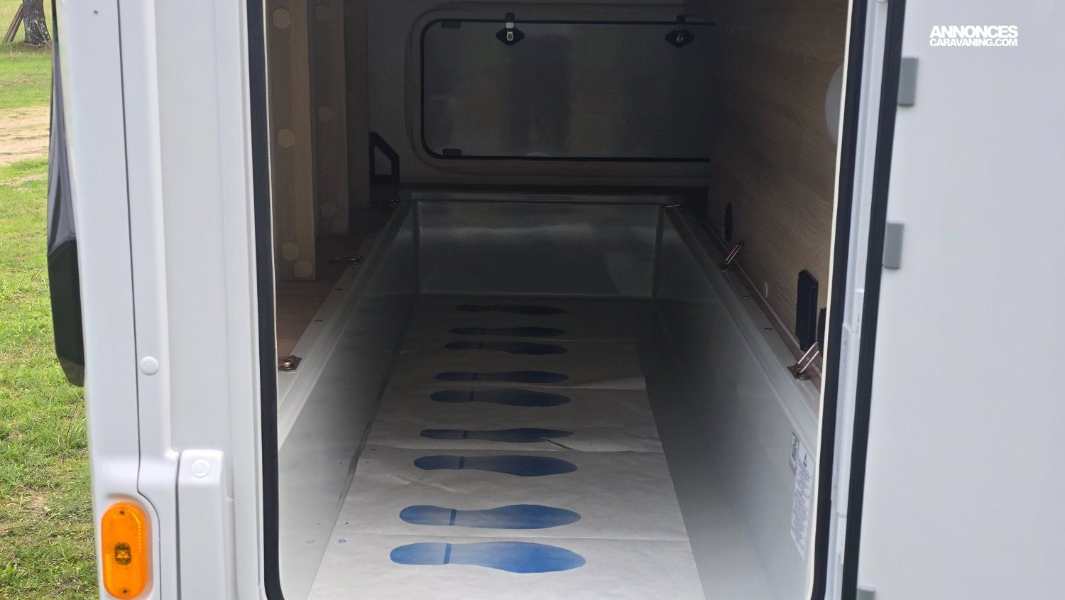 Chambre enfants avec 3 couchages, double penderie, douche séparée, évier inox avec grand plan de travail et réfrigérateur 145L et un grand salon.