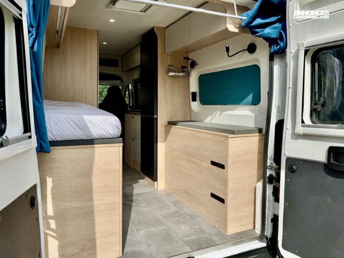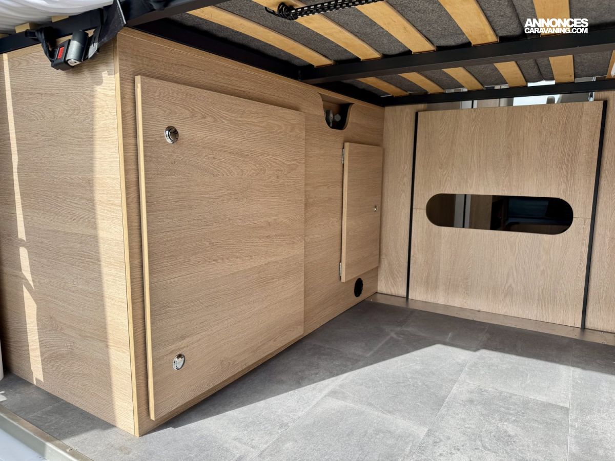 Grand lit double confortable à l’arrière avec sommier et matelas de qualité, rangements en soute sous le couchage.
