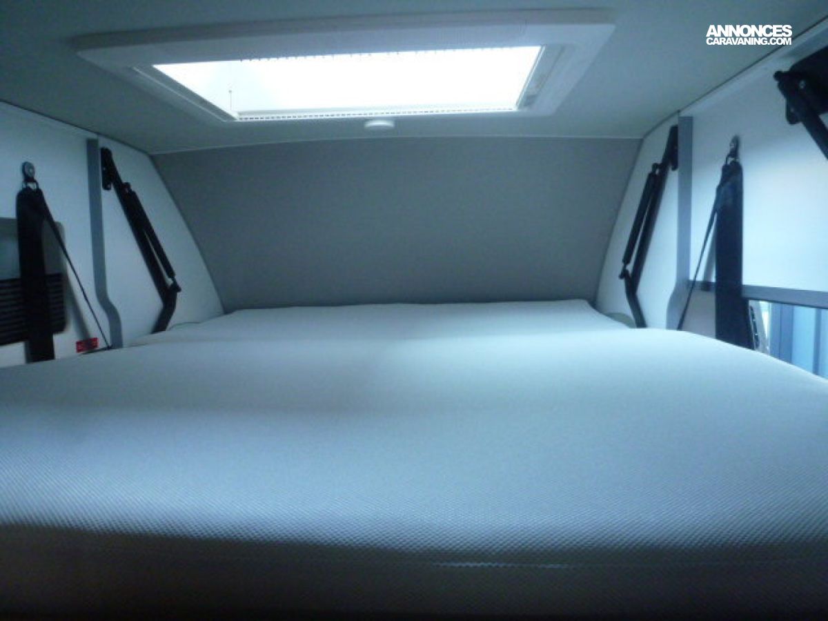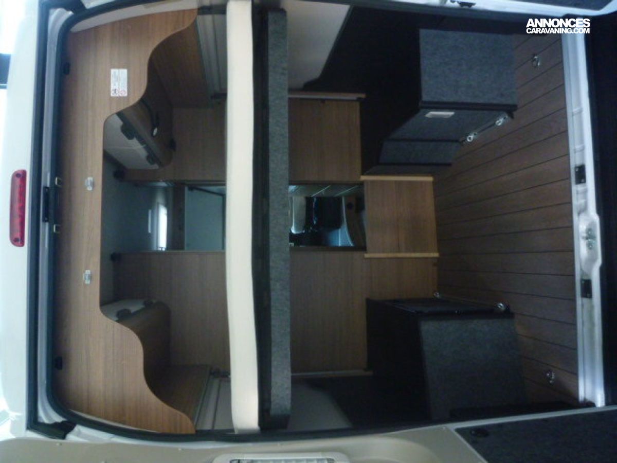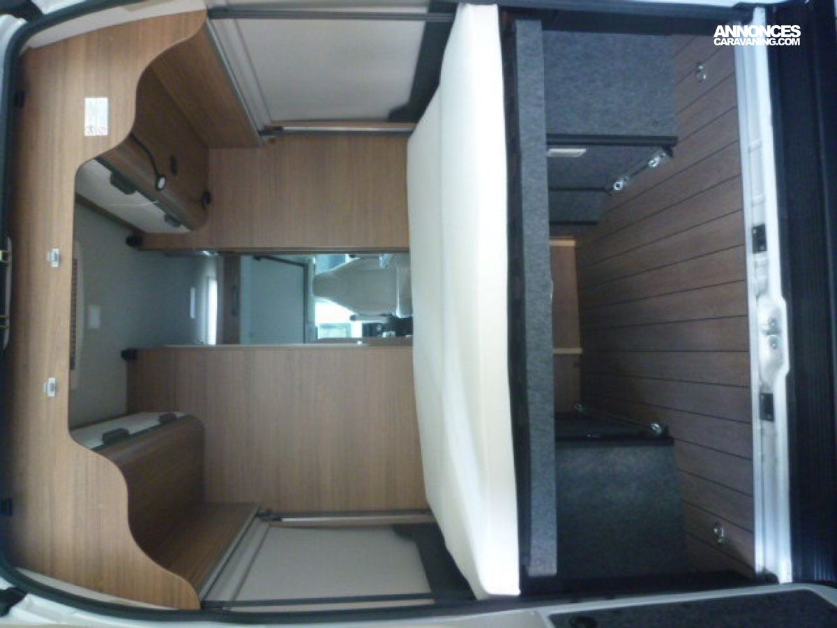 Bac de douche, Cuisine en long, Lit arrière transversal, Lit dînette avant, Salon avant sièges pivotants, Soute réglable en hauteur, WC Cassette.