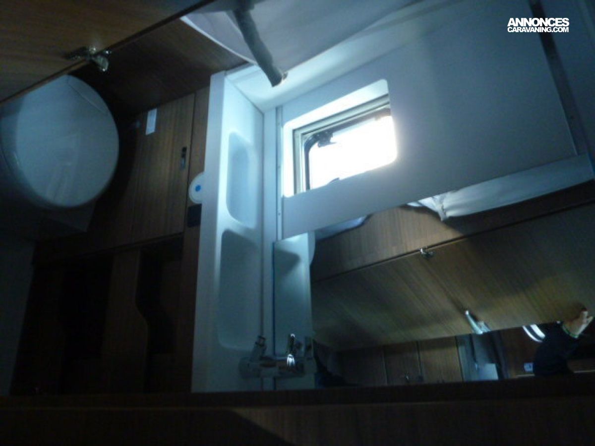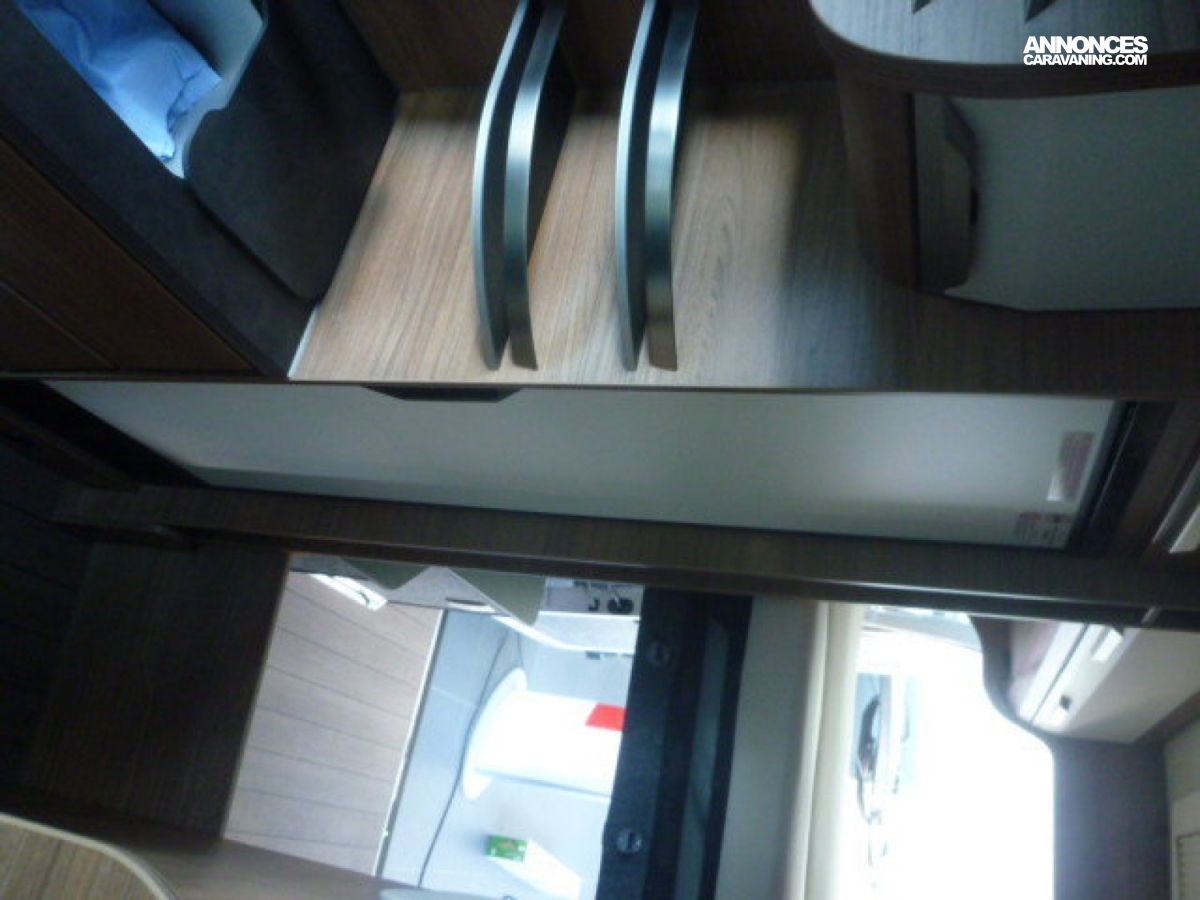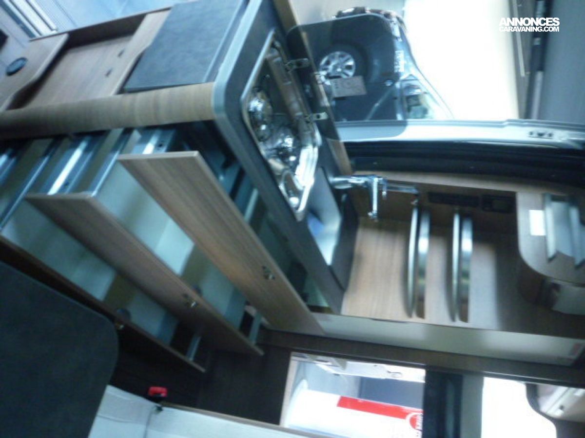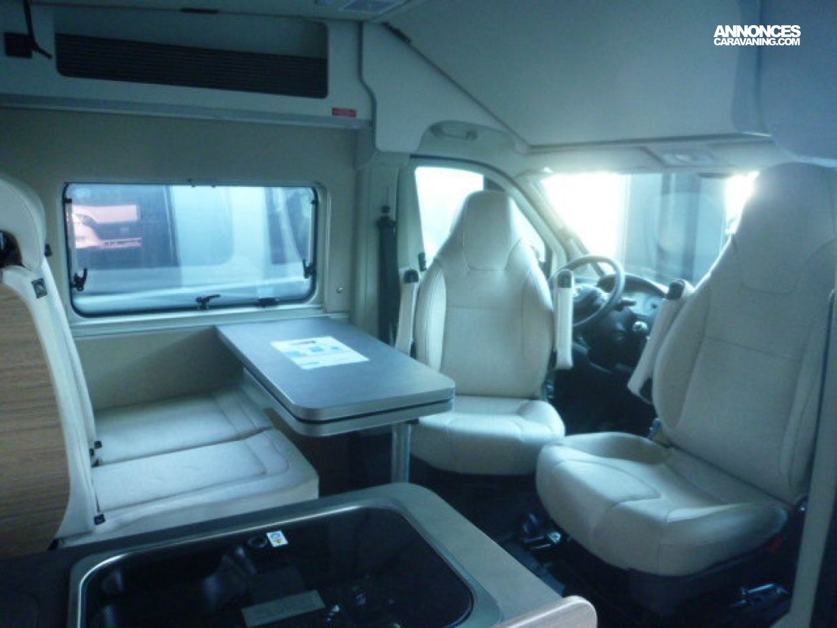 Bac de douche, Cuisine en long, Lit arrière transversal, Lit dînette avant, Salon avant sièges pivotants, Soute réglable en hauteur, WC Cassette.