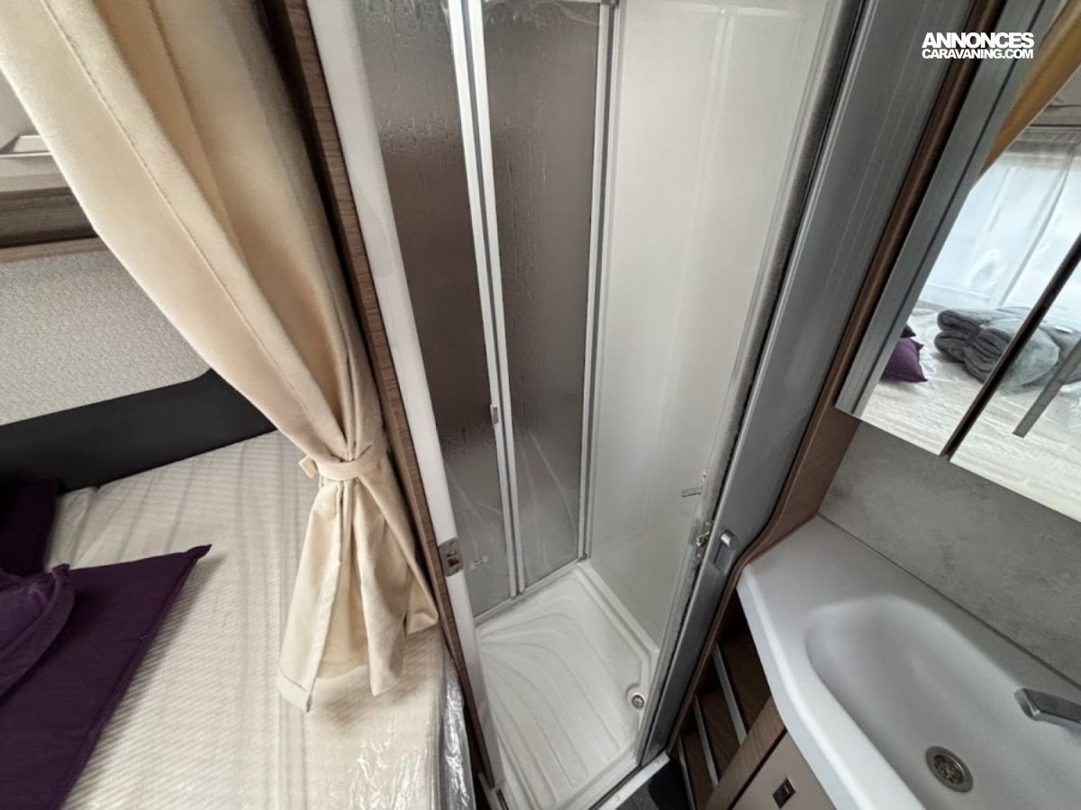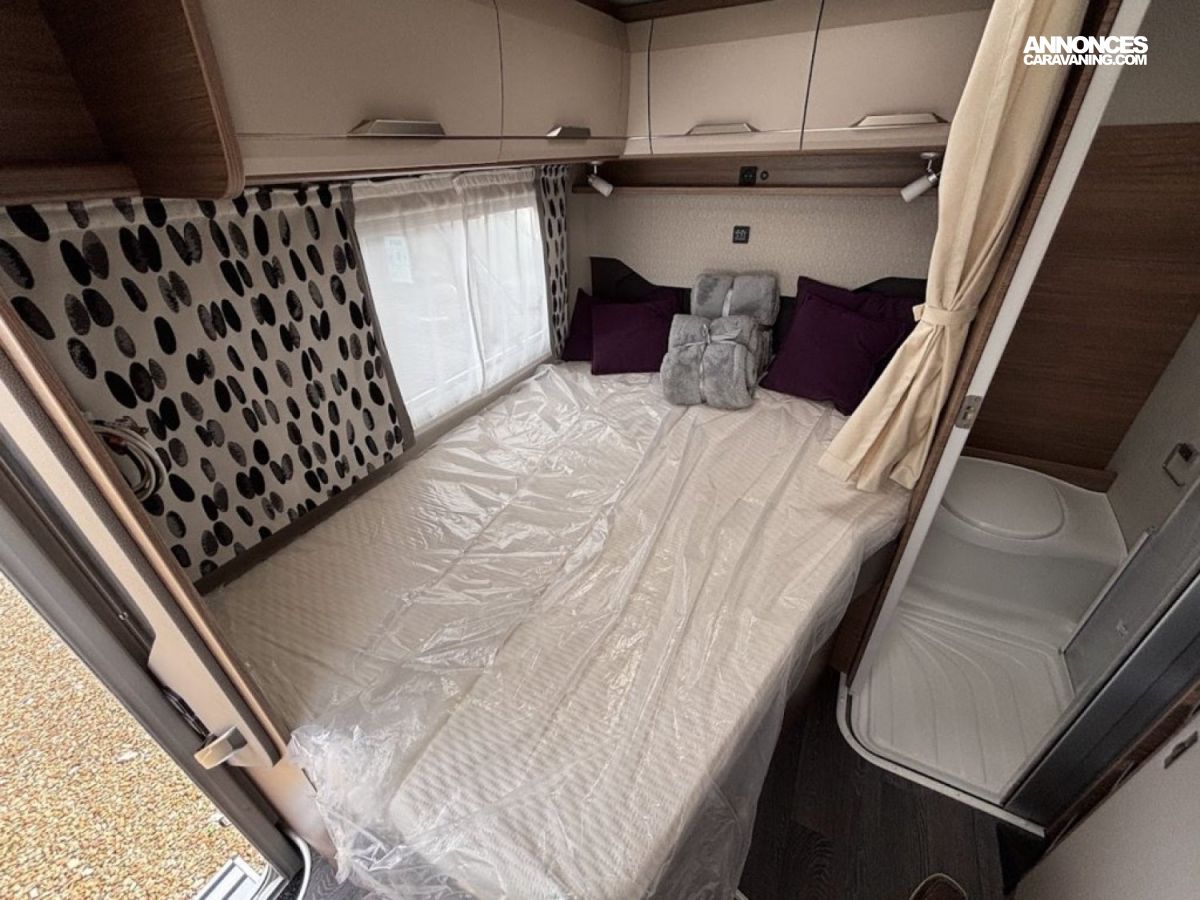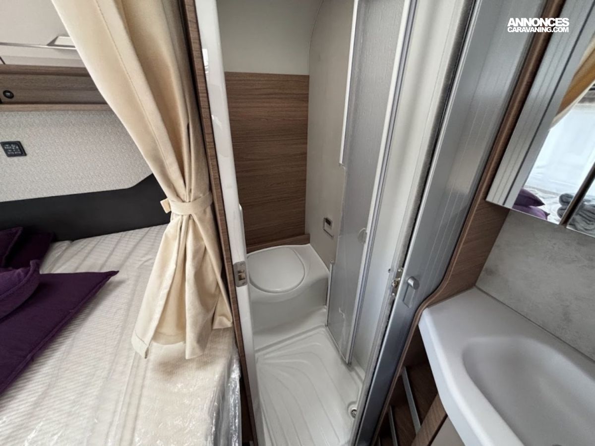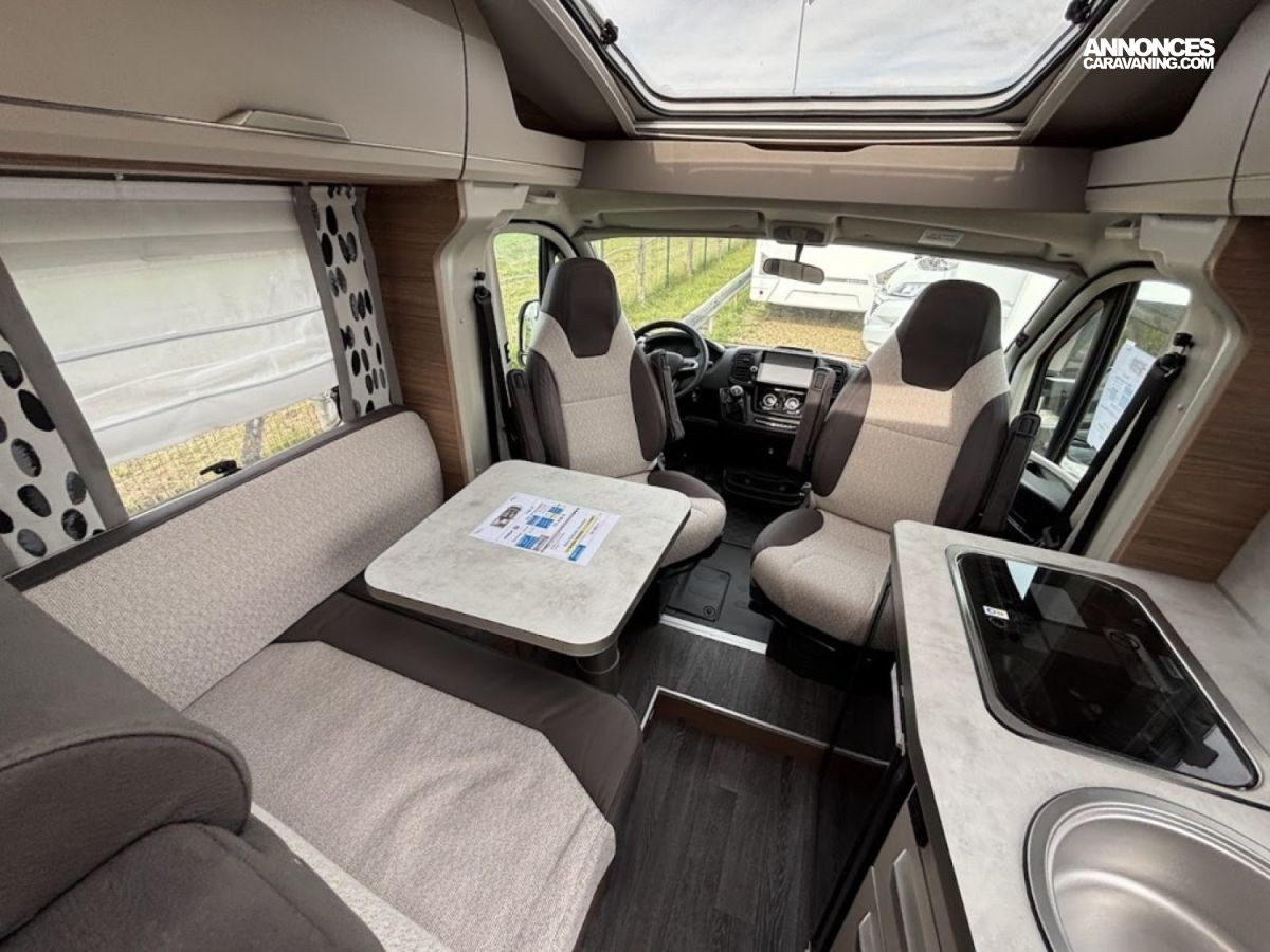 Bac de douche, Cuisine en long, Lit à la Française, Lit dînette avant, Salon avant sièges pivotants, Soute, WC Cassette.