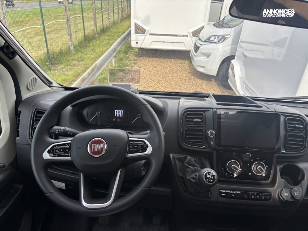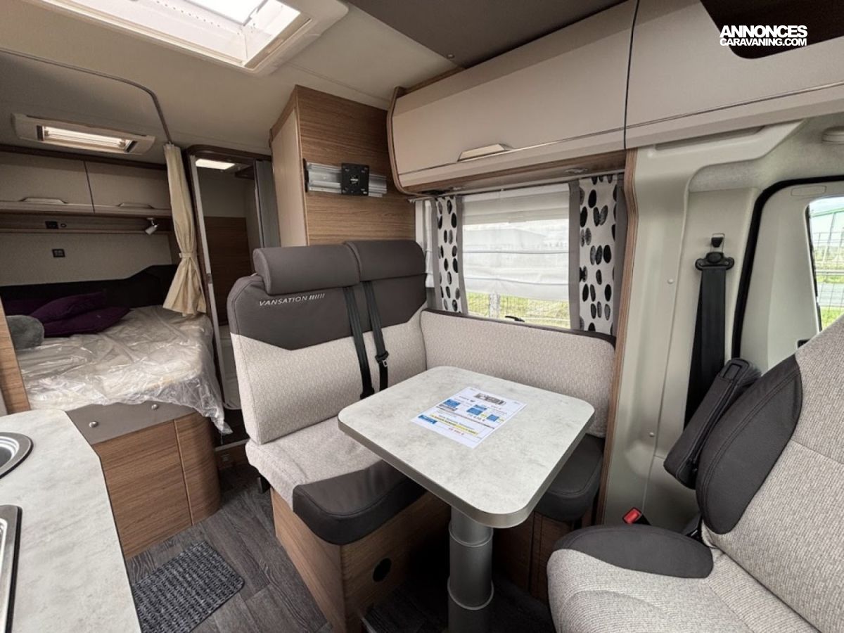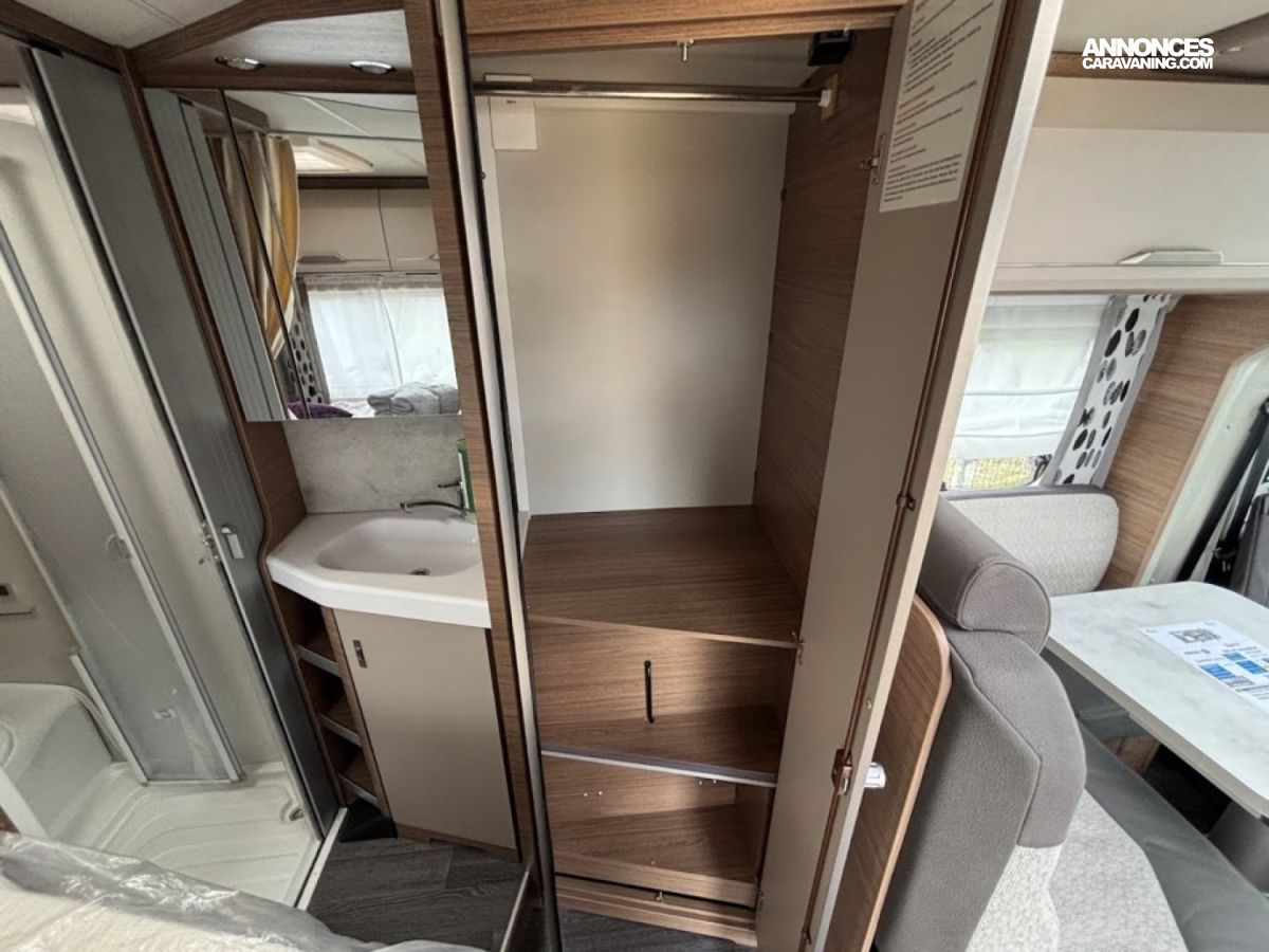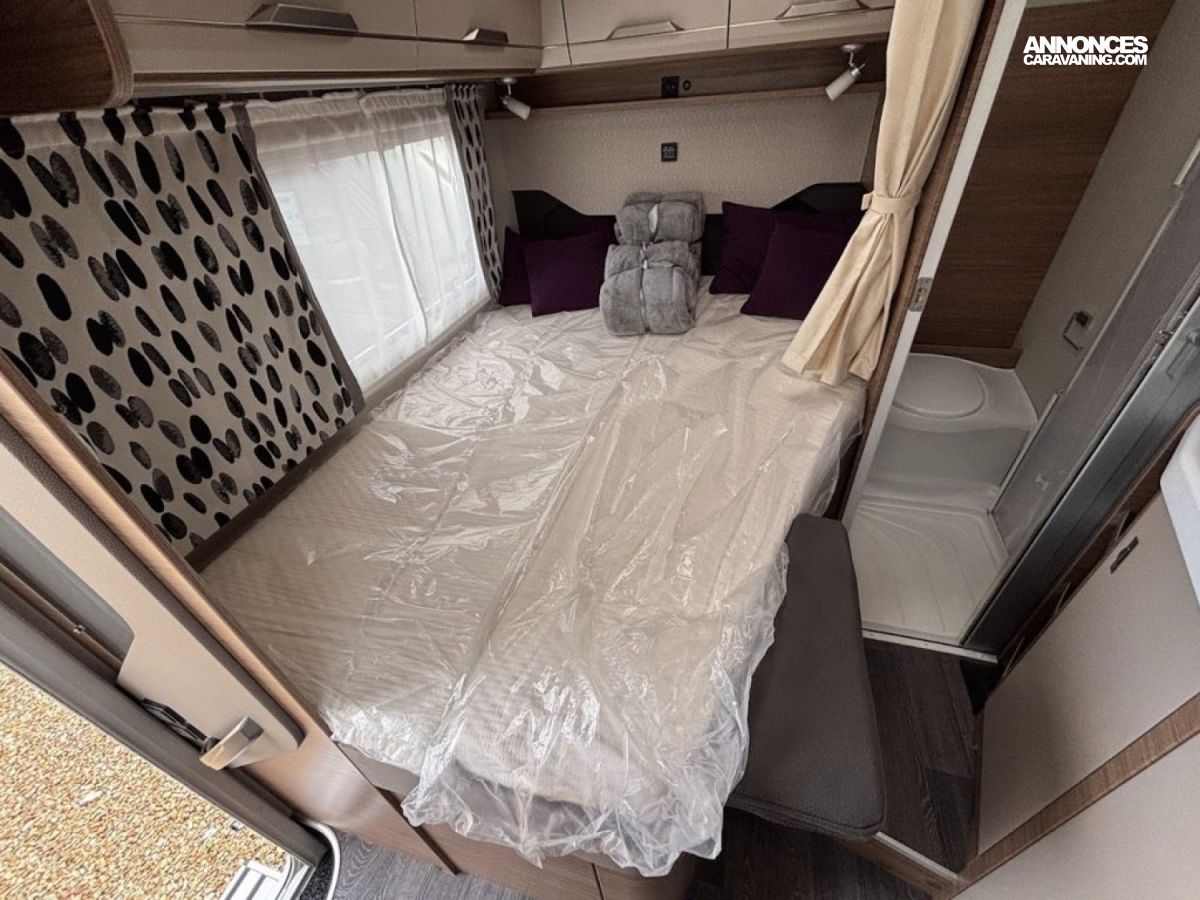 Bac de douche, Cuisine en long, Lit à la Française, Lit dînette avant, Salon avant sièges pivotants, Soute, WC Cassette.