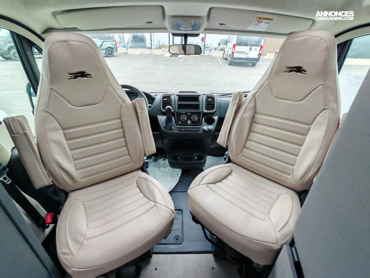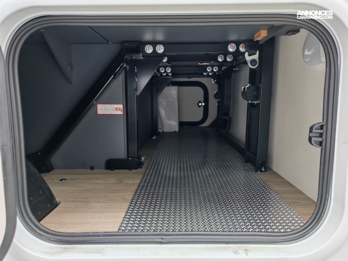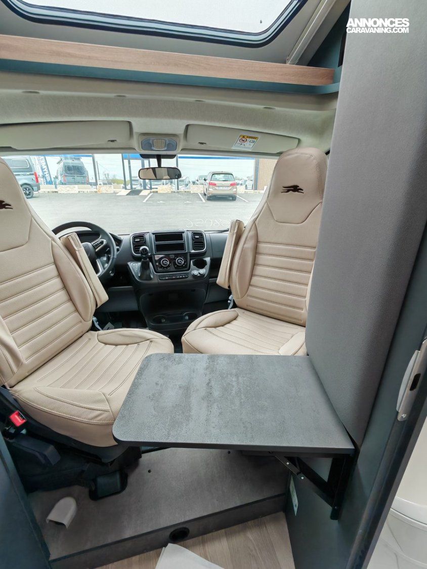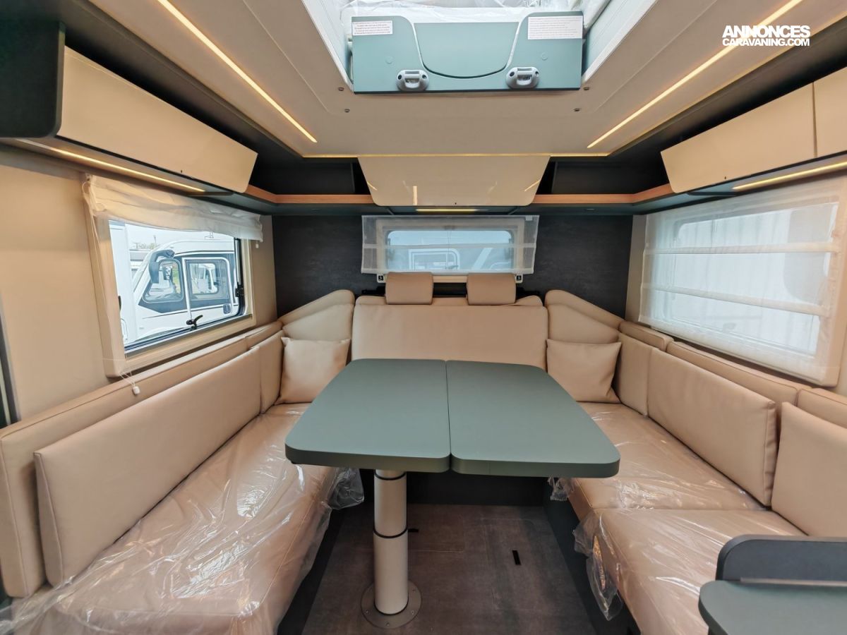 - Pack "One" (réservoir d'eaux usées isolé et chauffé, lanterneau Skyview, hotte aspirante, prédisposition caméra de recul, stores plissés occultants de cabine, prédisposition panneau solaire, caillebotis de douche, tapis de cabine, porte cellule premium XL, habillage des parois de la chambre à coucher arrière en simili-cuir, grand tiroir et porte-bouteille coulissant dans la cuisine),