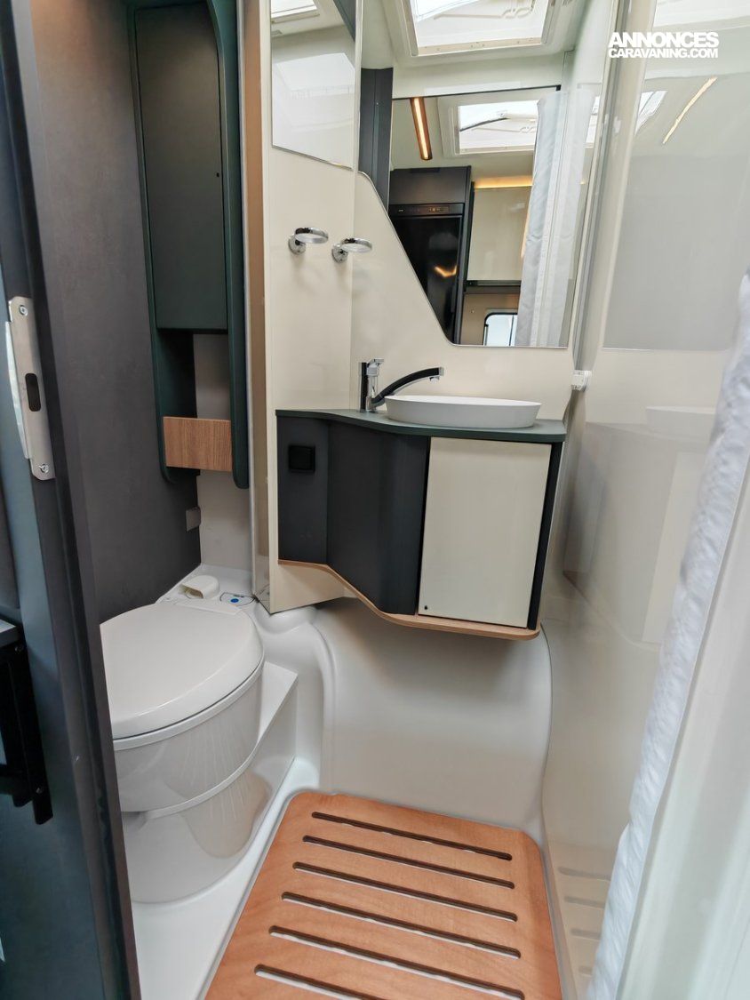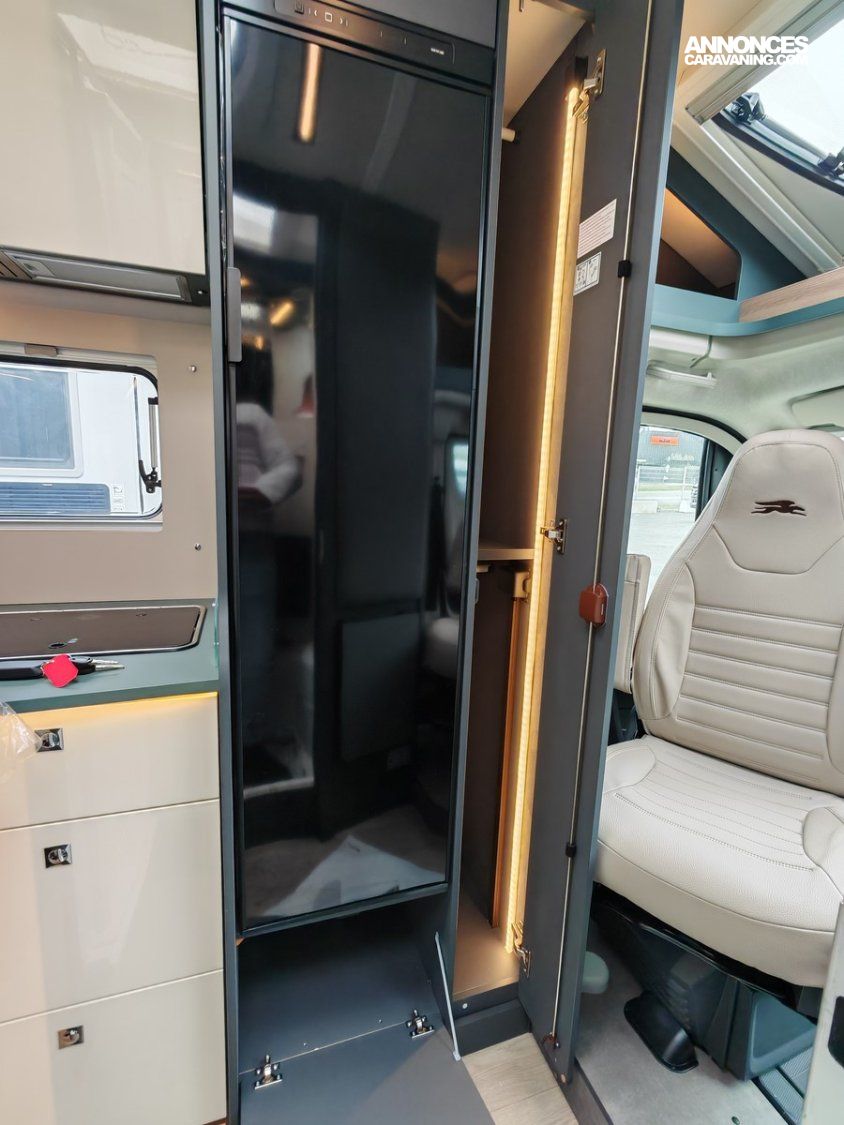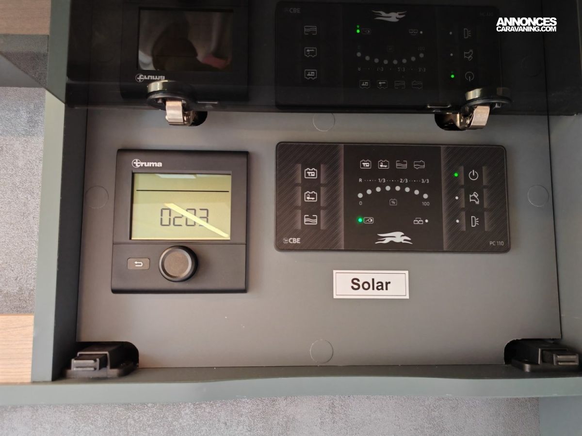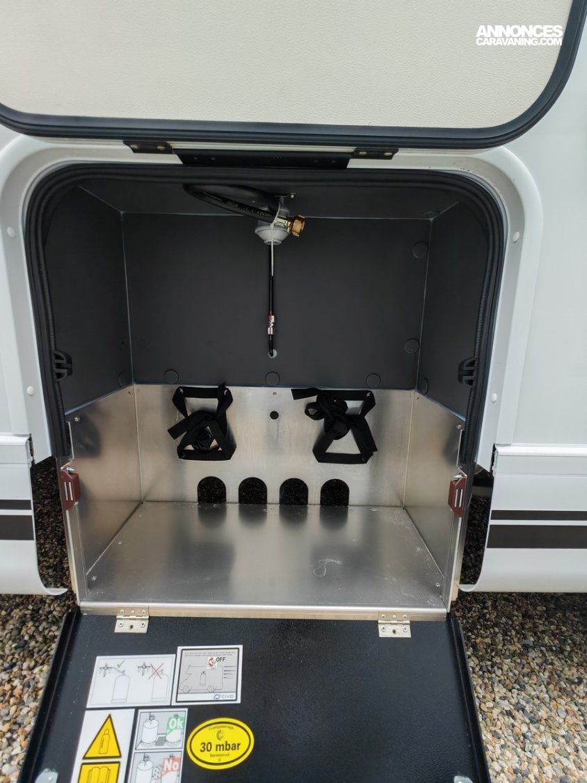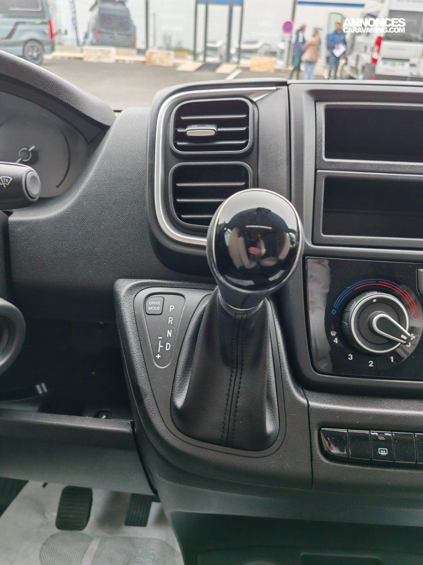 - Pack "One" (réservoir d'eaux usées isolé et chauffé, lanterneau Skyview, hotte aspirante, prédisposition caméra de recul, stores plissés occultants de cabine, prédisposition panneau solaire, caillebotis de douche, tapis de cabine, porte cellule premium XL, habillage des parois de la chambre à coucher arrière en simili-cuir, grand tiroir et porte-bouteille coulissant dans la cuisine),