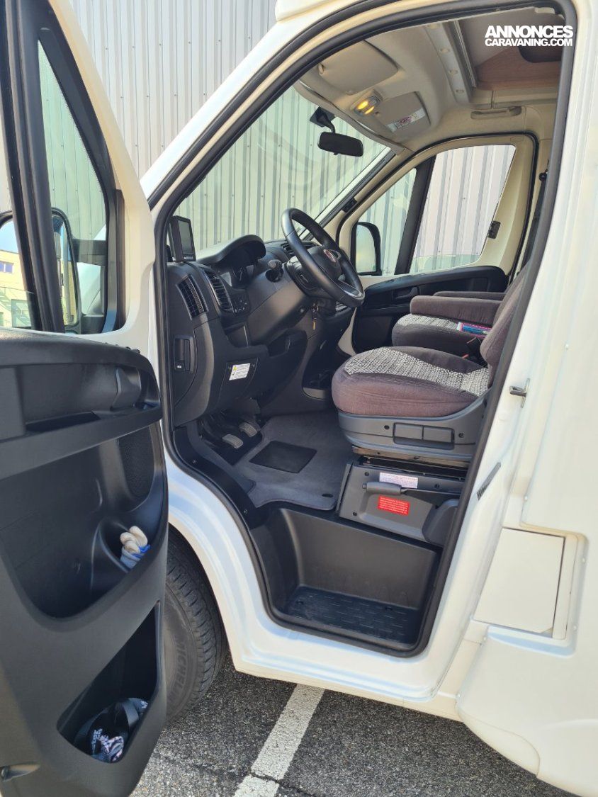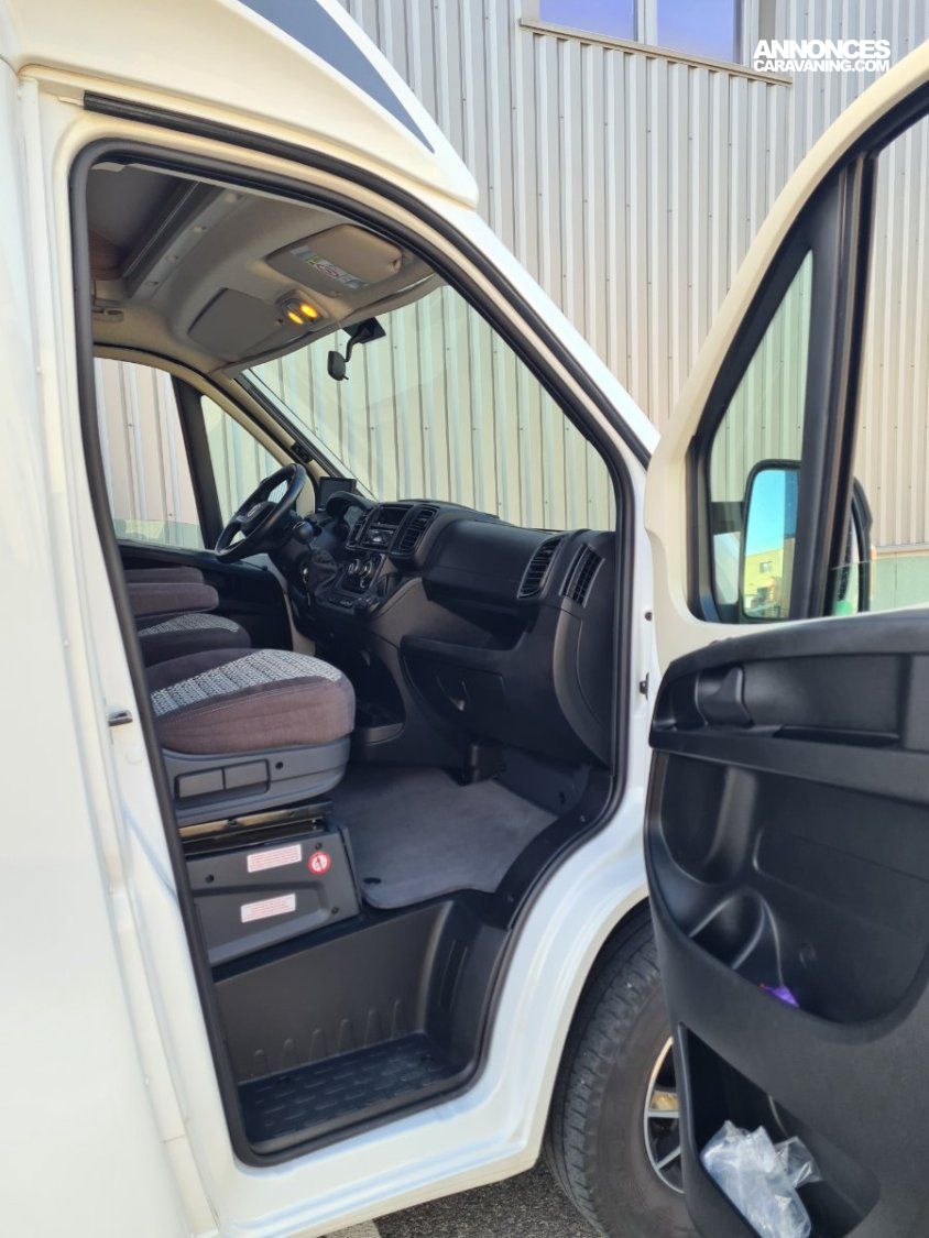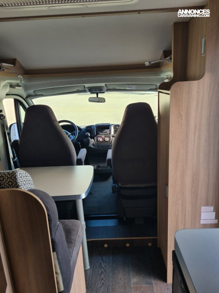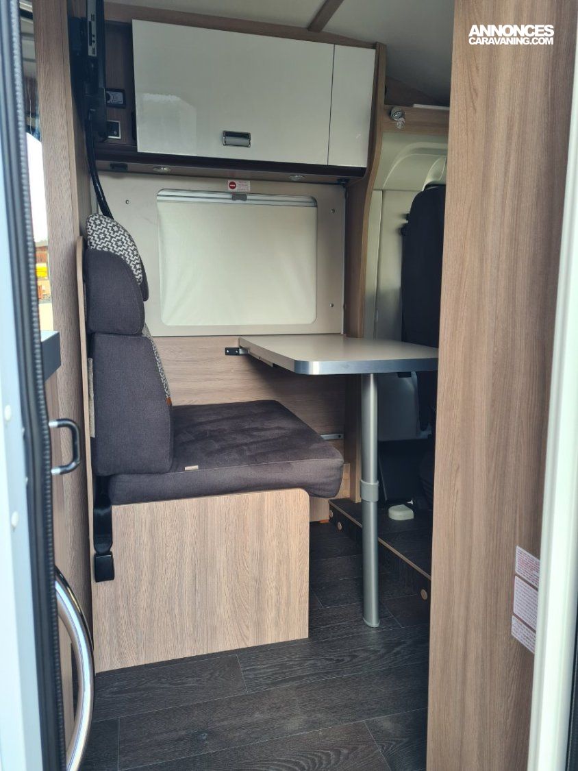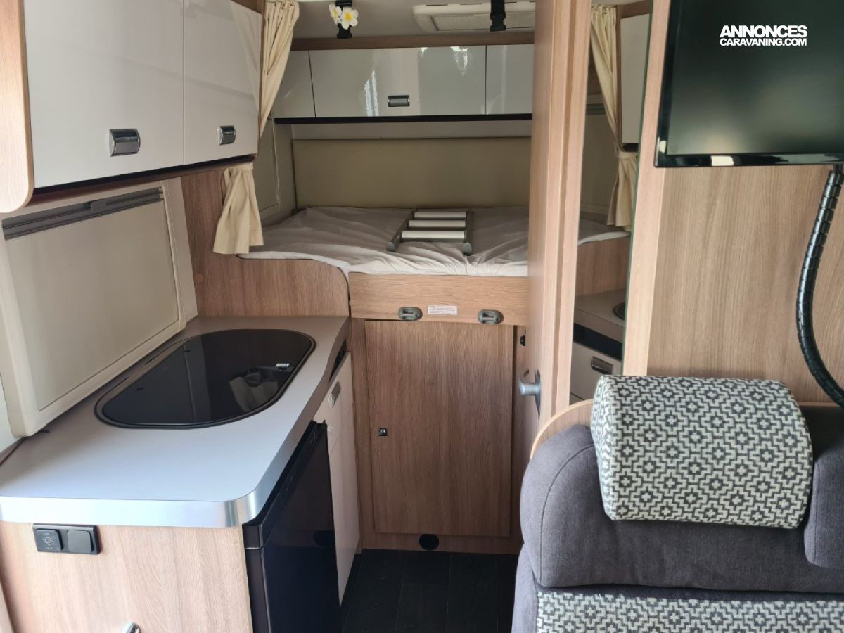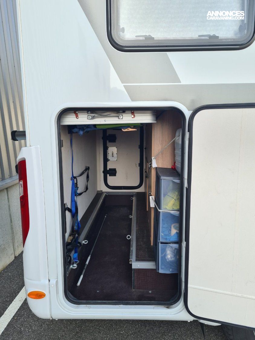 Lit transversal sur grande soute traversante - Douche avec WC séparé par une paroi rigide - Plaque de cuisson 3 feux gaz - réfrigérateur - Chauffage et chauffe-eau Truma gaz - Stores cabine Remi - Store banne - Panneau solaire - TV - Porte vélos pour vélos électriques -