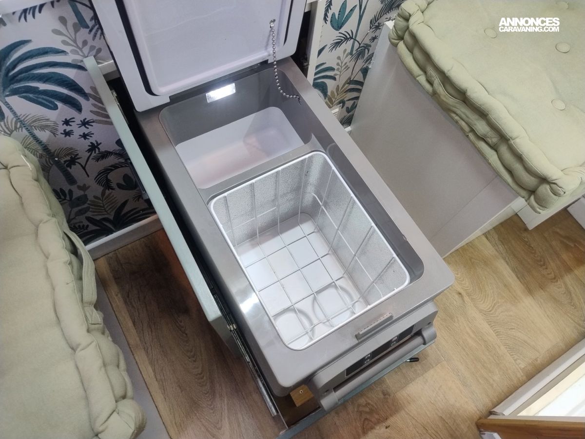 À l’intérieur, le temps ralentit. La lumière glisse sur le bois, et l’on imagine déjà la vapeur douce d’une douche chaude après une journée au grand air. Le chauffage carburant murmure les soirs d’hiver, transformant chaque halte en refuge. Dans la cuisine compacte mais inspirée, la plaque gaz un feu s’allume pour un café au lever du soleil, tandis que le chauffe-eau au gaz assure le confort simple et essentiel. La glacière 12 V de 55 litres garde au frais les fruits d’un marché local, une bouteille partagée face au paysage.
