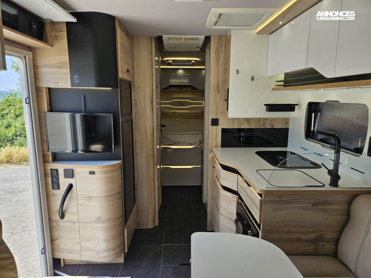 CHAUFFAGE CENTRAL ALDE, REFRIGERATEUR/CONGELATEUR, STORE EXTERIEUR 5M, EAUX USEES ELECTRIQUE, CLIMATISATION CELLULE 220V, GAZINIERE 2 FEUX, TIROIRS FERMETURE RALENTIE, SELLERIE CUIR, DOUCHETTE DANS SOUTE, DOUCHE ET WC SEPARES, ECLAIRAGE LED, EXTRACTEUR D'AIR, FOUR A GAZ, MOQUETTE CABINE, MOUSTIQUAIRE DE PORTE CELLULE, REFRIGERATEUR 150L, REFRIGERATEUR TRI MIX, RESERVOIRS D EAUX ISOLES ET CHAUFFES, SECHE SERVIETTE, STORES PLISSES DE CABINE, VOLET AVANT ELECTRIQUE, SIEGE AGUTI, DOUBLE CLOISON DE SEPARATION, SALON FACE A FACE, STORE EXTERIEUR ELECTRIQUE, RESERVOIR EAUX USEES HORS GEL, LANTERNEAU PANORAMIQUE, PORTE CELLULE XL (passage 645mm), CLIMATISATION CELLULE REVERSIBLE