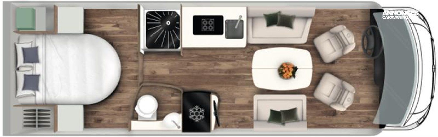 Caméra de recul grand angle, Douchette eau froide/eau chaude, Feux routes & diurnes à LED, Lit de pavillon manuel, Moquette noire en cabine, Panneau de contrôle tactile 7", Projecteurs antibrouillard avant, Jantes alu 16" noires, Volant et pommeau de levier de vitesse en cuir, Climatisation manuelle, Combi 6 truma, Detendeur/inverseur automatique, Ressorts de suspension avant renforcés et rehaussés, Réservoir eau propre&eaux usées isolés, Rétroviseurs électriques é dégivrants, Stores d'occultation plissé, Autoradio pioneer 9" GPS