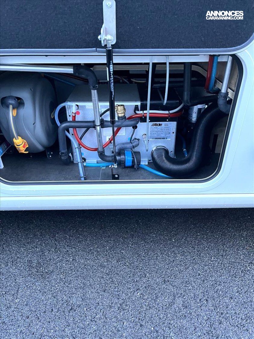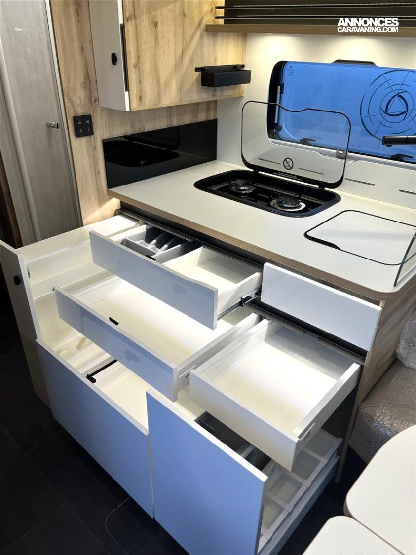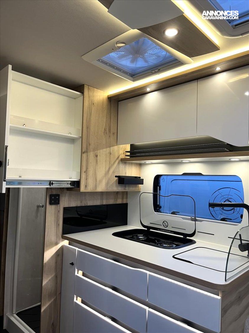 Table rabattable en deux parties avec dessus stratifié blanc, Détendeur/inverseur automatique - Crash Sensor Truma, Tête de lit relevable, Toilettes avec cassette extractible 17 L à roulettes, Autoradio 9" Pioneer GPS FM/DAB AppleCar/Android Auto, Caméra de recul grand angle avec écran 6,1" déporté, Volant et pommeau de levier de vitesse en cuir, Centralisation porte cellule et porte chauffeur, Climatisation manuelle, Jantes aluminium 16” finition noire, Kit réparation roue, Pare-soleil conducteur et passager manuel, Combi 6 Truma® chauffage/boiler 6000 W gaz, Marchepied escamotable électrique sur porte cellule, Moquette noire en cabine, Panneau de contrôle tactile 7'' du véhicule, Sièges chauffeur et passager Aguti, Store d'occultation parebrise avec ouverture intimité, Stores d'occultation plissé pour custodes, Réfrigérateur automatique à double ouverture 133 L, Réservoirs eau propre et eaux usées isolés en double planche, Rétroviseurs électriques et dégivrants, Kit main libre et commandes au volant, Feux routes et diurnes à LED finition intérieure black bezel, Porte cellule luxe XL serrure 2 points vitrée avec moustiqua, Ressorts de suspension avant renforcés et rehaussés