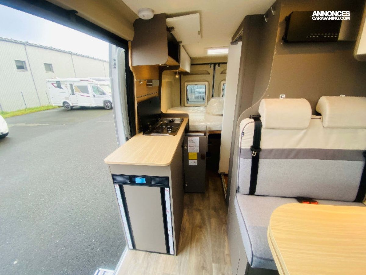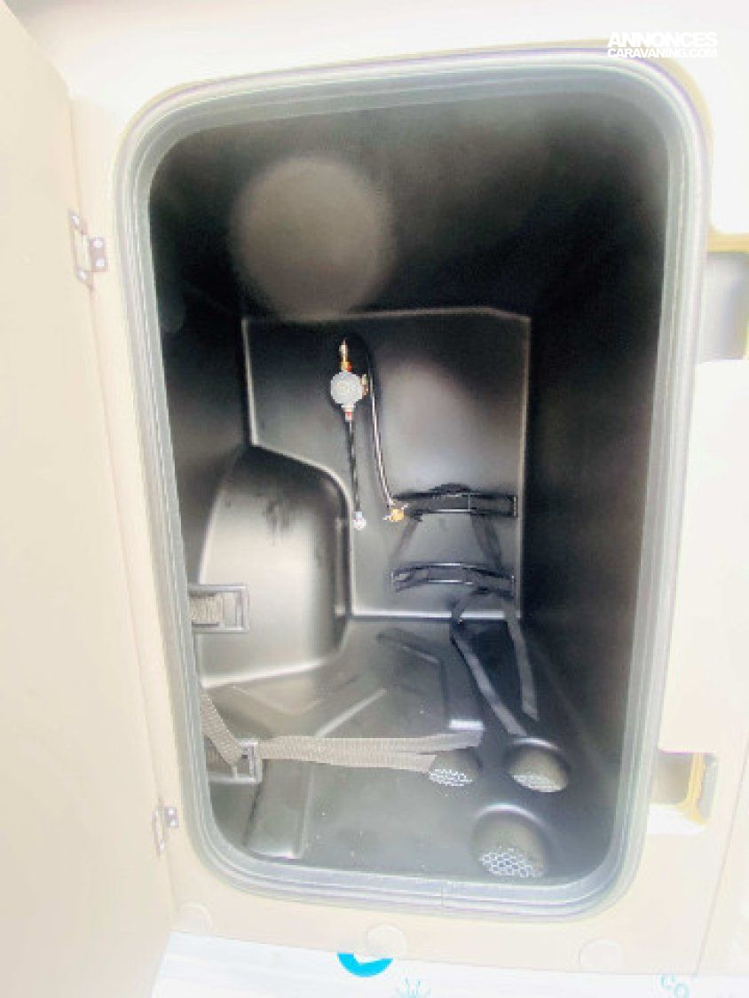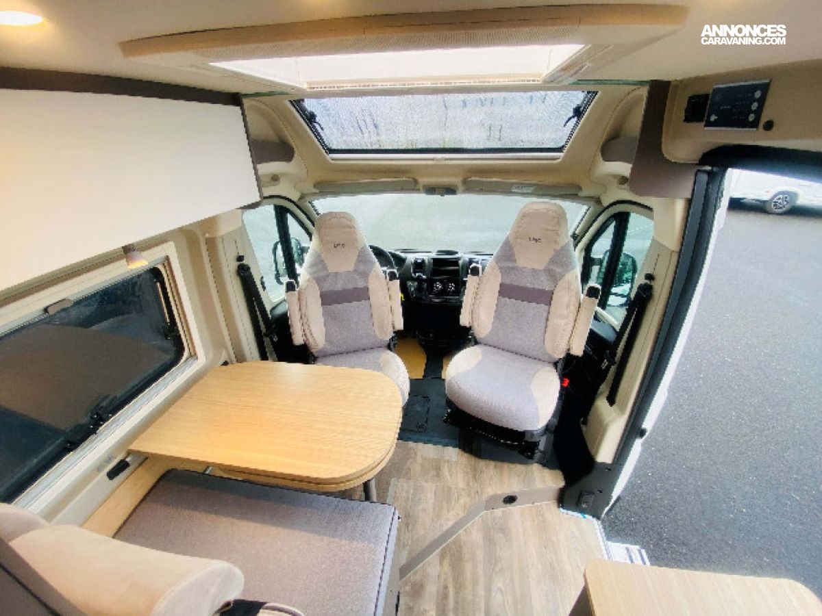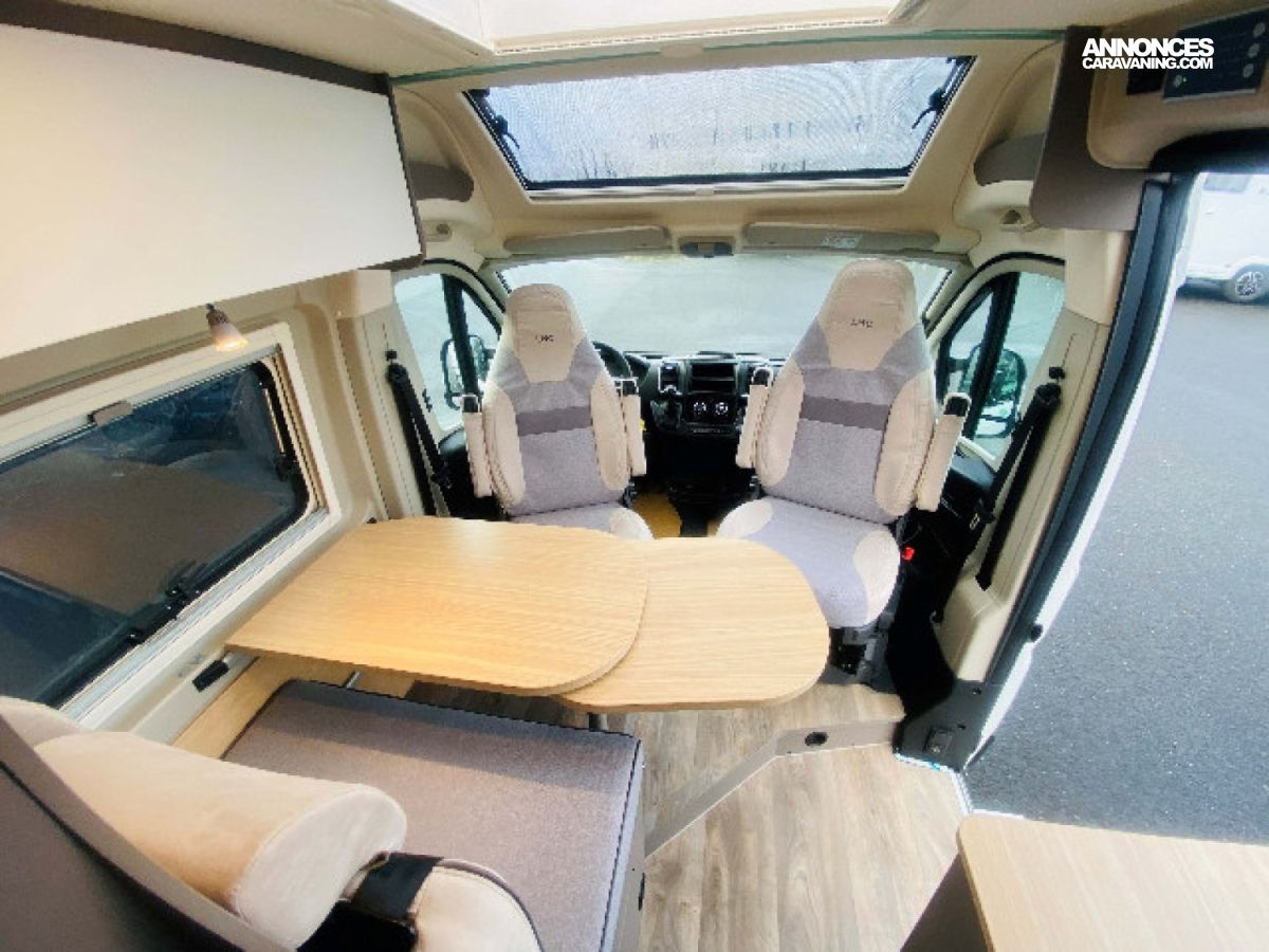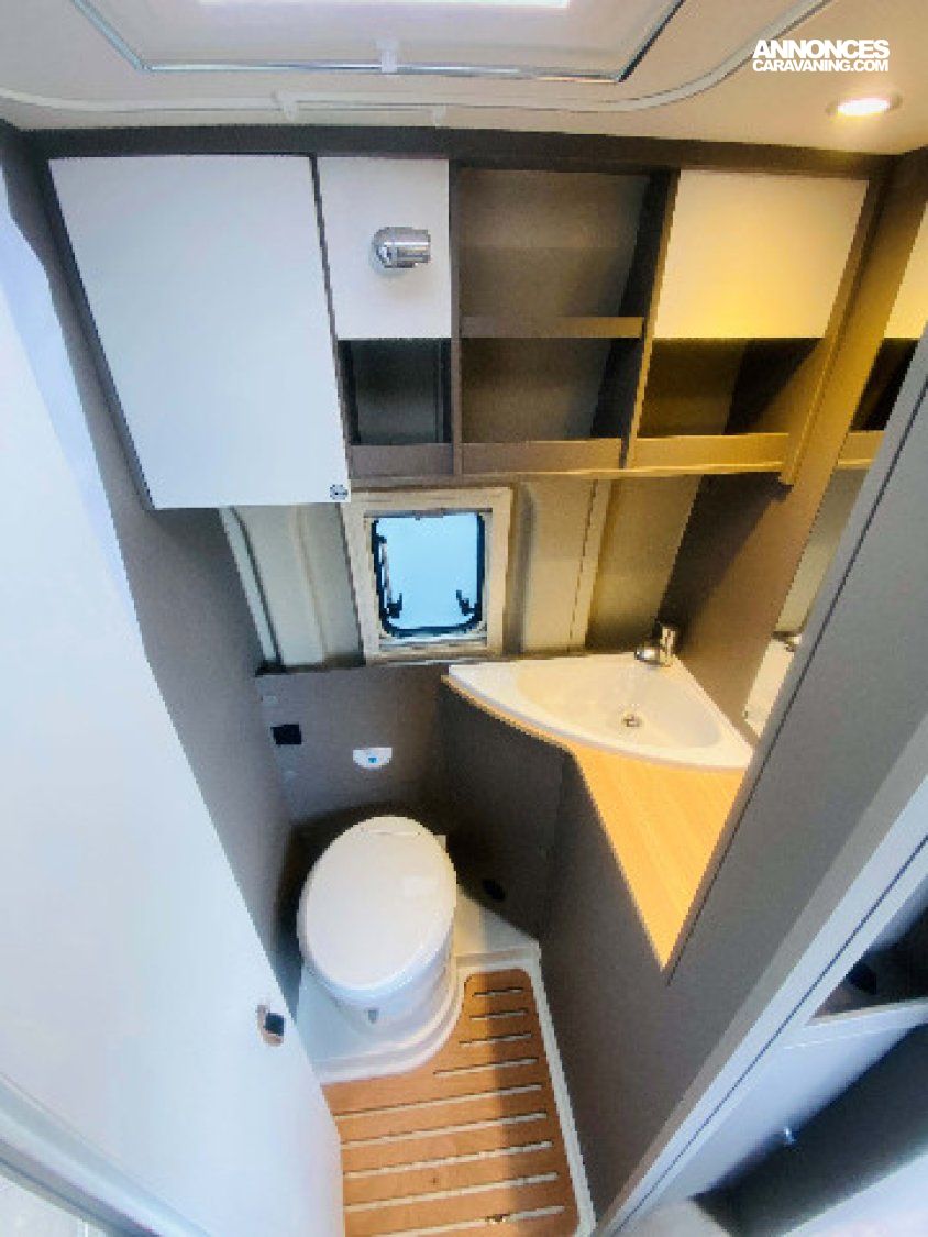 Baie projetante dans la salle d'eau avec store occultant et, Caillebotis de douche en bois, Dînette transformable en couchage, Lanterneau avec verre translucide 700 x 500 mm avec store oc, Marche d'accès extra-large, Porte moustiquaire, Rallonge de table dînette (plateau pivotant), Réservoir eaux usées isolé et chauffé électriquement, Store extérieur coloris anthracite, Stores plissés de cabine