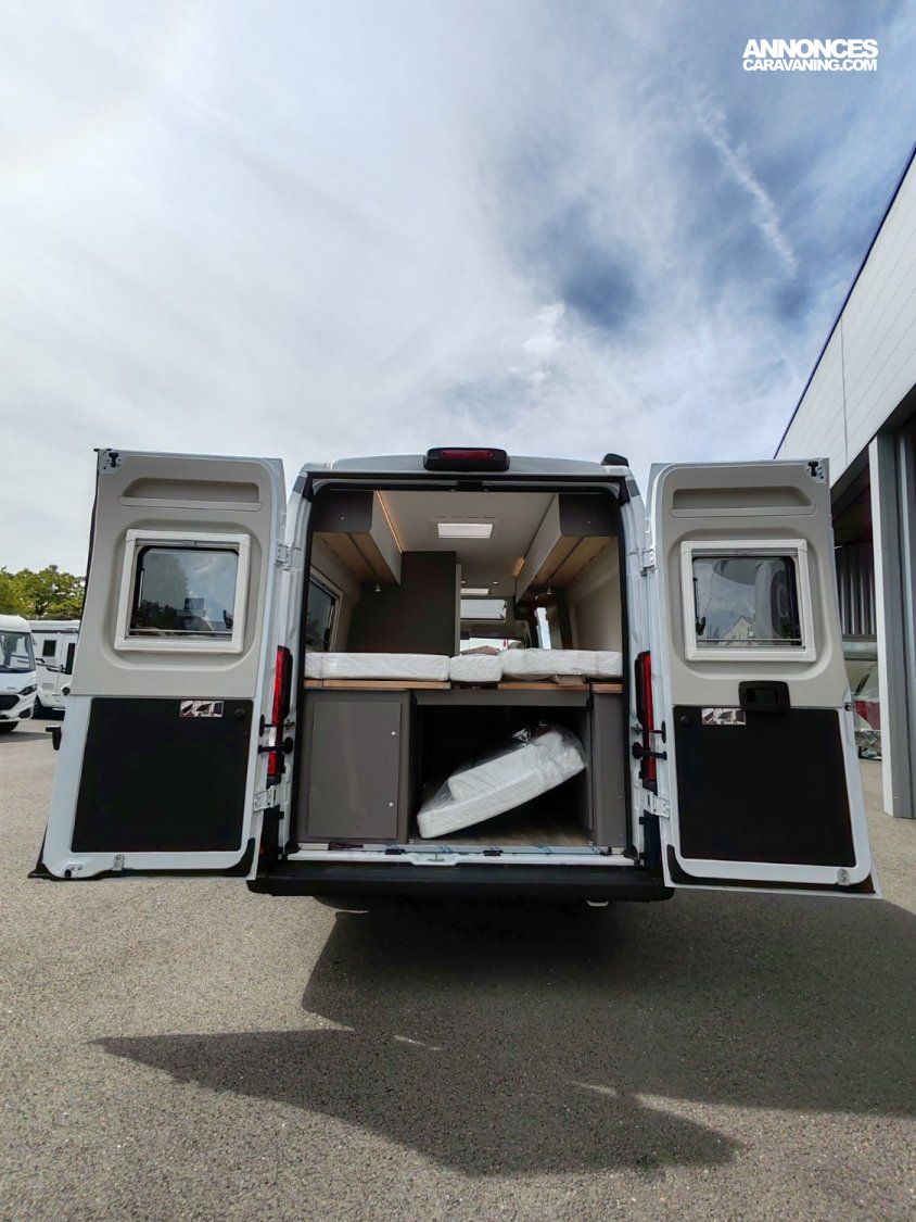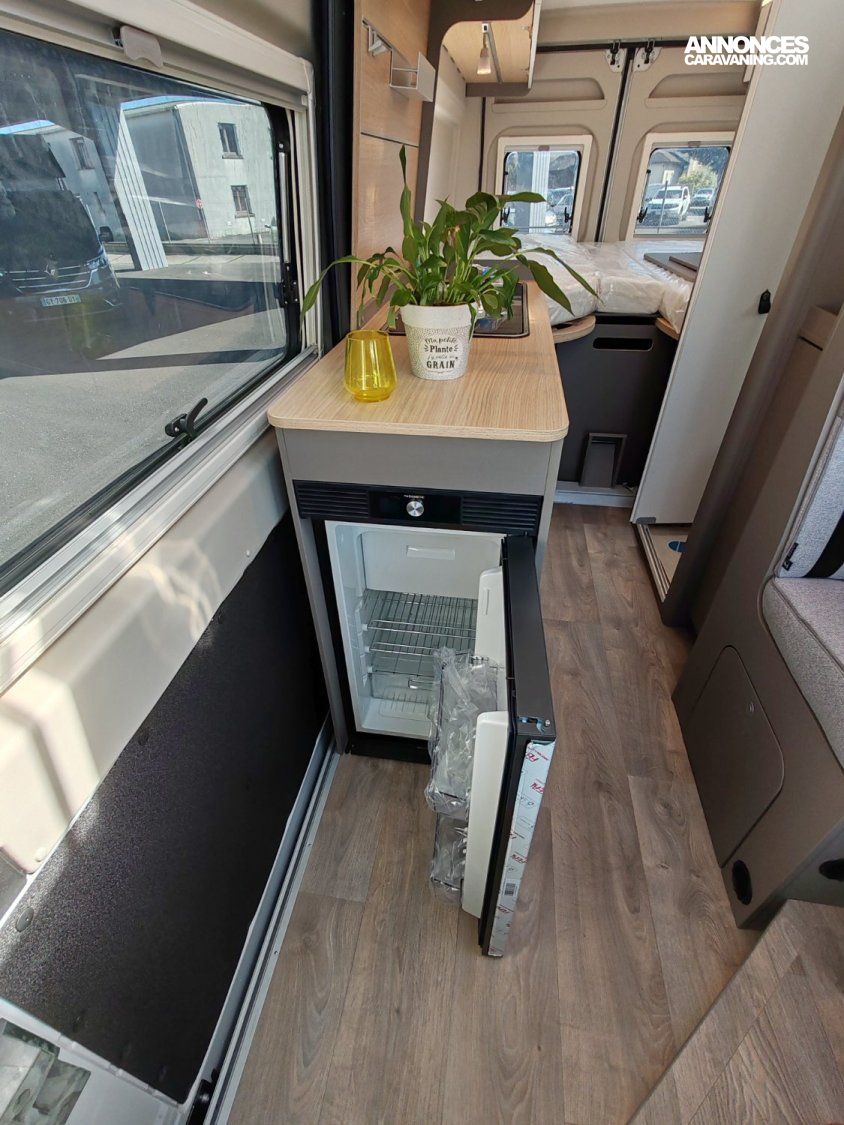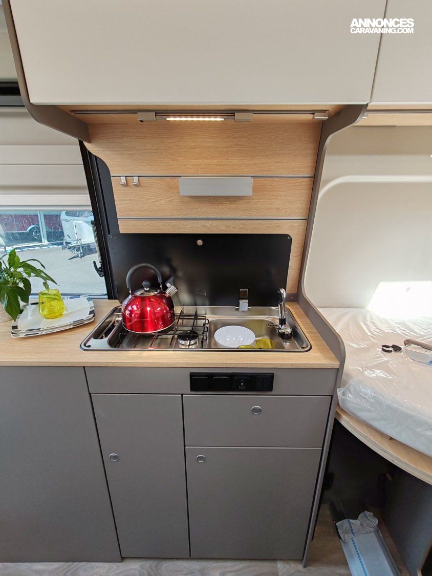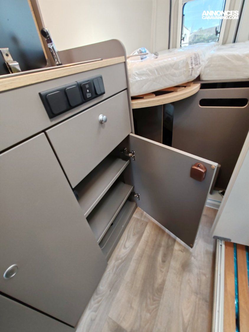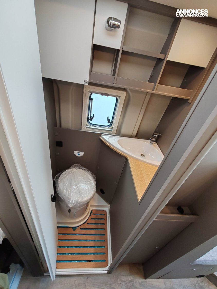 Baie projetante dans la salle d'eau avec store occultant et moustiquaire Séchoir à linge pliable dans cabinet de toilette ou douche Équipement douche (pommeau de douche extractible, rideau de douche, rail de guidage, support pour le pommeau) Réservoir eaux usées isolé et chauffé électriquement (manuel) Dînette transformable en couchage Prédisposition TV Rallonge de table dînette (plateau pivotant) Porte moustiquaire Stores plissés de cabine Lanterneau avec verre translucide 700 x 500 mm avec store occultant et moustiquaire dans le séjour Caillebotis de douche en bois Caméra de recul intégrée dans le troisième feu stop Store extérieur coloris anthracite Marche d'accès extra-large