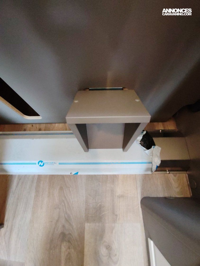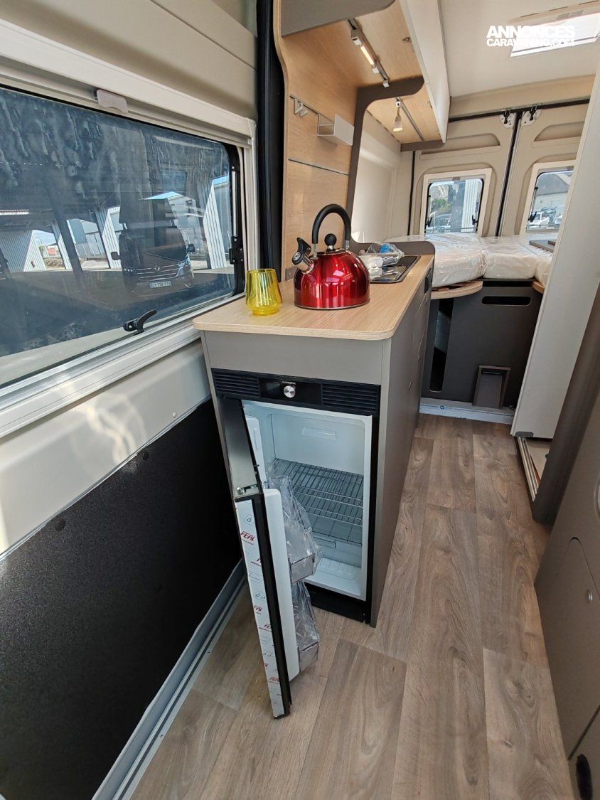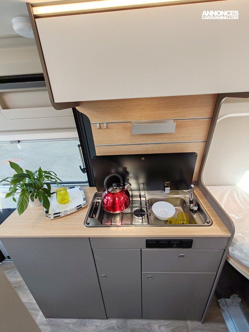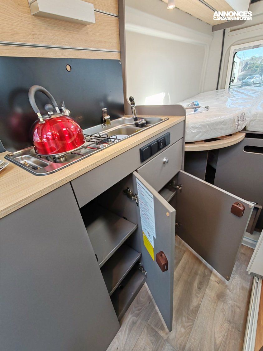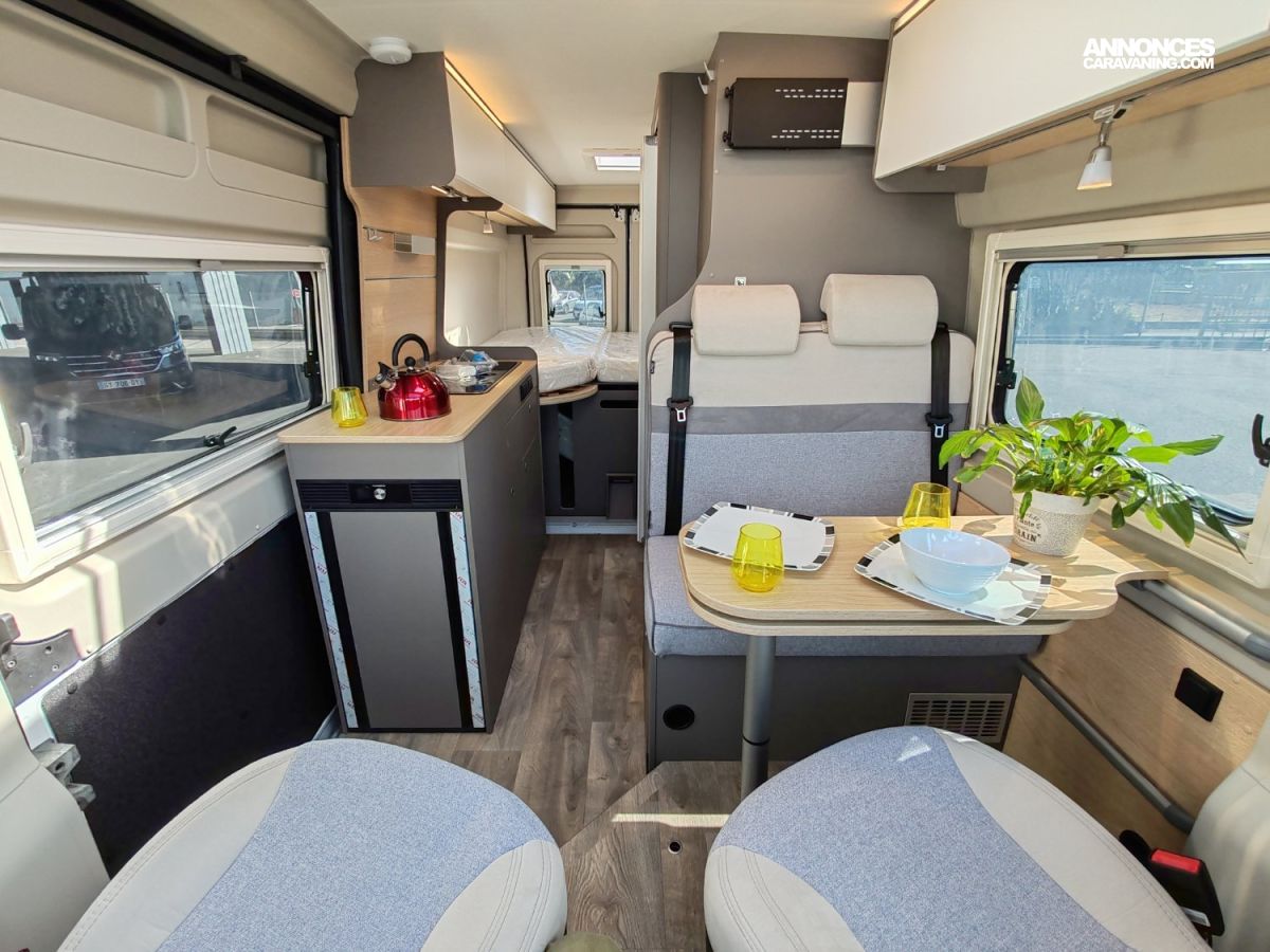 Baie projetante dans la salle d'eau avec store occultant et moustiquaire Séchoir à linge pliable dans cabinet de toilette ou douche Équipement douche (pommeau de douche extractible, rideau de douche, rail de guidage, support pour le pommeau) Réservoir eaux usées isolé et chauffé électriquement (manuel) Dînette transformable en couchage Prédisposition TV Rallonge de table dînette (plateau pivotant) Porte moustiquaire Stores plissés de cabine Lanterneau avec verre translucide 700 x 500 mm avec store occultant et moustiquaire dans le séjour Caillebotis de douche en bois Caméra de recul intégrée dans le troisième feu stop Store extérieur coloris anthracite Marche d'accès extra-large