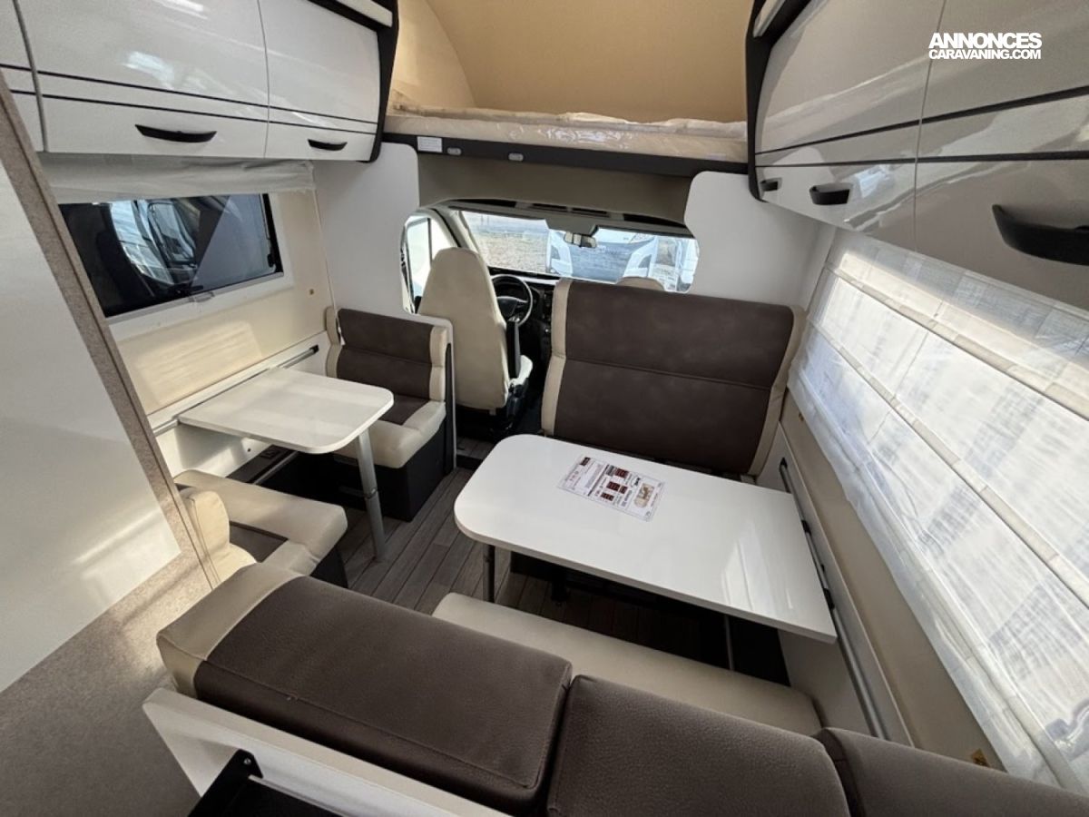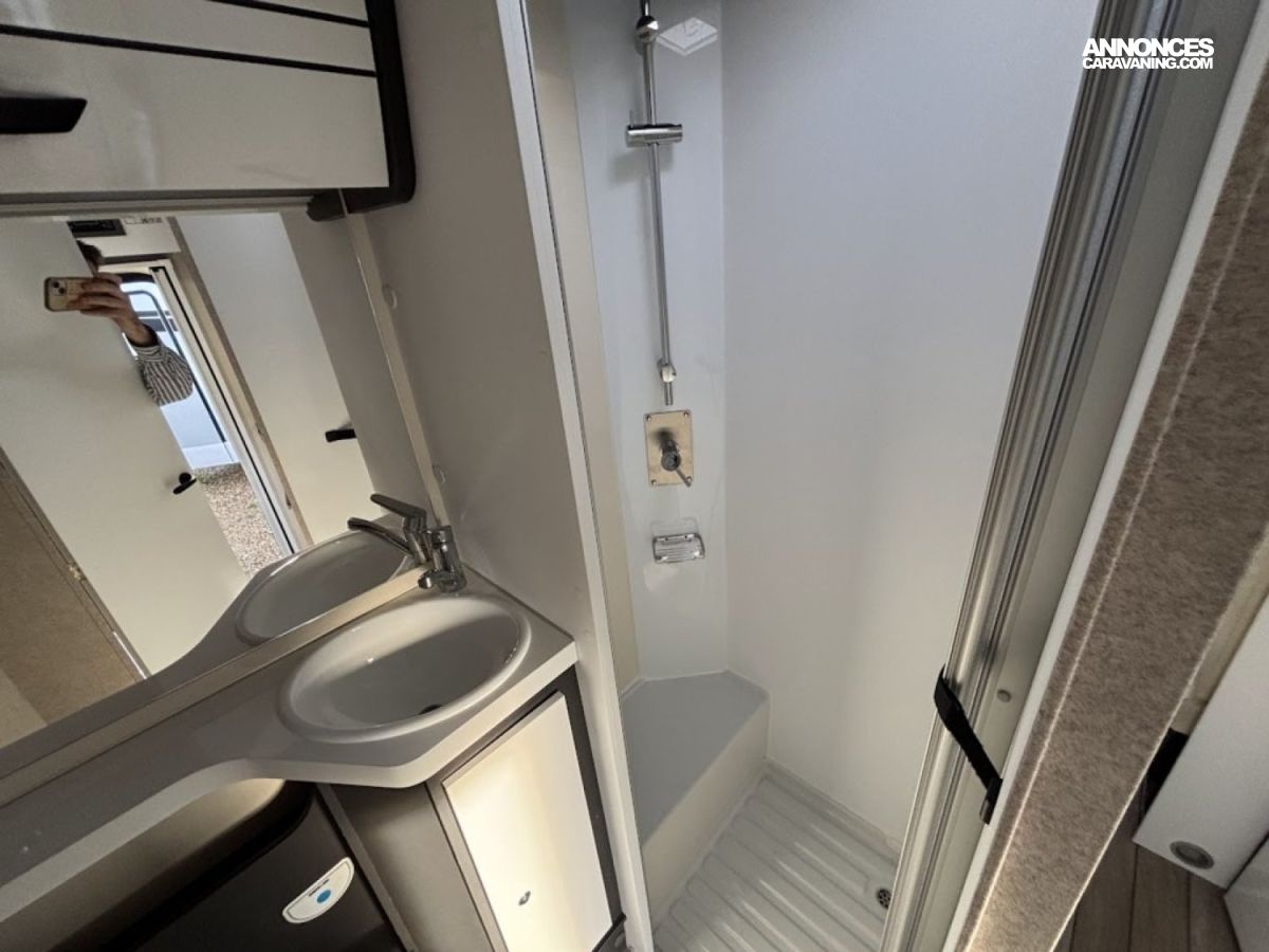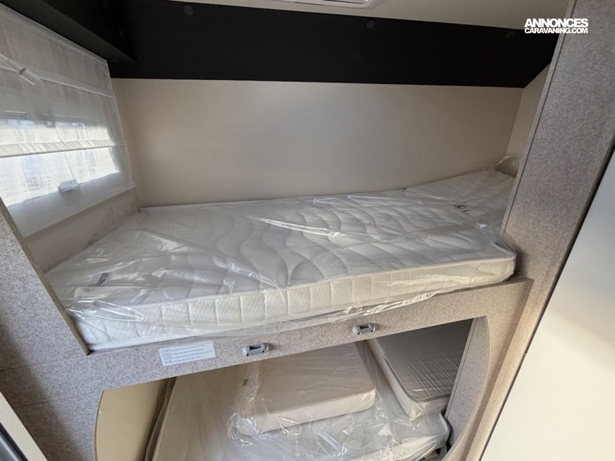 Bac de douche, Cuisine en L, Lit capucine, Lit dînette avant, lit superposés, Salon double dînette avant, Soute, WC Cassette.