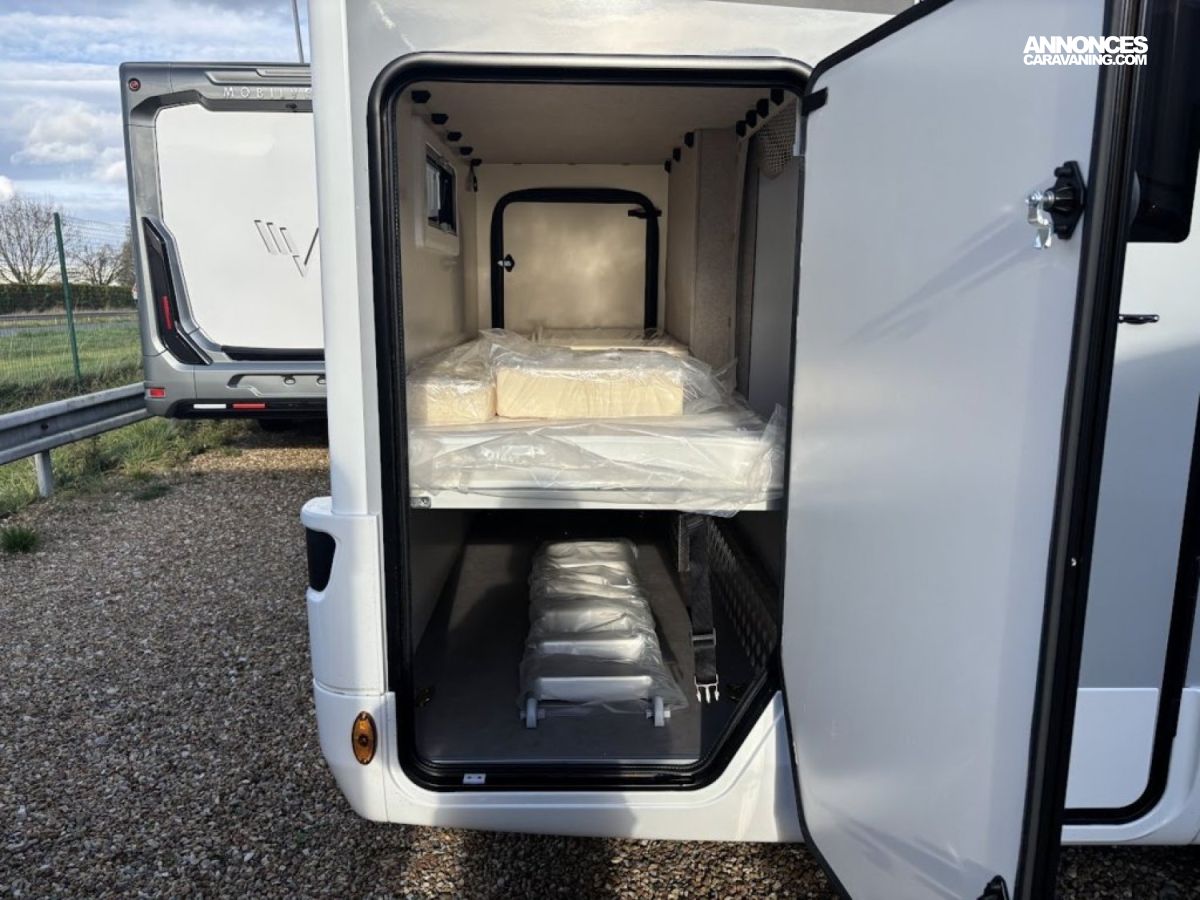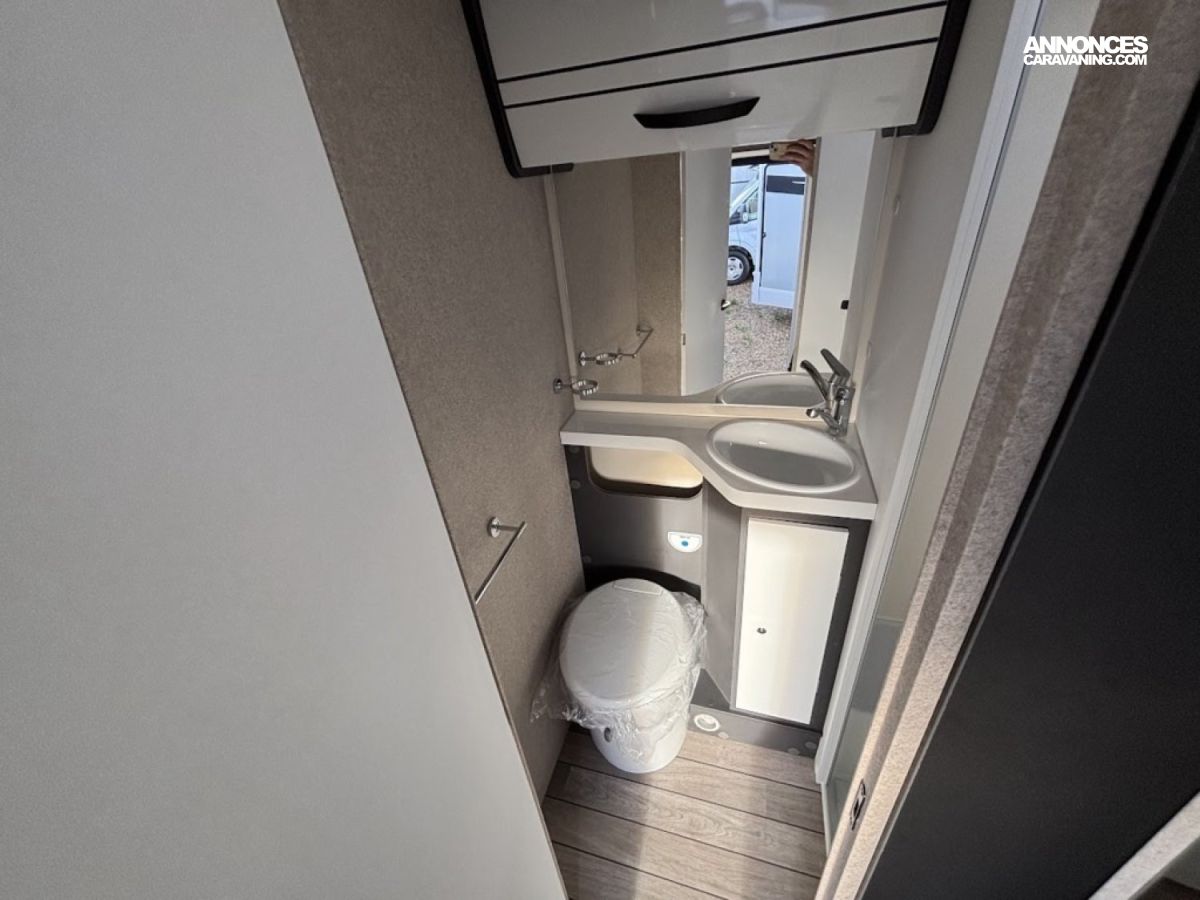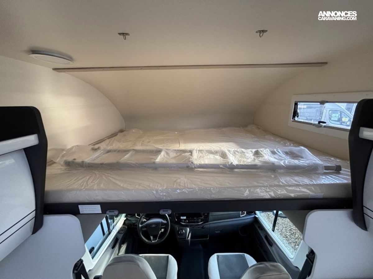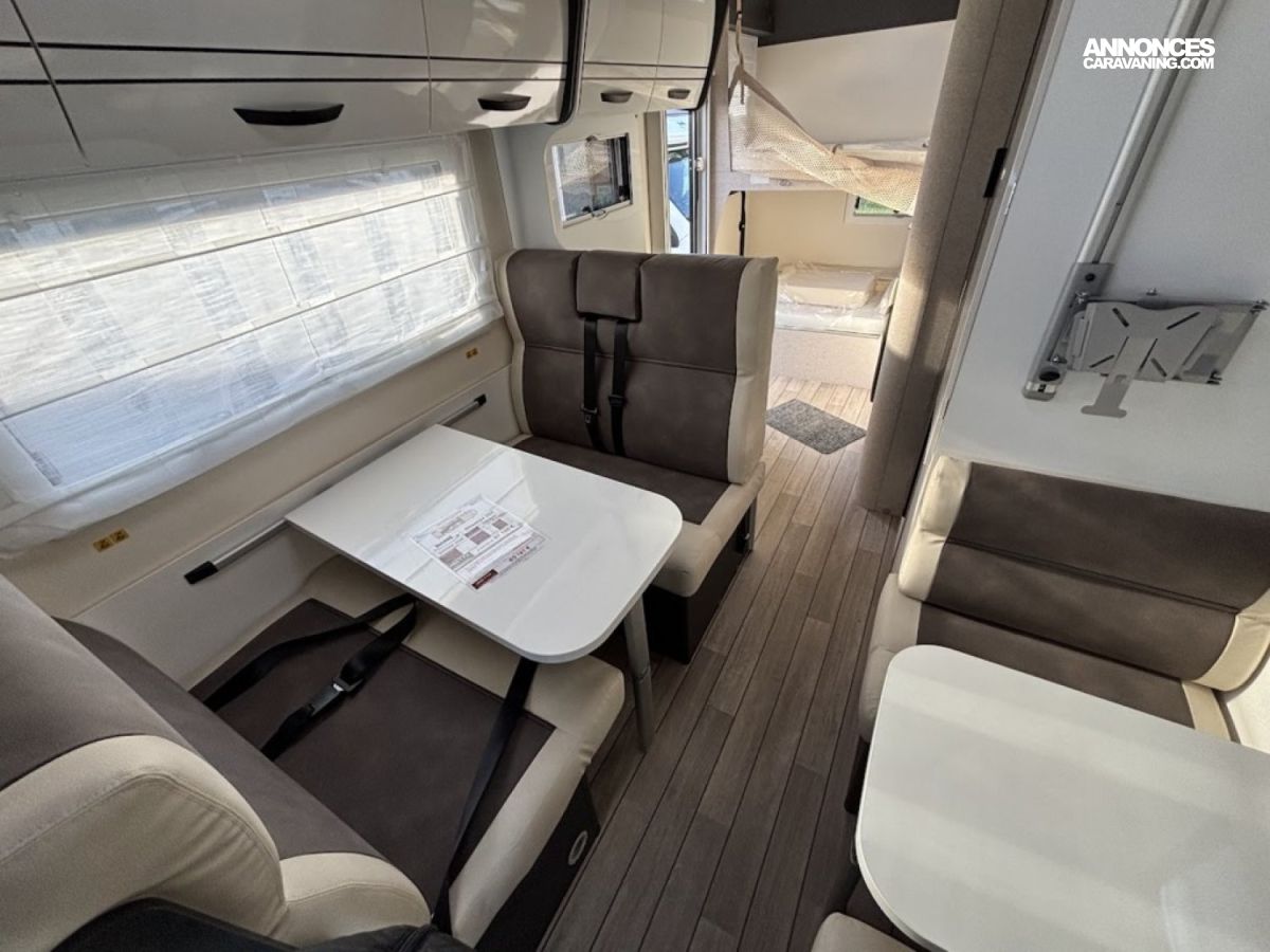 Bac de douche, Cuisine en L, Lit capucine, Lit dînette avant, lit superposés, Salon double dînette avant, Soute, WC Cassette.