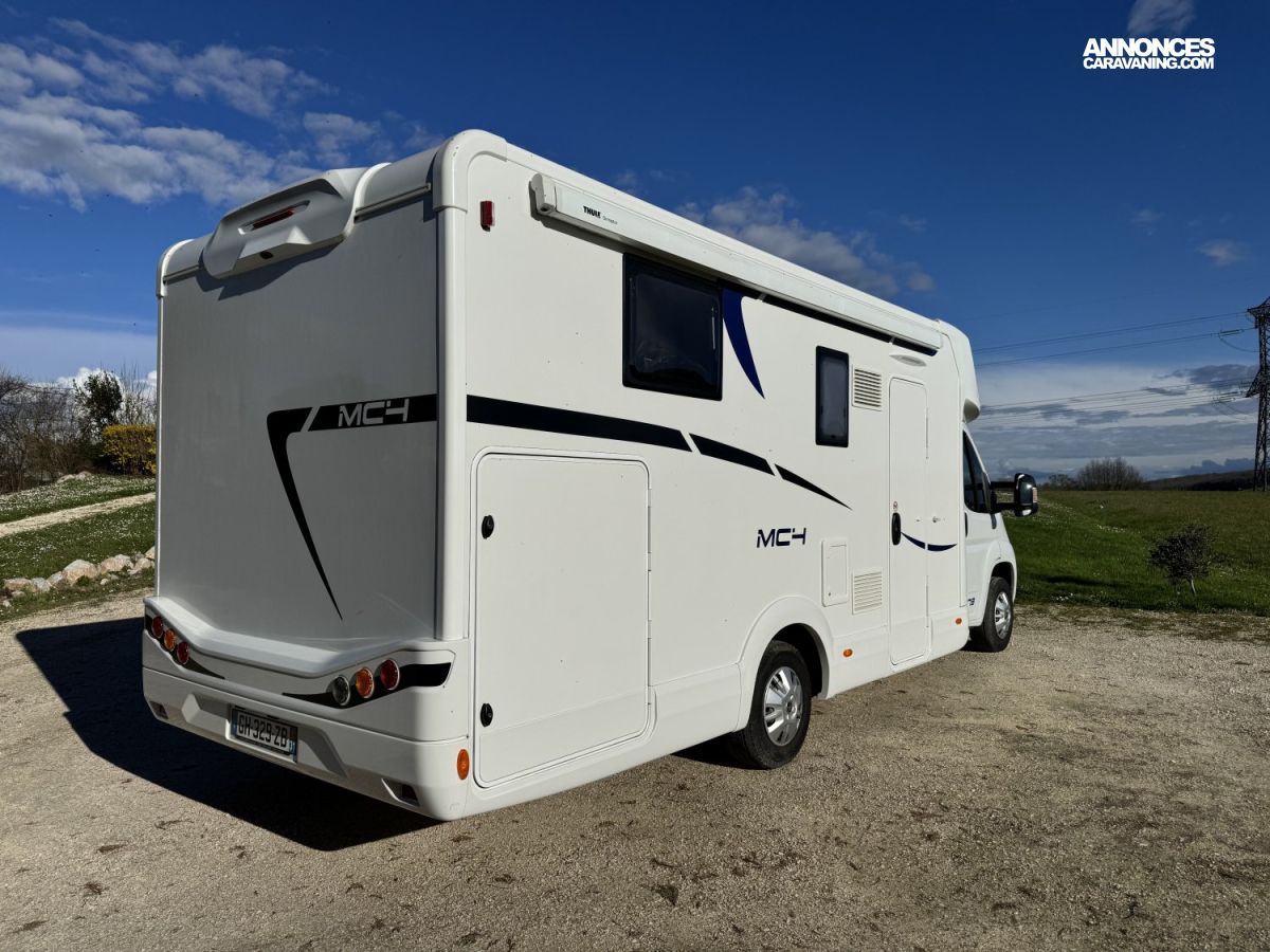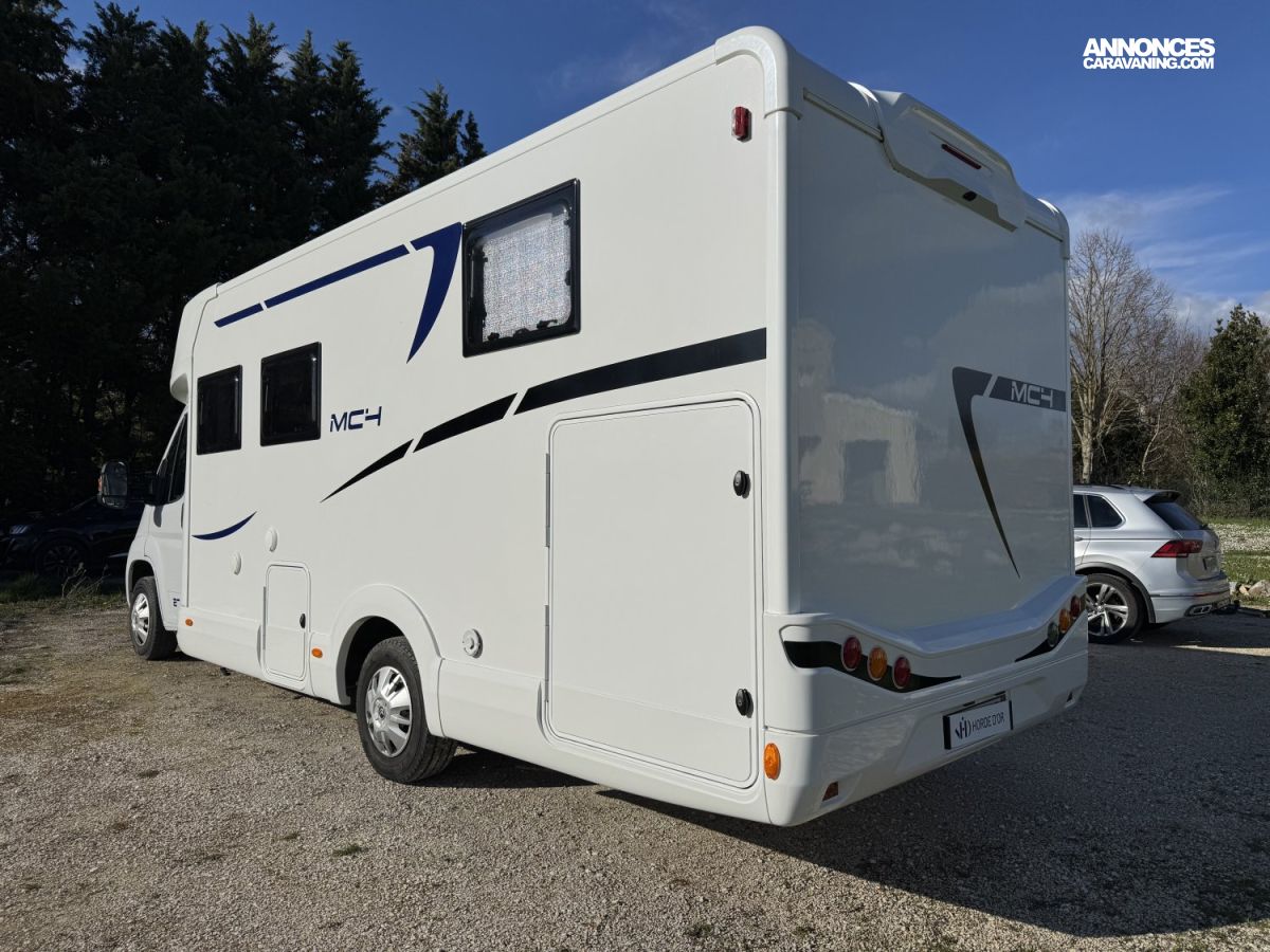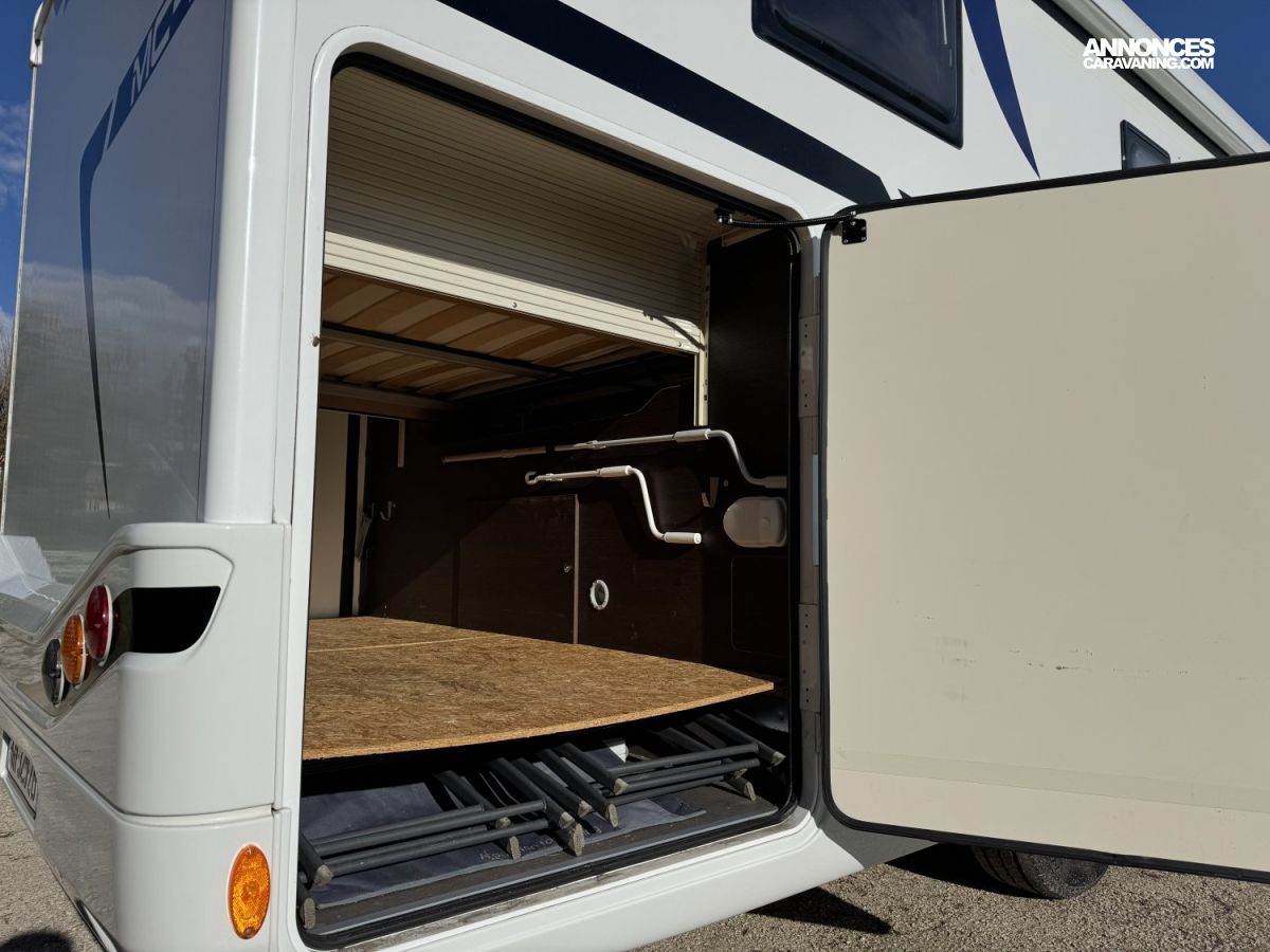McLouis MC4 279 Camping-car profilé avec lit central, lit de pavillon et une soute garage à moto de 1,20m de haut.