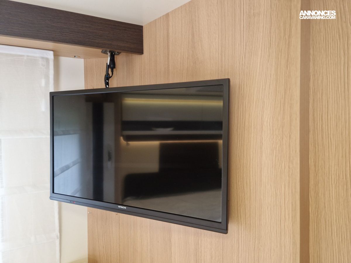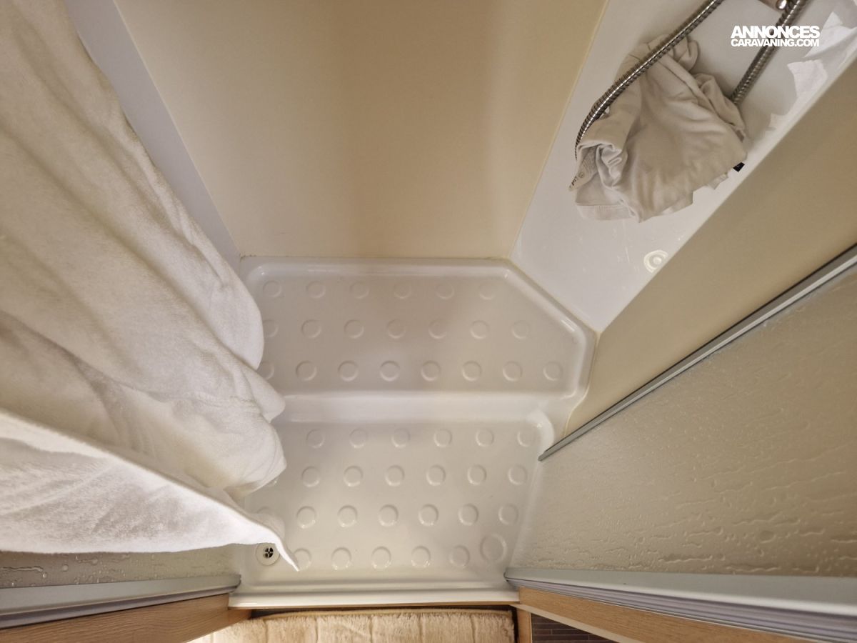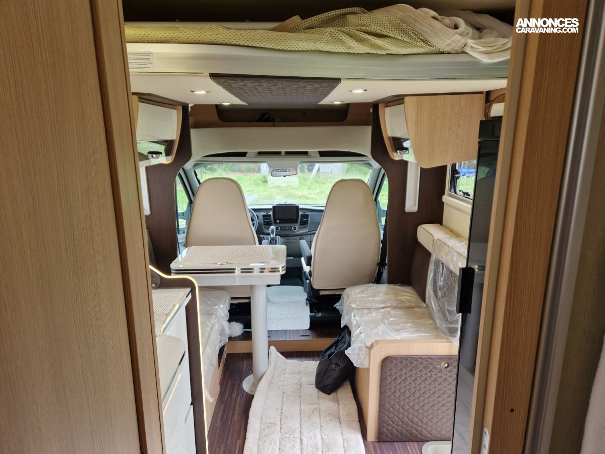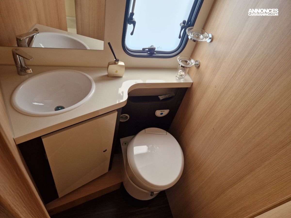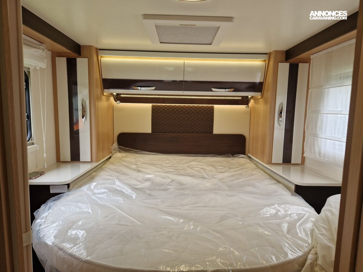 Double cloisonnement offrant une véritable pièce en plus au niveau des sanitaires avec douche et WC indépendant. Cela apporte également plus d'intimité entre la partie chambre et le séjour. Vous saurez apprécier son lit central de 160cm par 190cm, réglable en hauteur offrant une véritable soute garage.