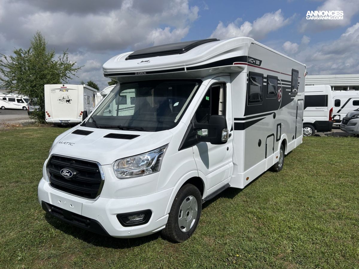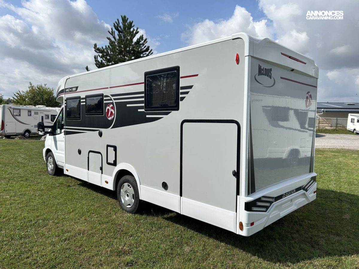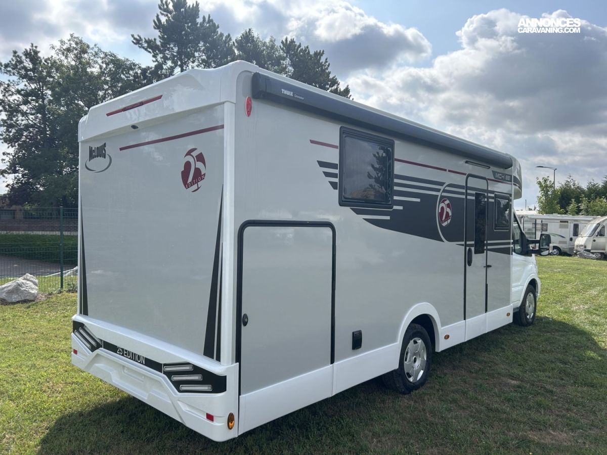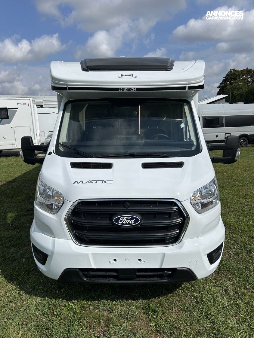 Profilé avec lit de pavillon de 7,45 mètres avec lit central à l’arrière et dînette face-à-face. Boite auto 165cv