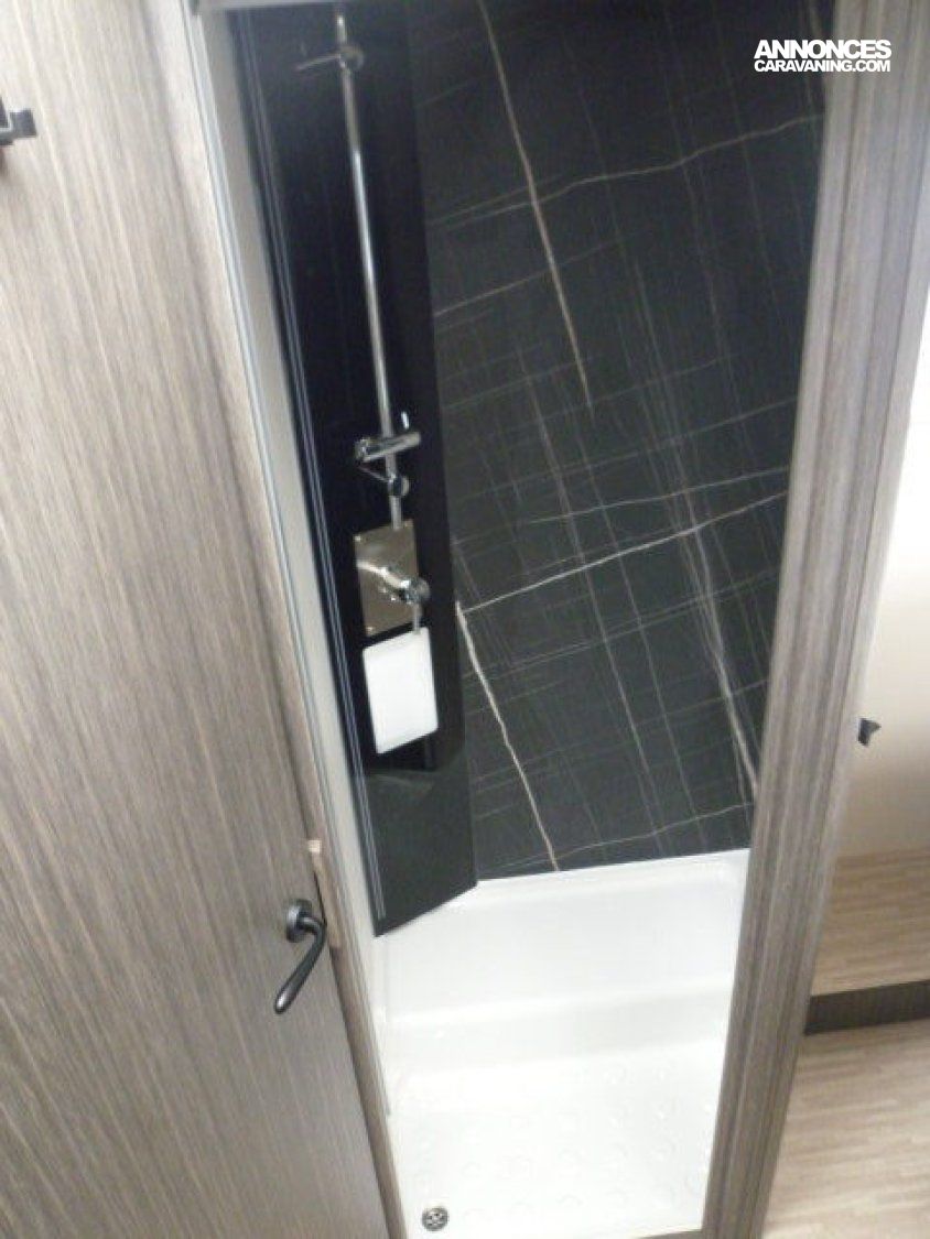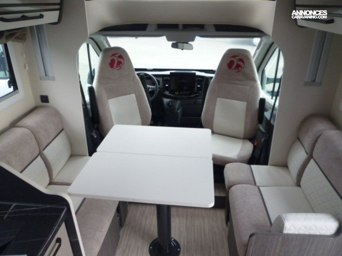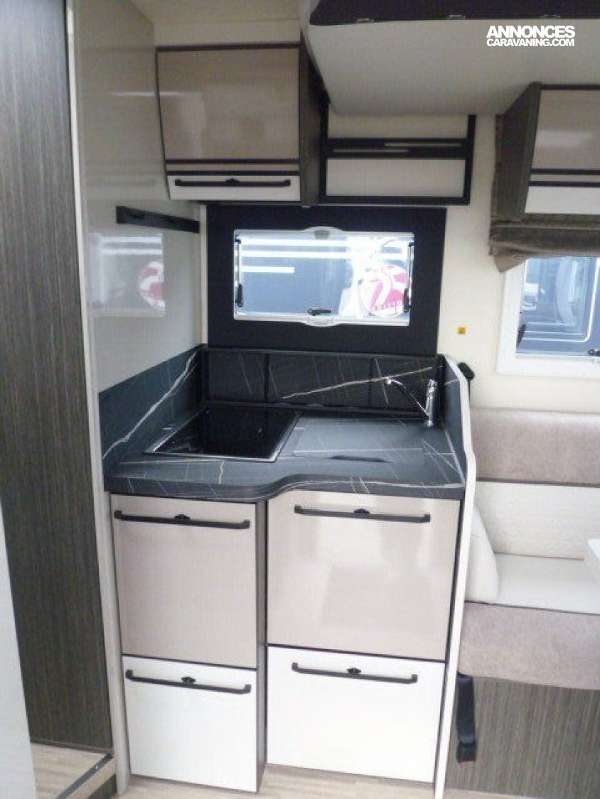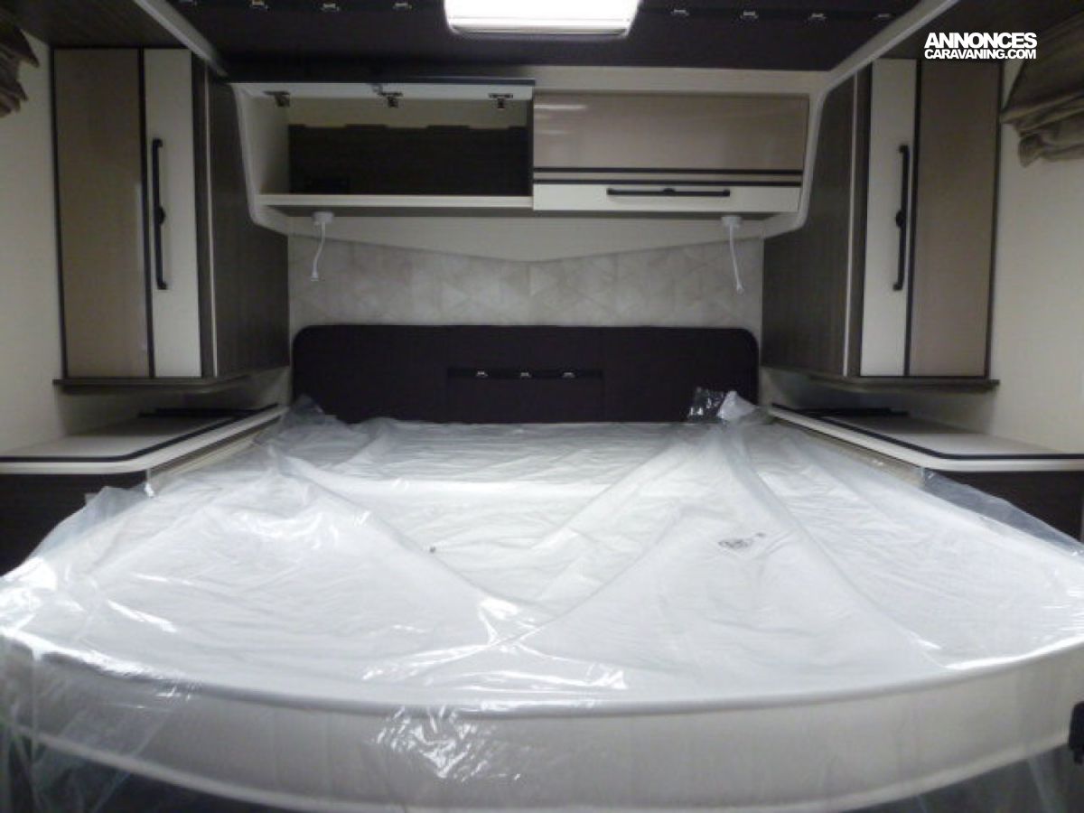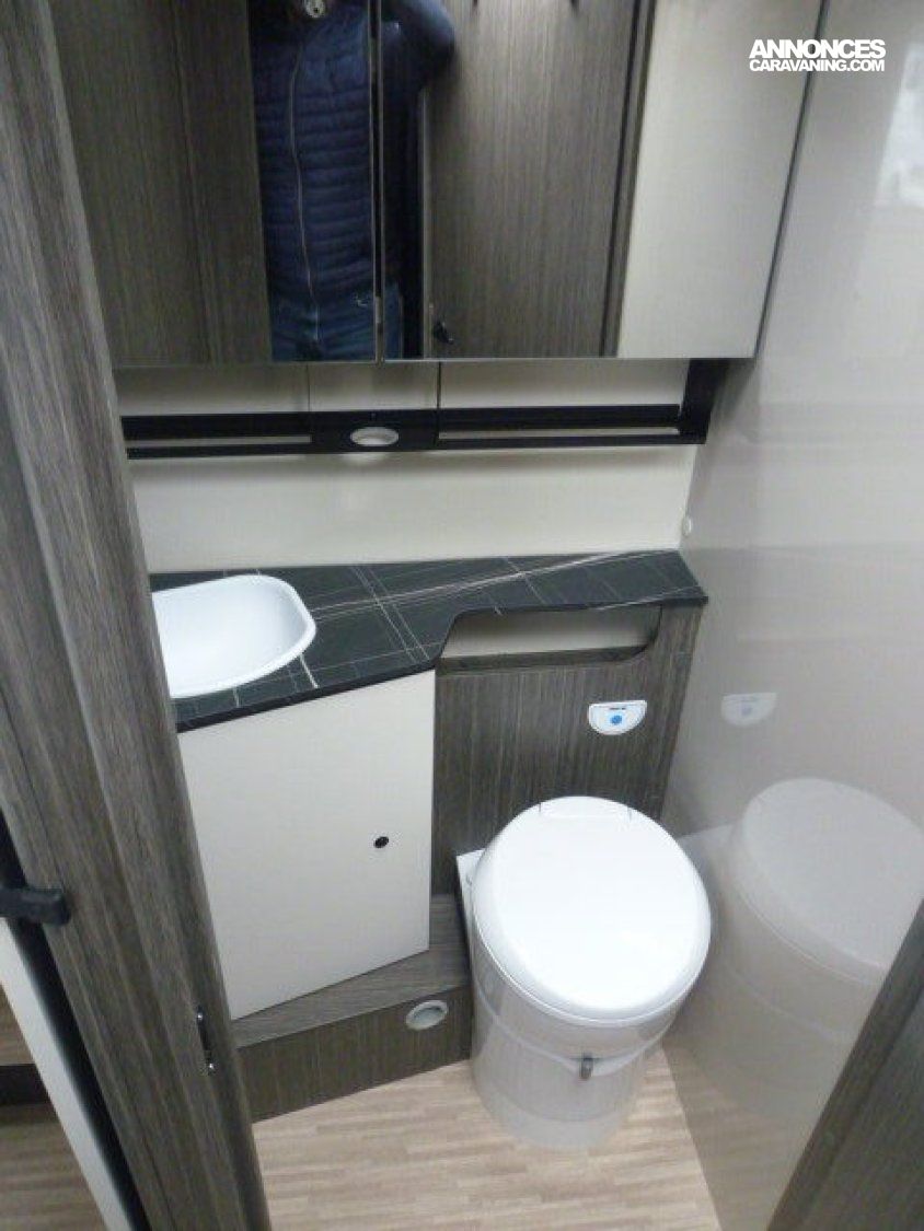 Cuisine en L, Douche indépendante, Lit central, lit pavillon, Salon avant banquettes face à face, Salon avant sièges pivotants, Soute réglable en hauteur, WC Cassette.