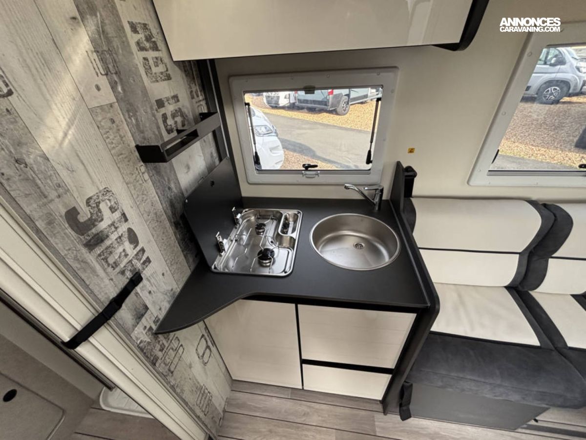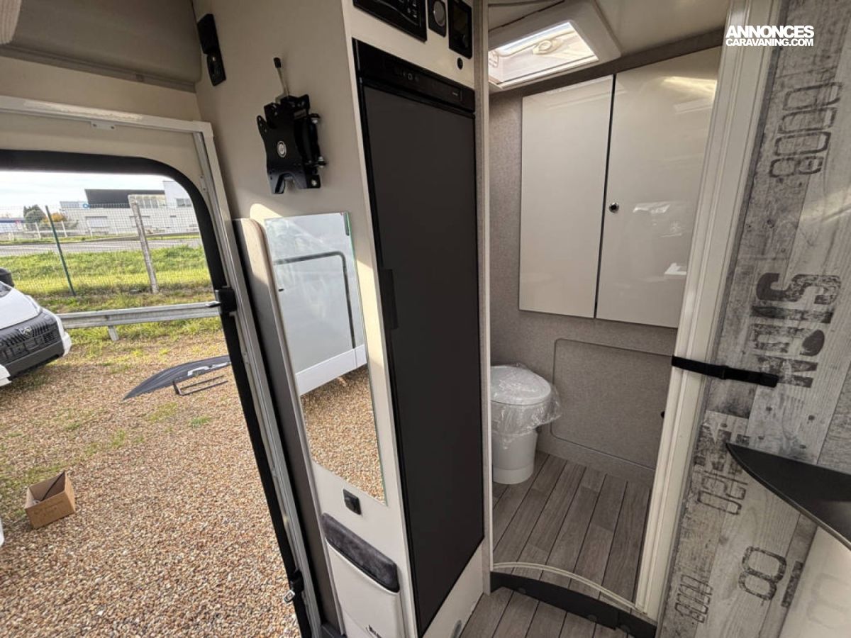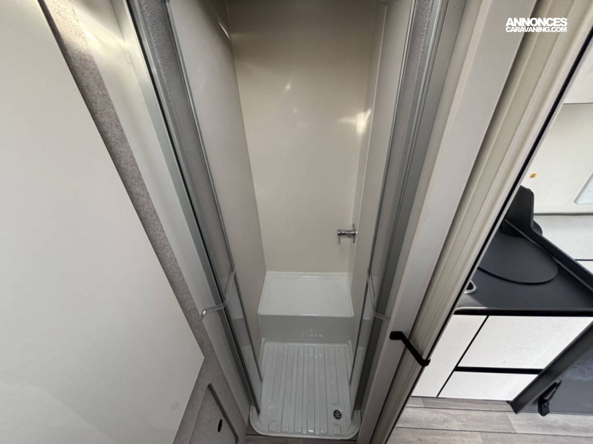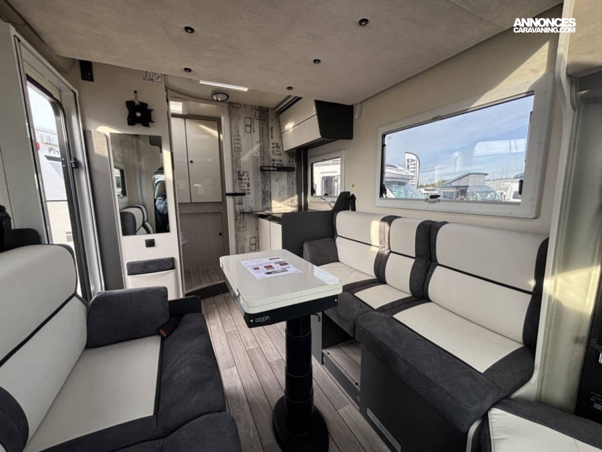 Cuisine en L, Douche indépendante, Lit dînette avant, lit pavillon, Maxi salon, Salon avant banquettes face à face, Salon avant sièges pivotants, Soute, WC Cassette.