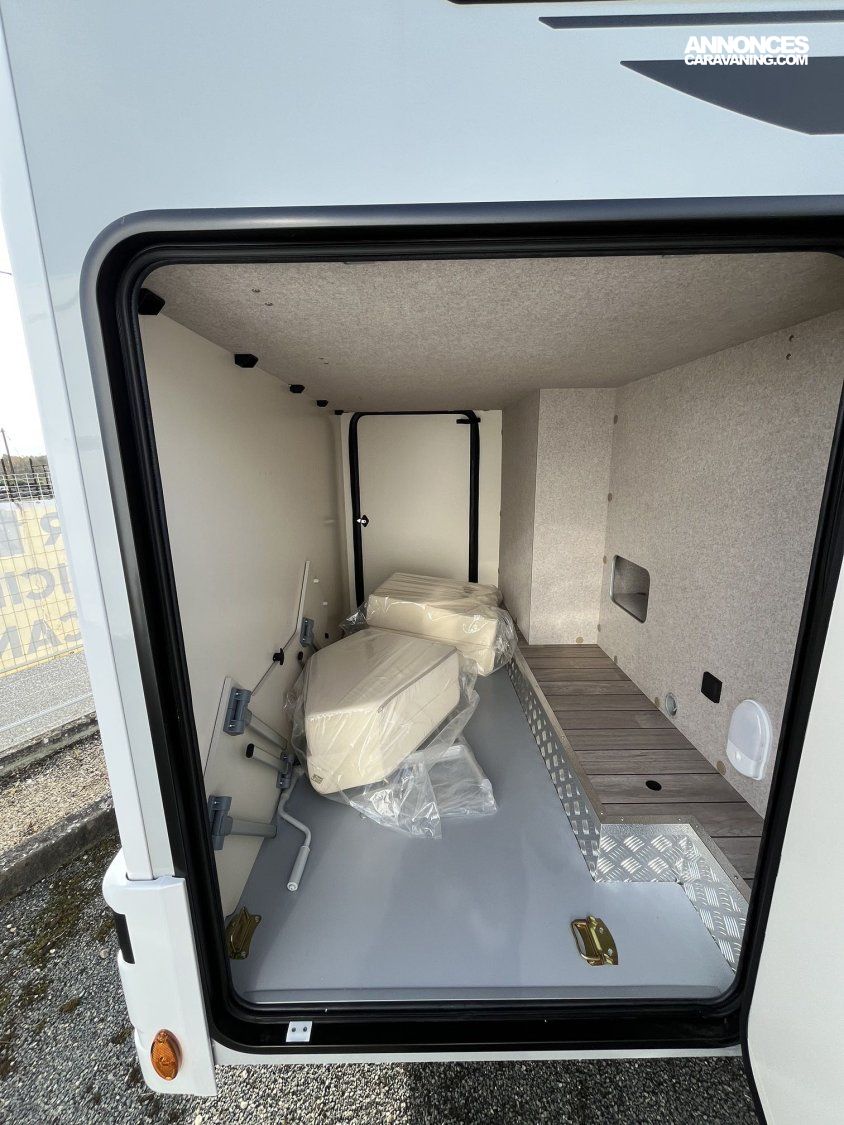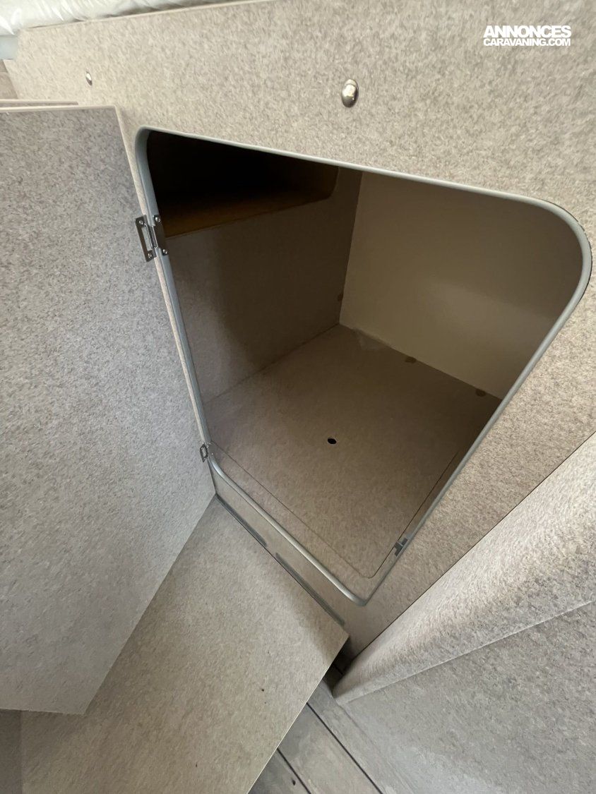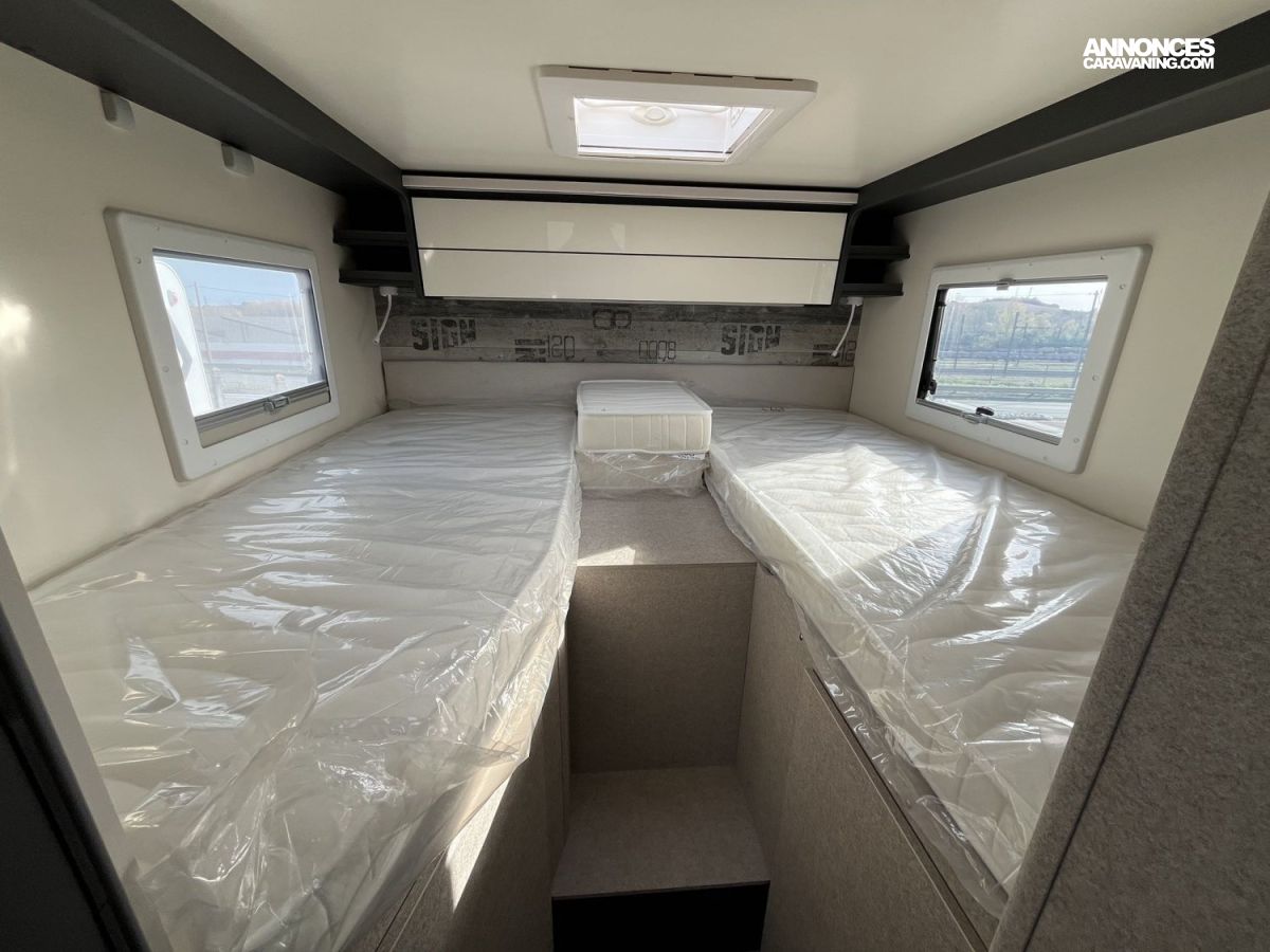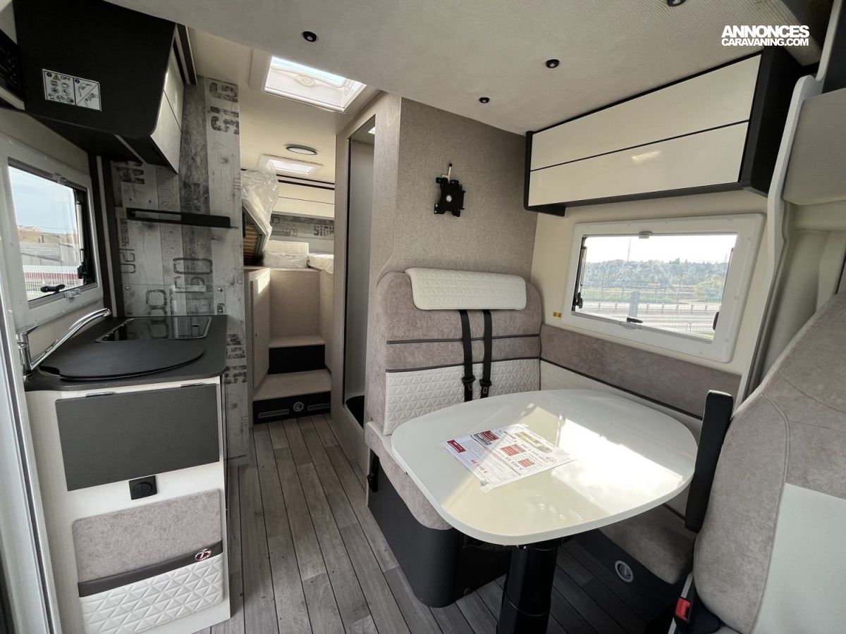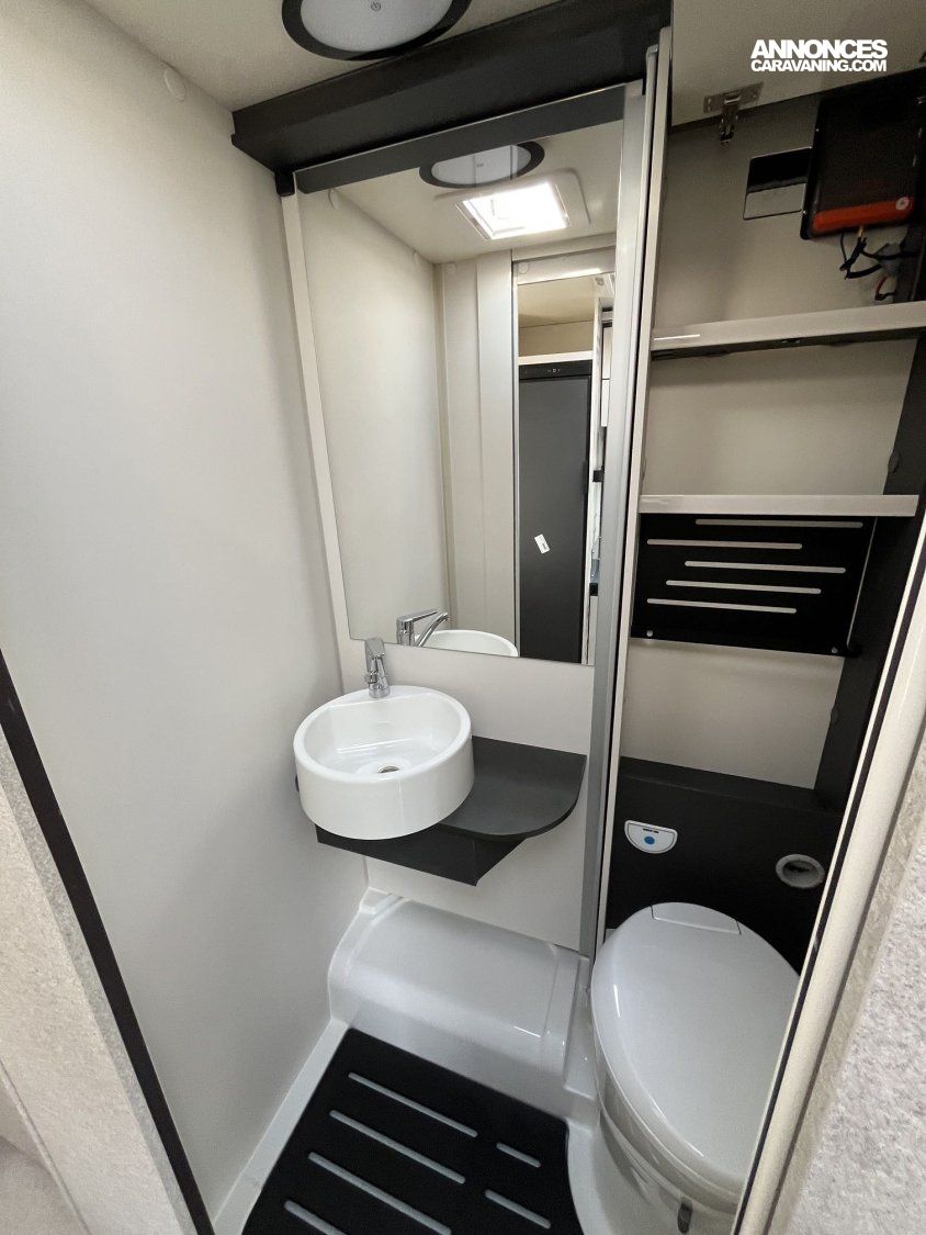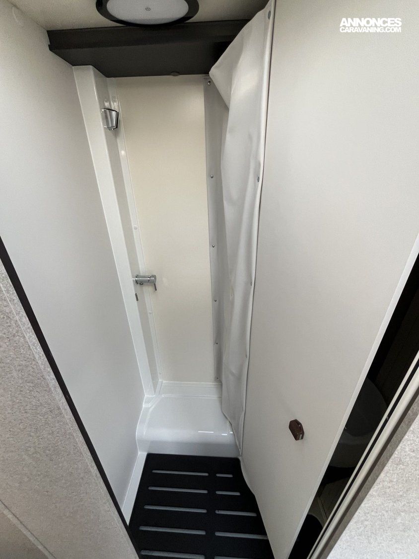 Douche modulable, lit jumeaux, lit pavillon, Salon avant sièges pivotants, Soute, WC Cassette.