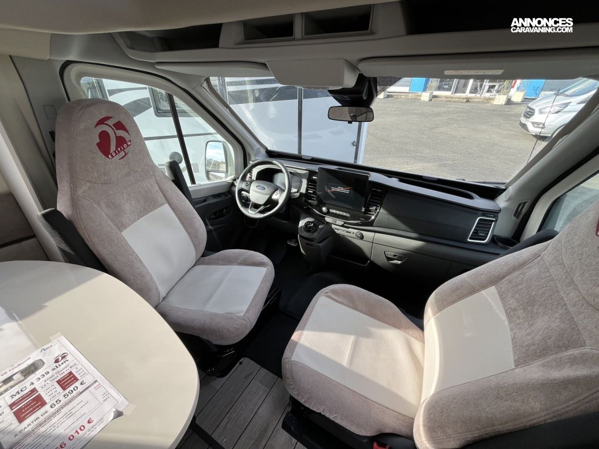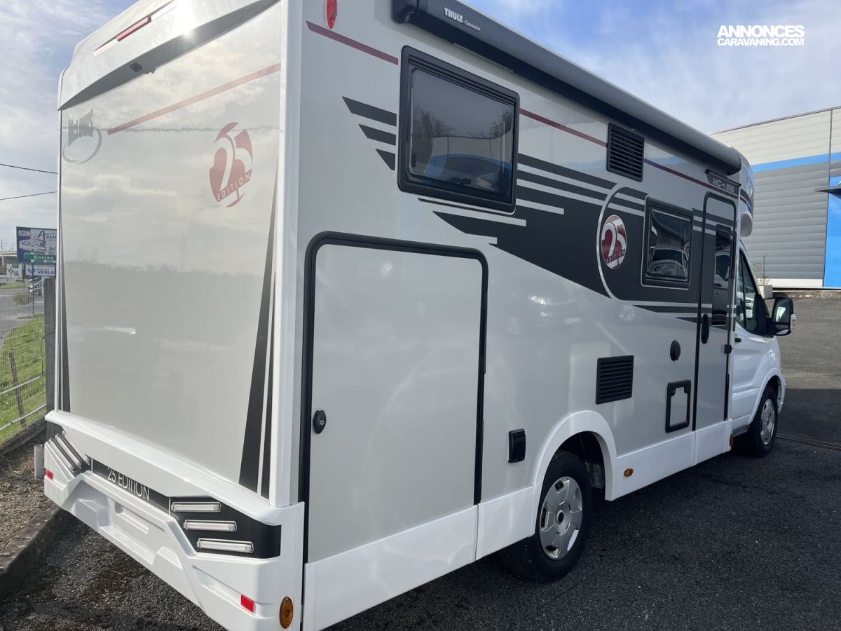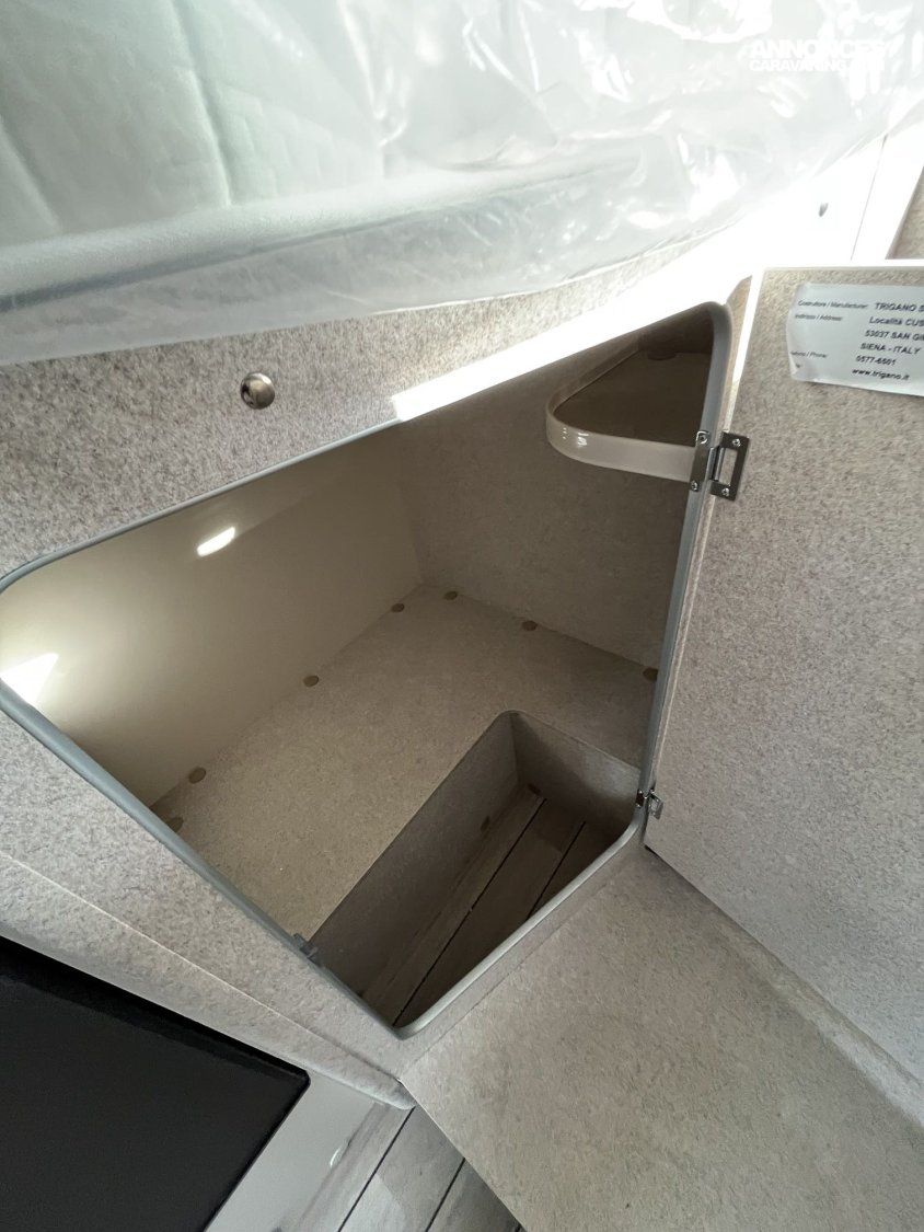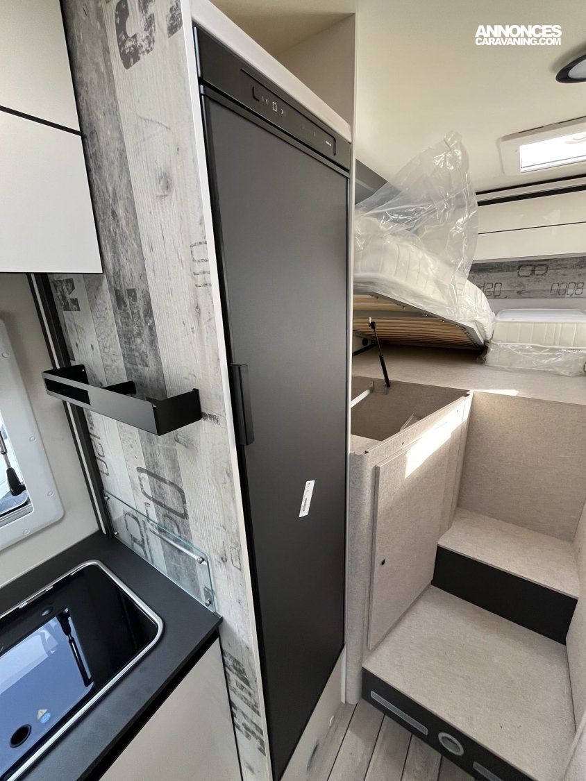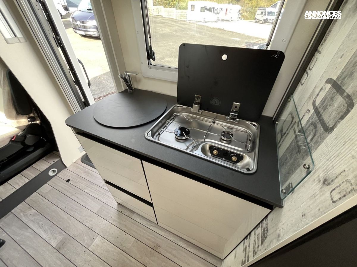 Douche modulable, lit jumeaux, lit pavillon, Salon avant sièges pivotants, Soute, WC Cassette.