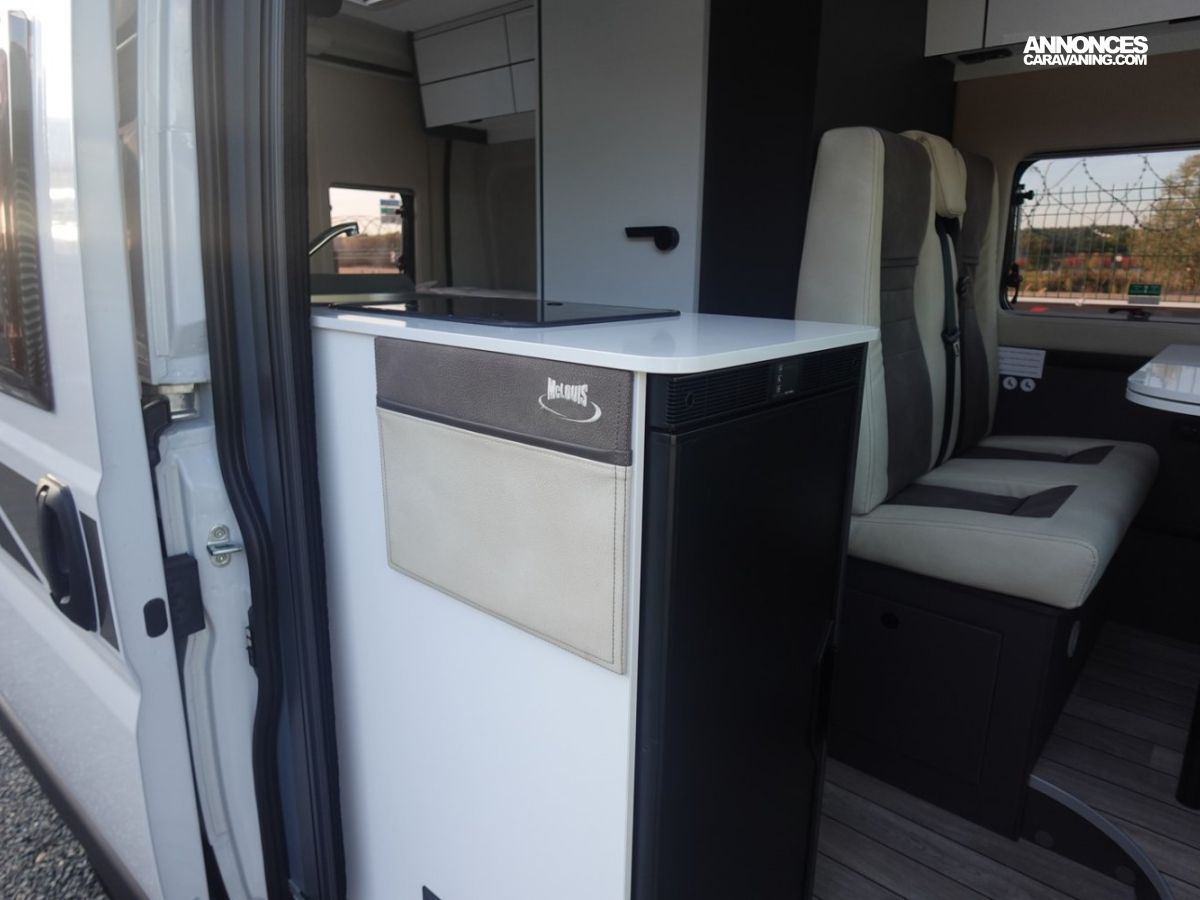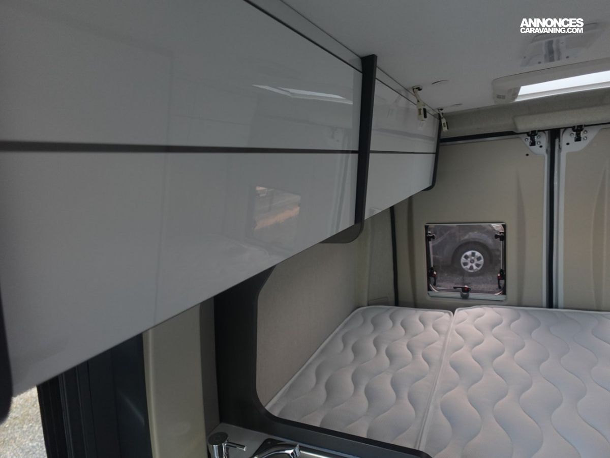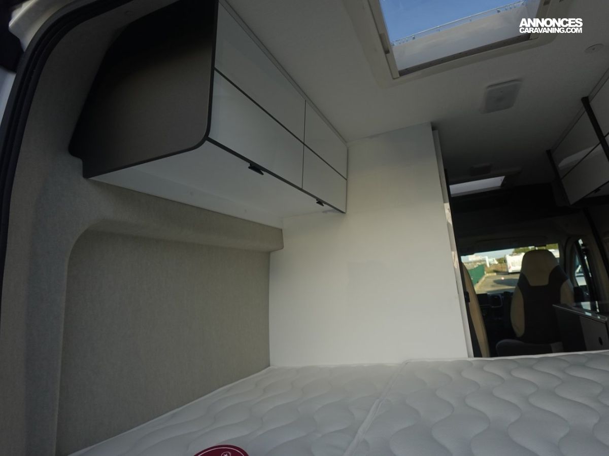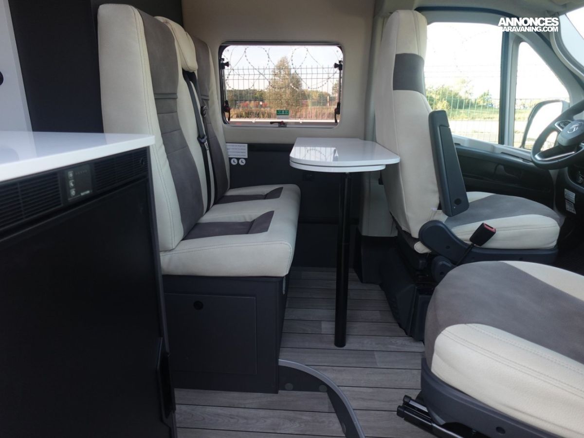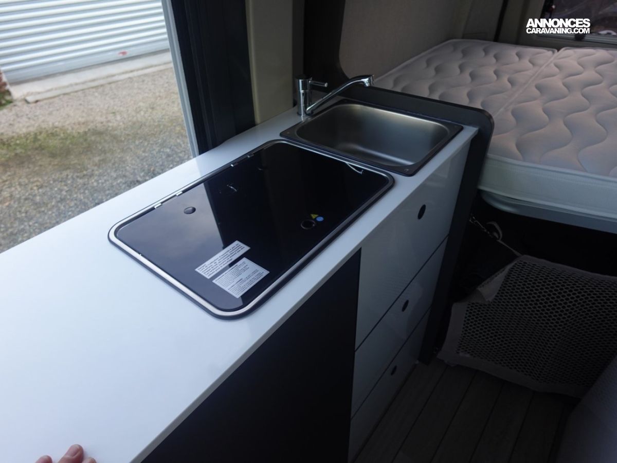 Fourgon comprenant un lit transversal arrière, une salle d’eau avec douche, une cuisine avec de nombreux rangements et un salon avant panoramique. Le tout en 5.41 m de long.