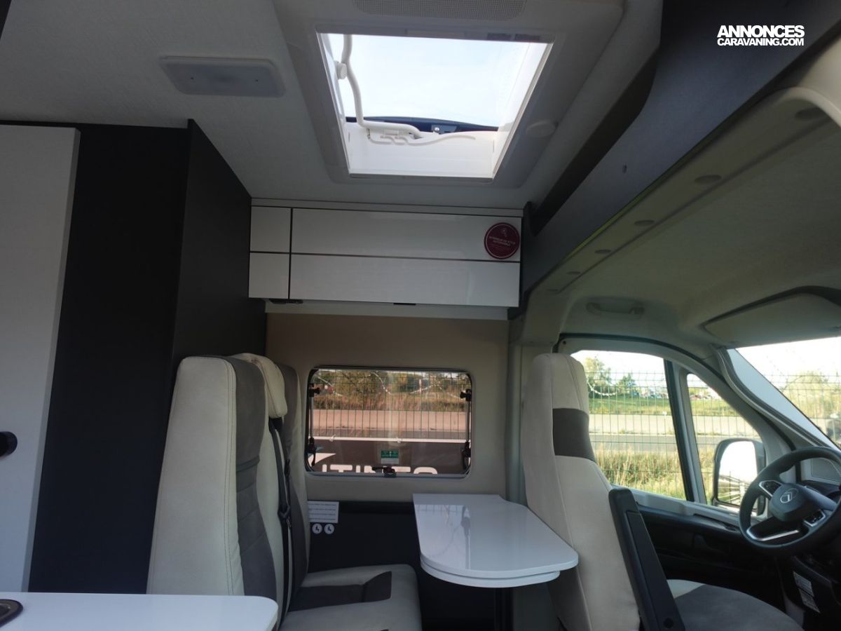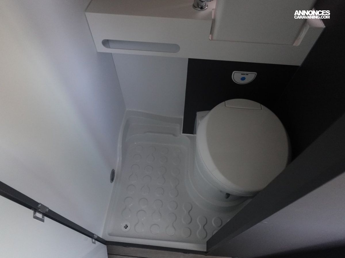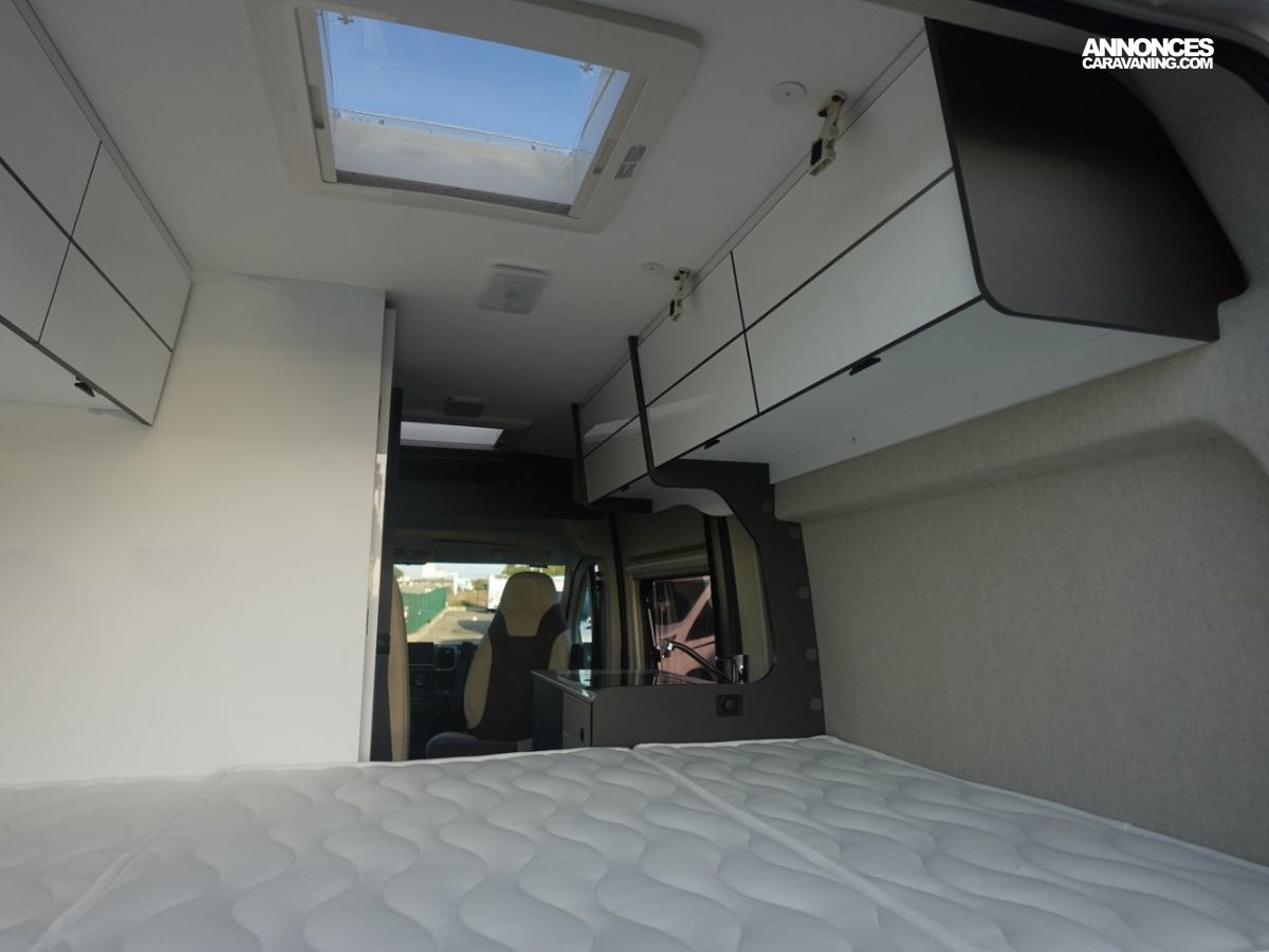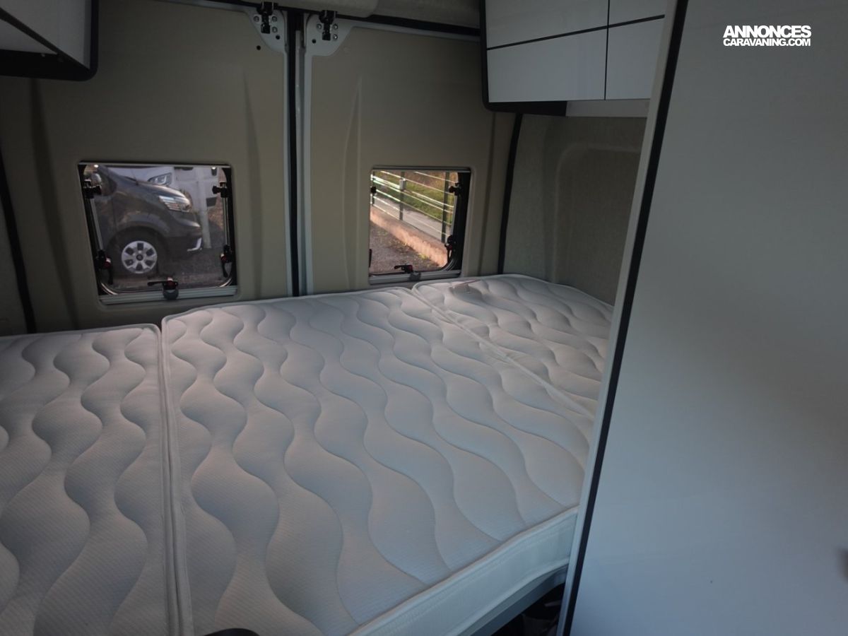 Fourgon comprenant un lit transversal arrière, une salle d’eau avec douche, une cuisine avec de nombreux rangements et un salon avant panoramique. Le tout en 5.41 m de long.
