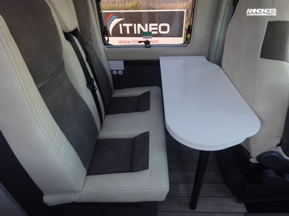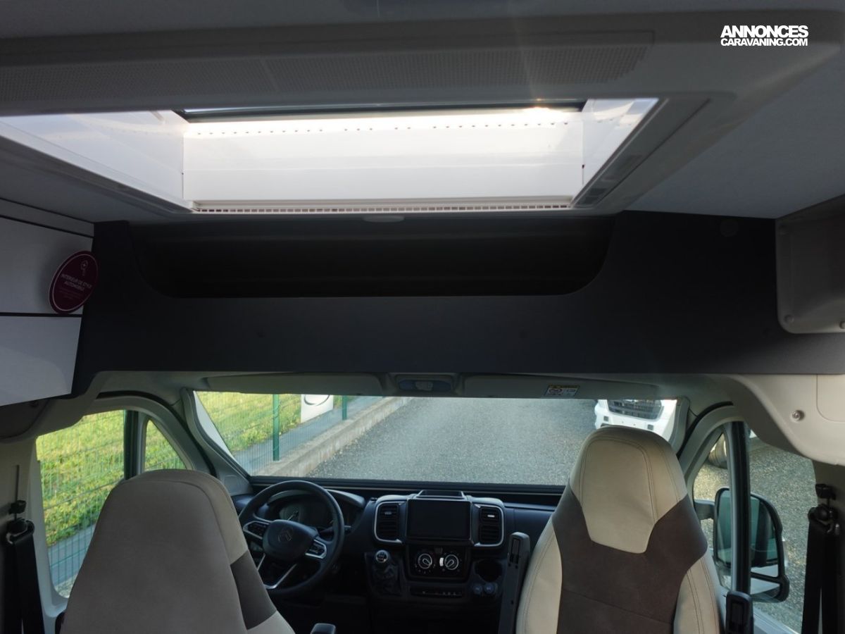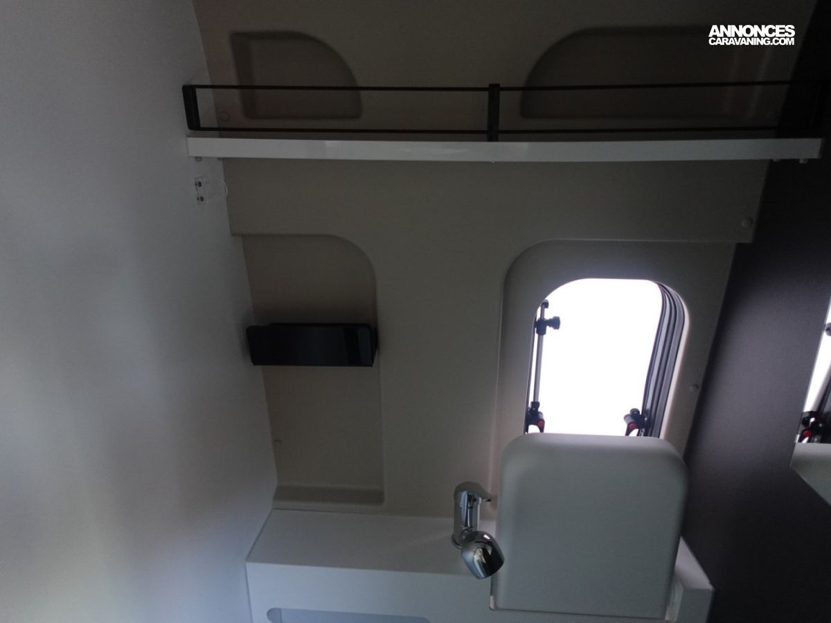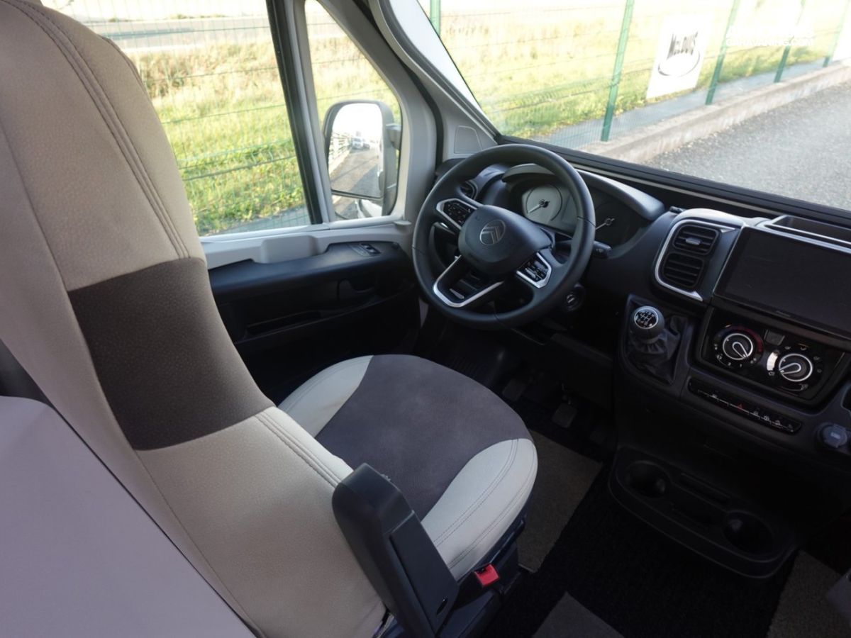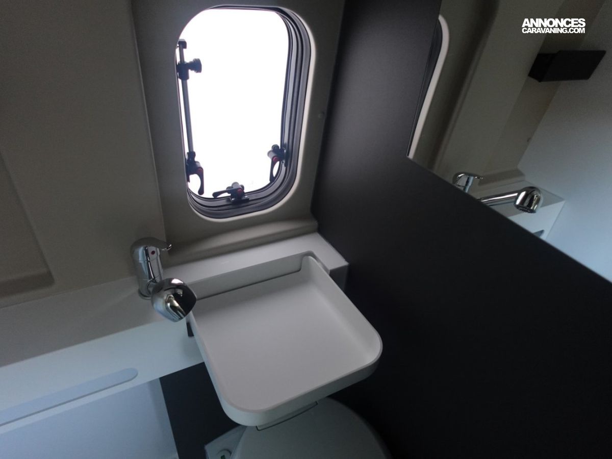Fourgon comprenant un lit transversal arrière, une salle d’eau avec douche, une cuisine avec de nombreux rangements et un salon avant panoramique. Le tout en 5.41 m de long.