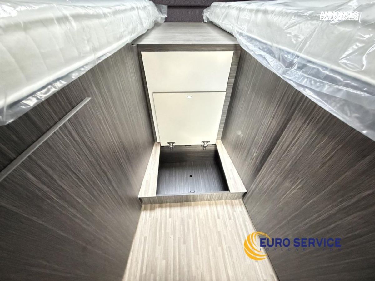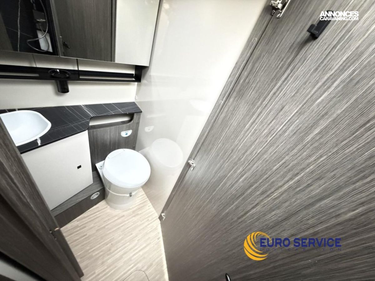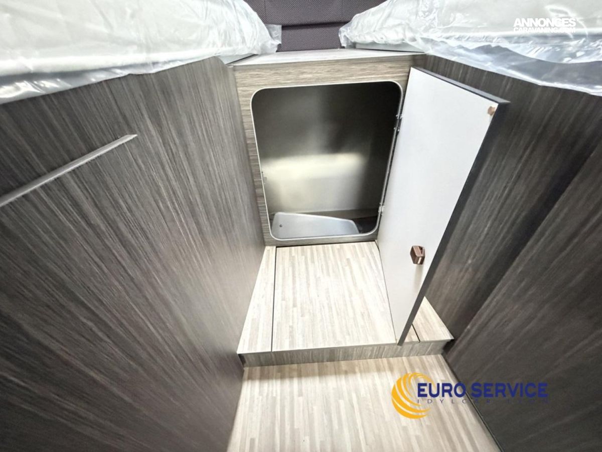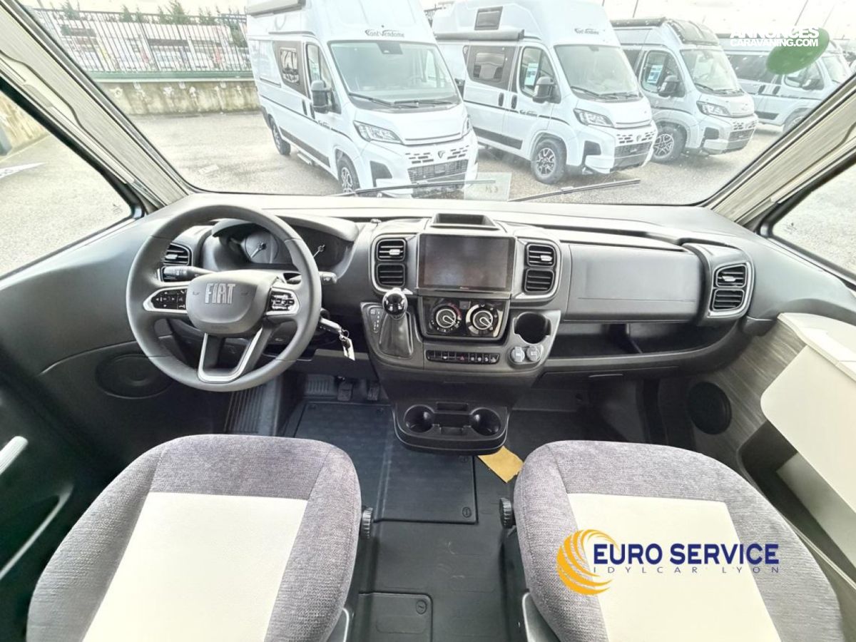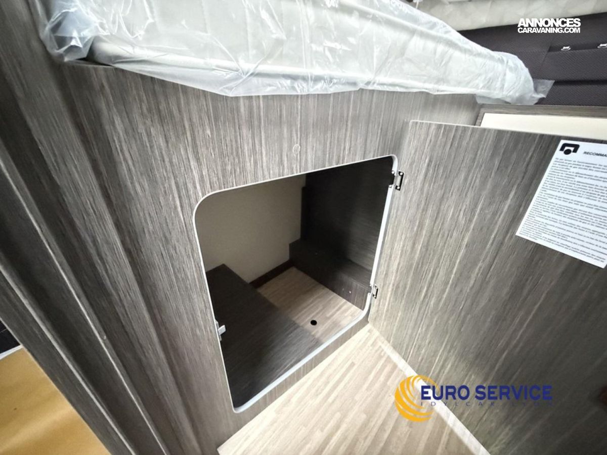 Feux antibrouillard, Jantes en alliage 16" bicolore, Volant et pommeau de vitesse en cuir, Tableau de bord Techno, TPMS - Contrôle de pression des pneus, Frein à main électrique, Porte cellule XL avec 2 points de sécurité avec fenetre et serrure centralisée, Panneau solaire 200W avec régulateur MPPT, Store d'occultation plissé cabine, Support TV.