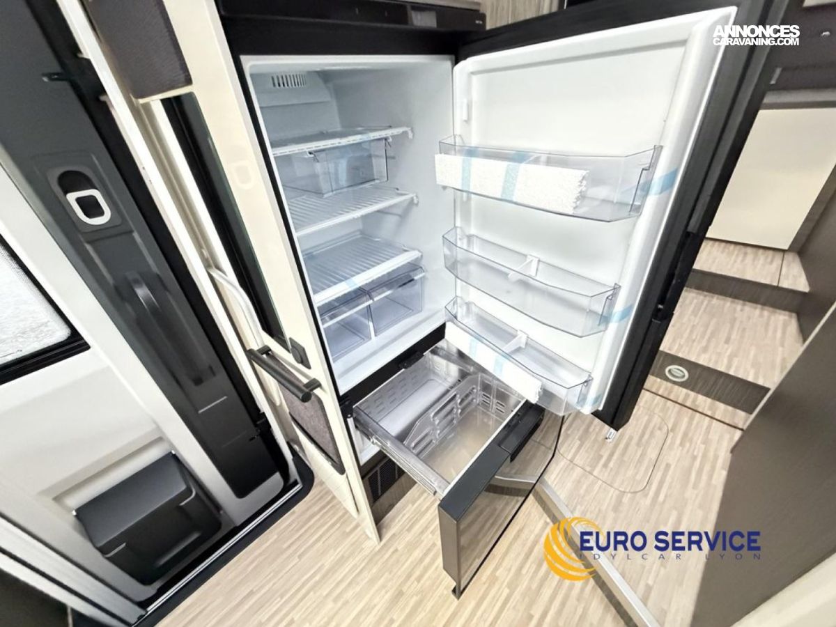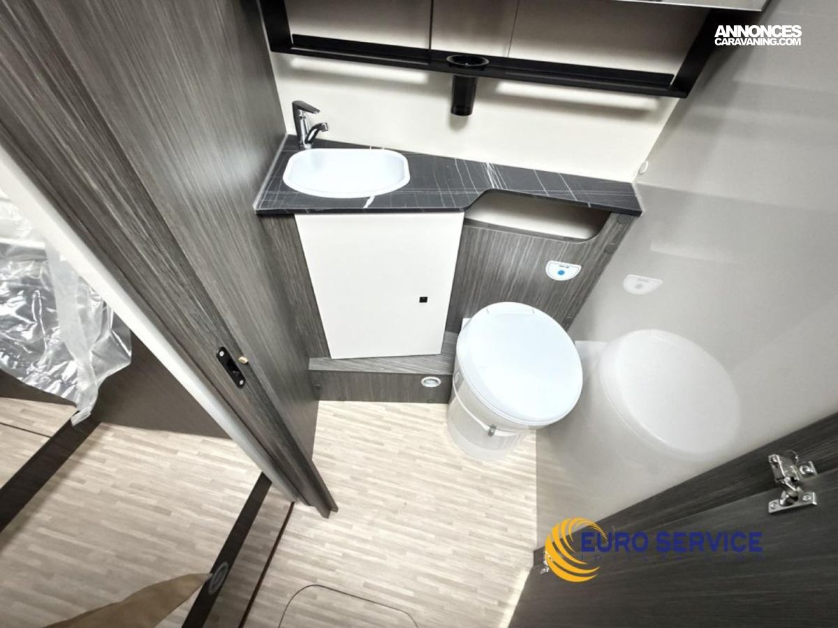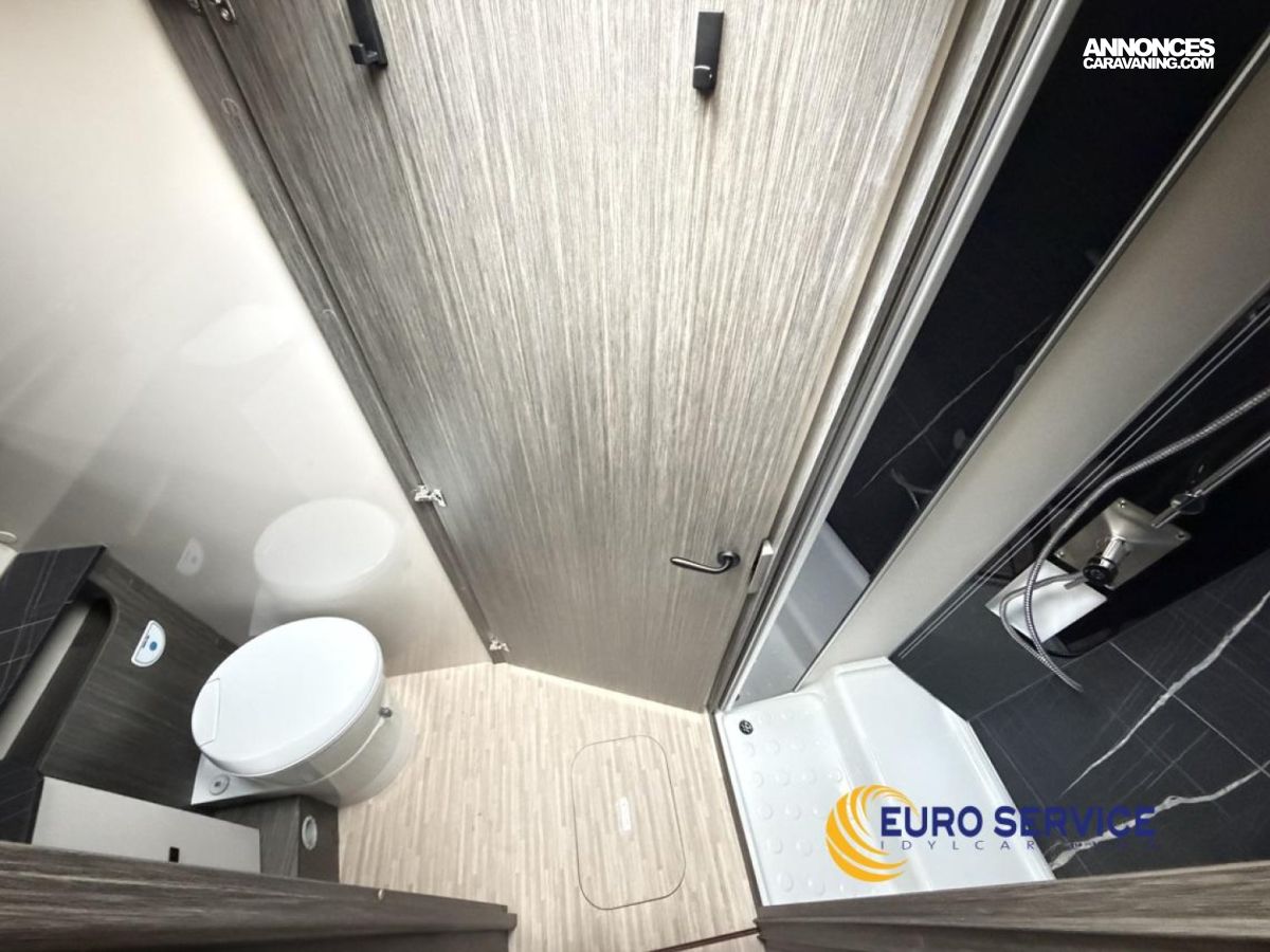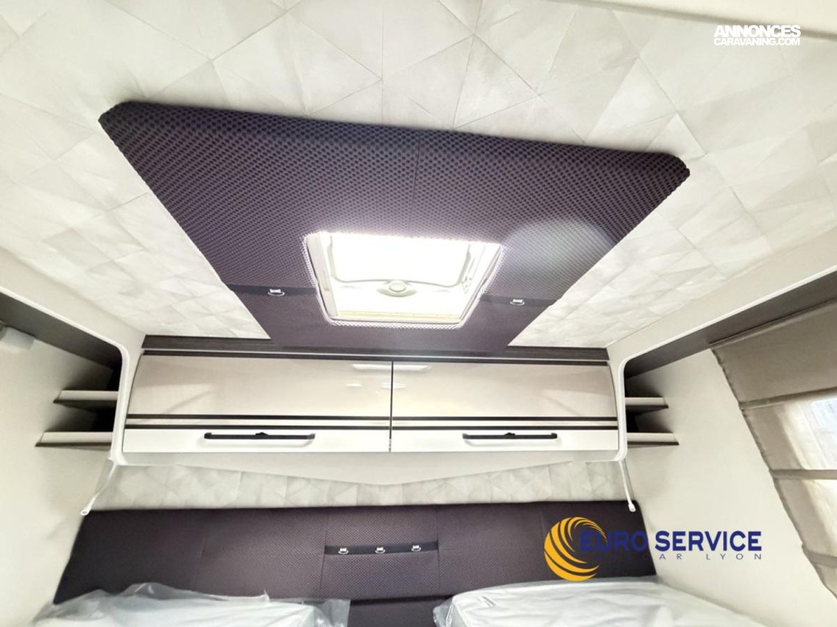 Feux antibrouillard, Jantes en alliage 16" bicolore, Volant et pommeau de vitesse en cuir, Tableau de bord Techno, TPMS - Contrôle de pression des pneus, Frein à main électrique, Porte cellule XL avec 2 points de sécurité avec fenetre et serrure centralisée, Panneau solaire 200W avec régulateur MPPT, Store d'occultation plissé cabine, Support TV.