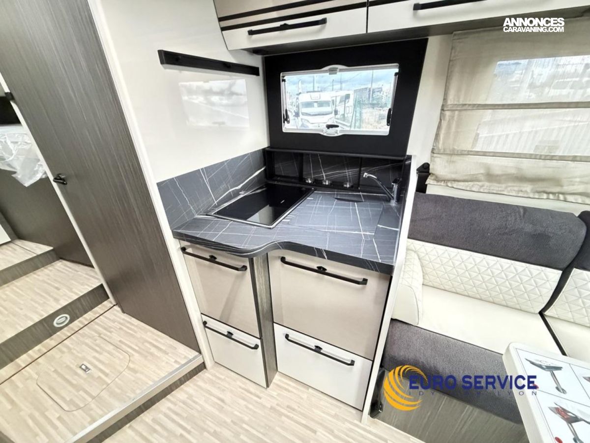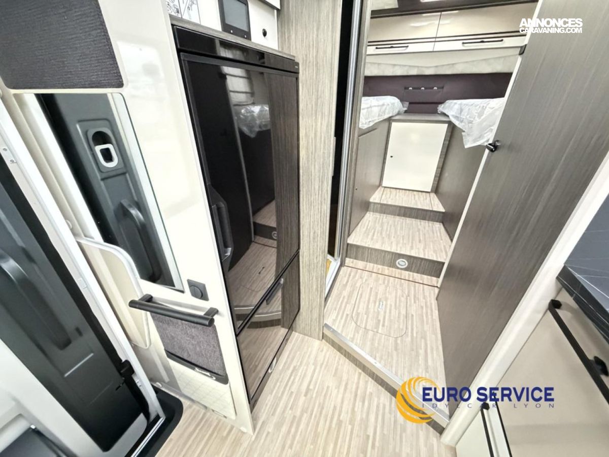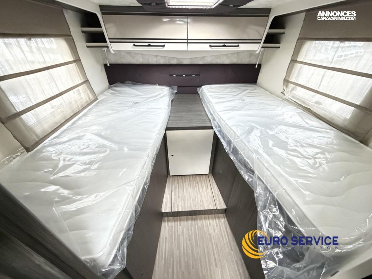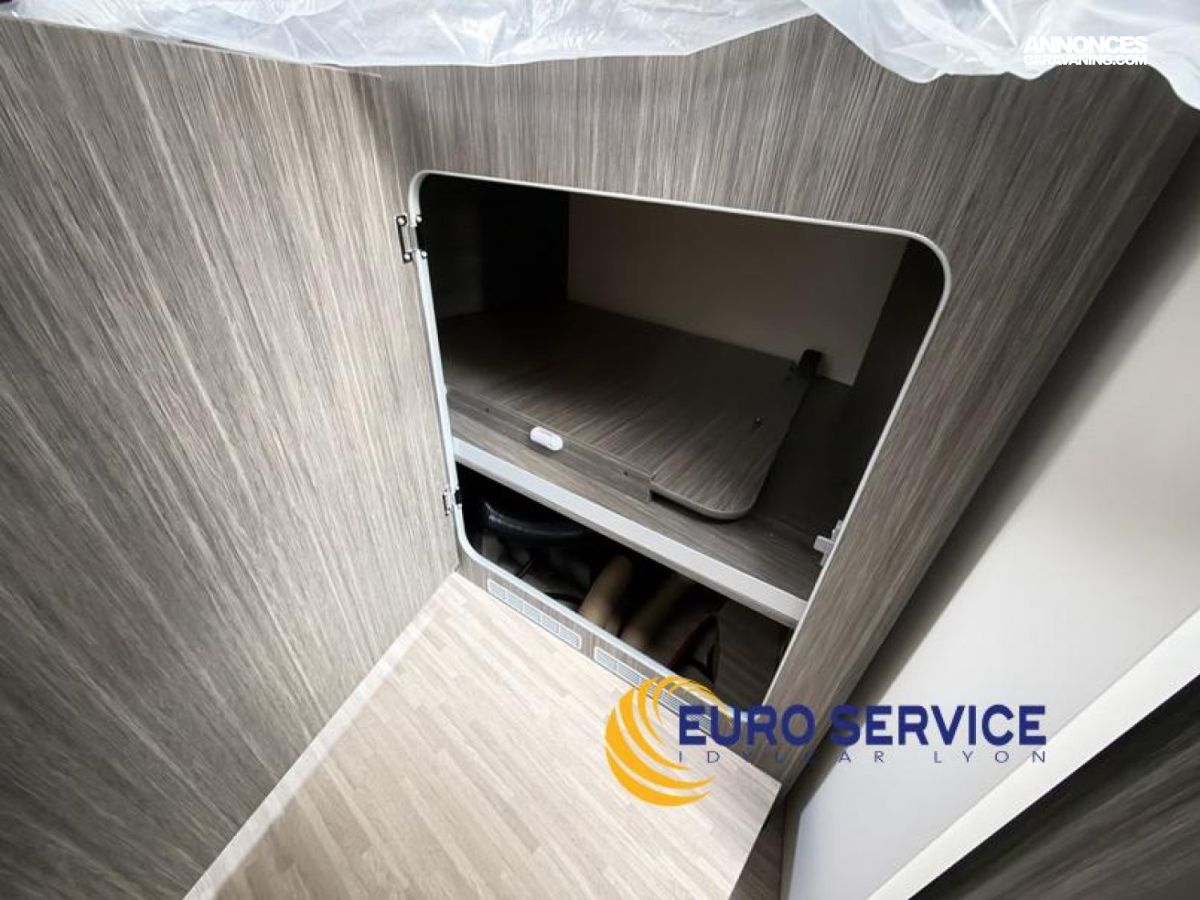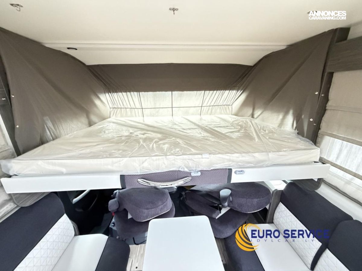 Feux antibrouillard, Jantes en alliage 16" bicolore, Volant et pommeau de vitesse en cuir, Tableau de bord Techno, TPMS - Contrôle de pression des pneus, Frein à main électrique, Porte cellule XL avec 2 points de sécurité avec fenetre et serrure centralisée, Panneau solaire 200W avec régulateur MPPT, Store d'occultation plissé cabine, Support TV.
