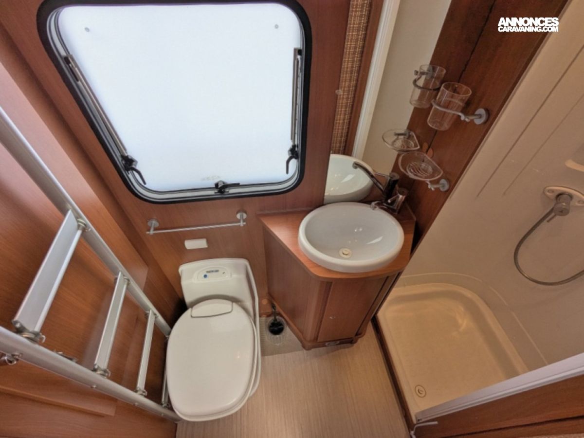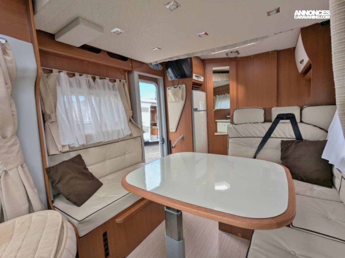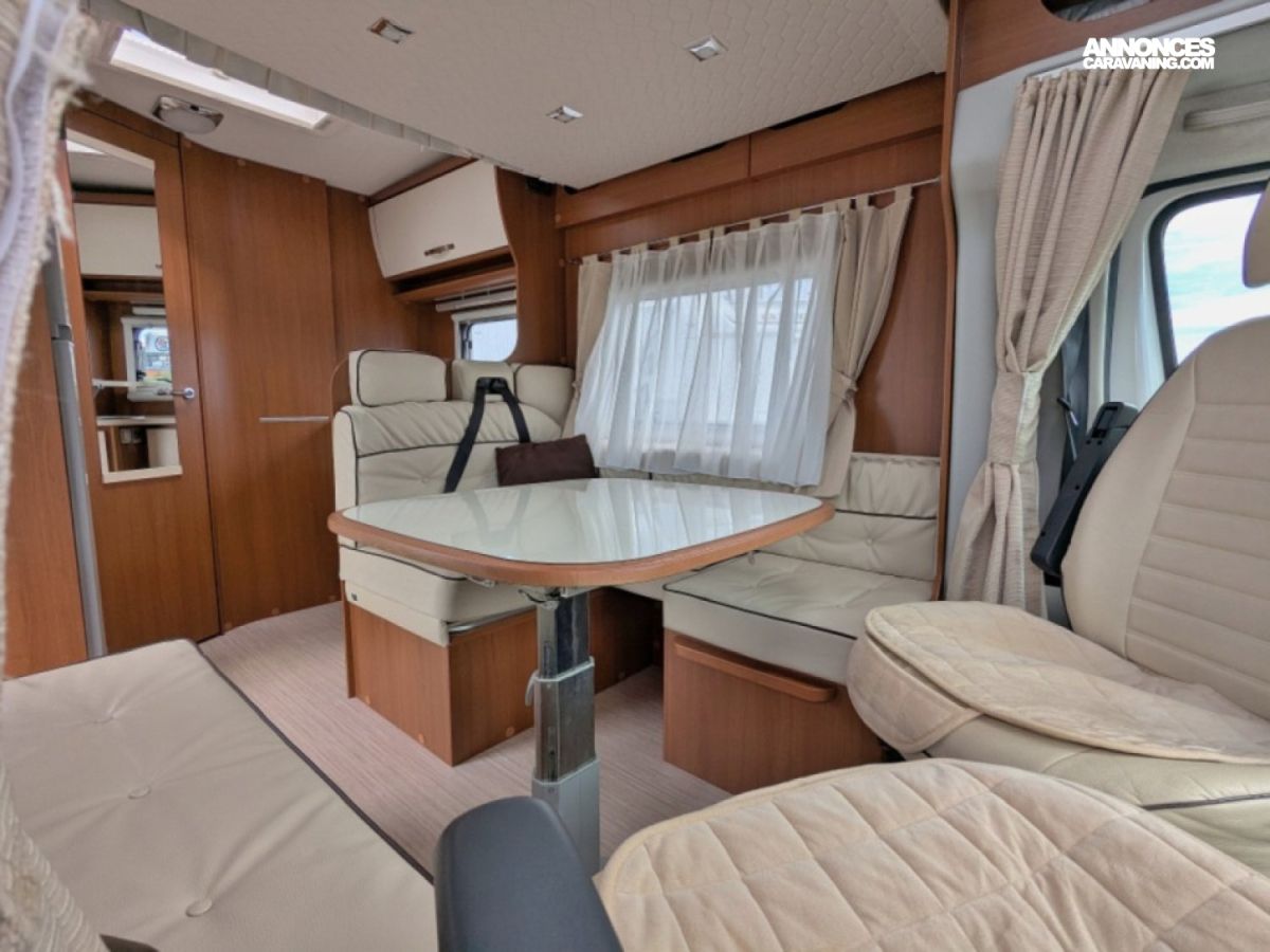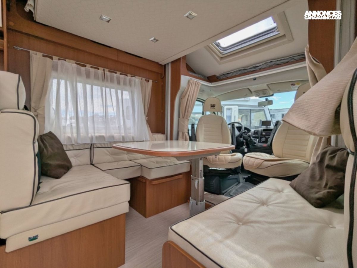 Profilé ultra compact en très bon état sur Fiat 2,3 JTD 130 CV BV6 avec salle d'eau/WC et douche séparée arrière, cuisine latérale en L avec frigo conservateur et plaque de cuisson 2 feux, et salon avant avec banquette face/face convertible en couchage de deux personnes. Lit de pavillon électrique de deux personnes au-dessus du salon.