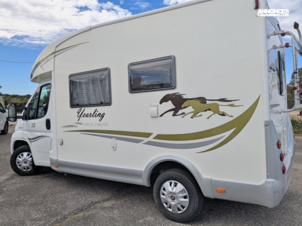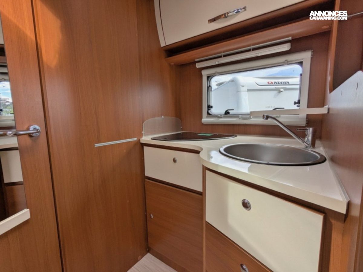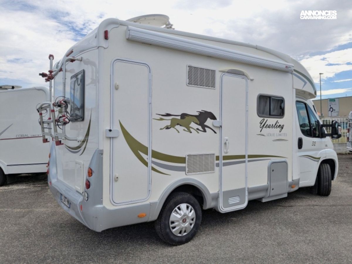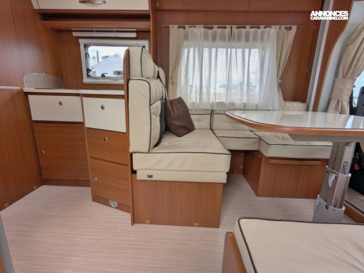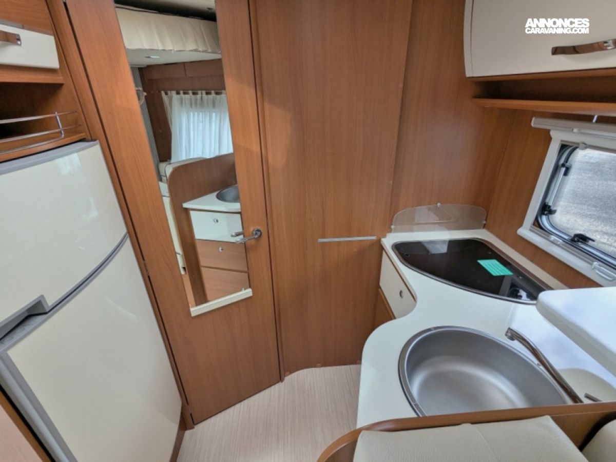 Profilé ultra compact en très bon état sur Fiat 2,3 JTD 130 CV BV6 avec salle d'eau/WC et douche séparée arrière, cuisine latérale en L avec frigo conservateur et plaque de cuisson 2 feux, et salon avant avec banquette face/face convertible en couchage de deux personnes. Lit de pavillon électrique de deux personnes au-dessus du salon.