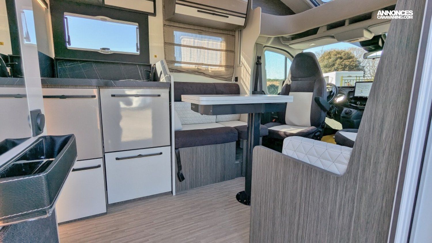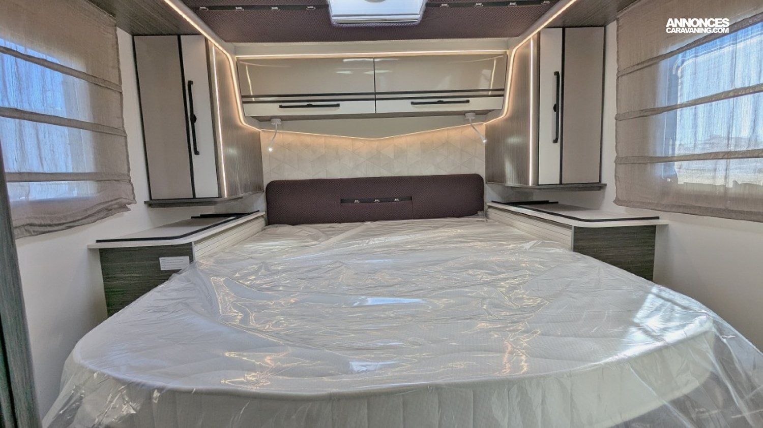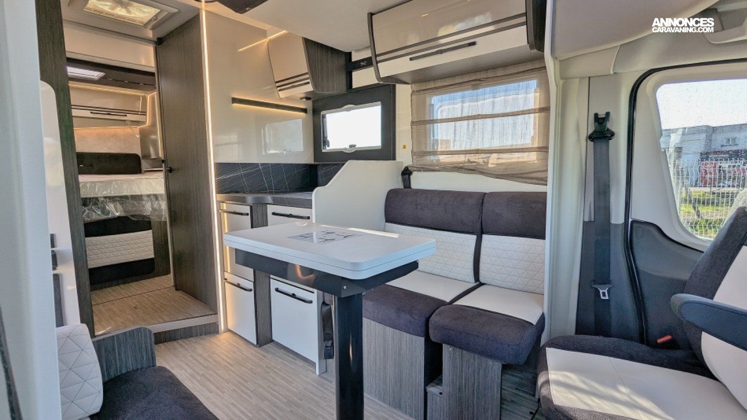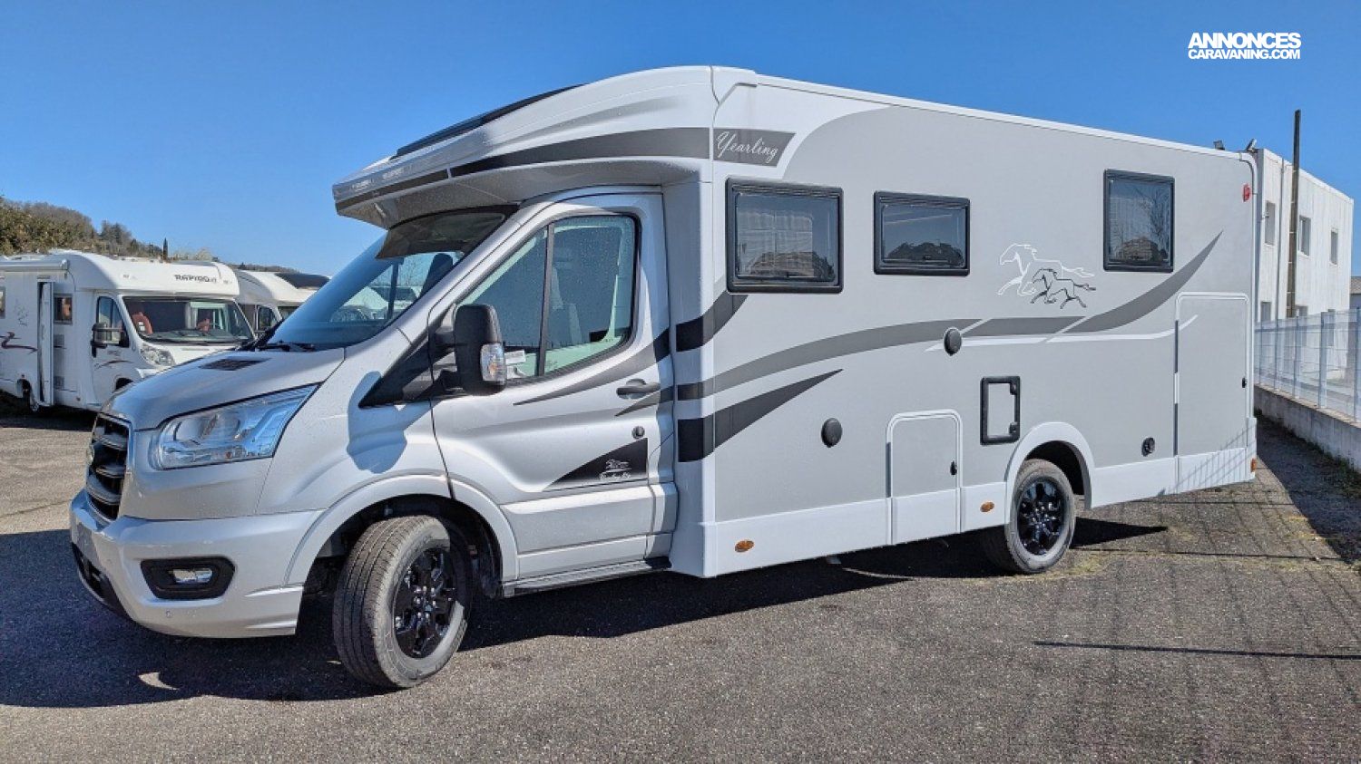 Mc Louis Yearling 81 version 2025, un profilé sur le nouveau Ford 165 cv en boîte auto avec lit central sur soute réglable en hauteur électriquement, salle d'eau/WC, douche indépendante, double séparation chambre /salon, cuisine avec frigo 158 L et maxi salon face/face avec sièges pivotants. Lit de pavillon électrique pour deux personnes au-dessus du salon.