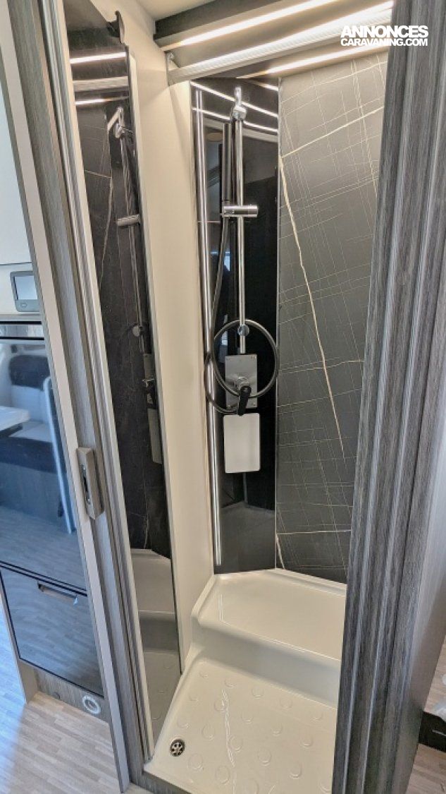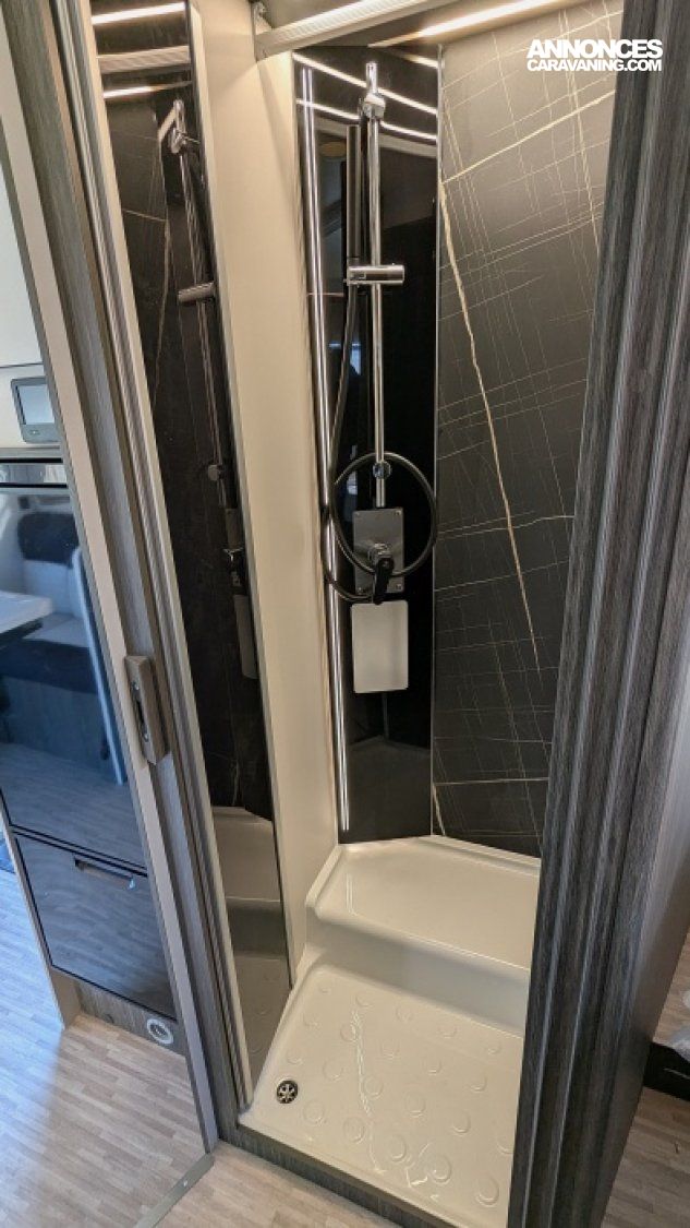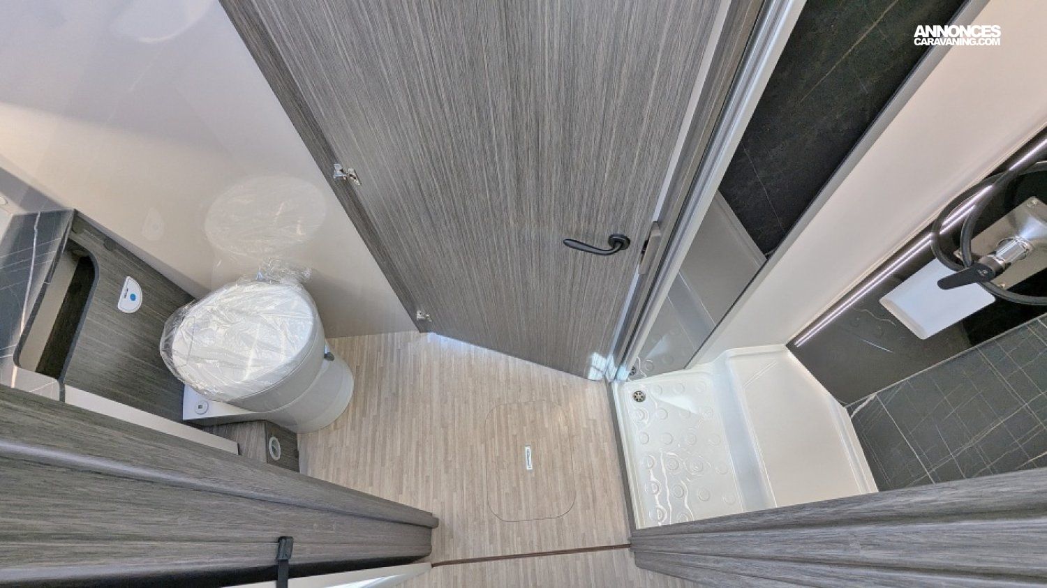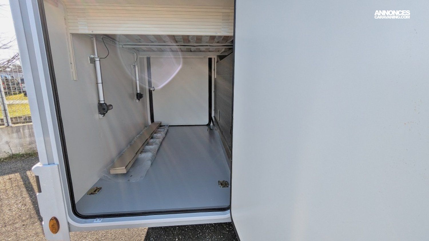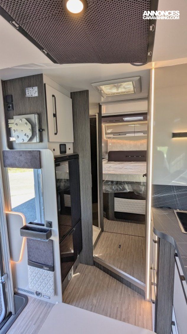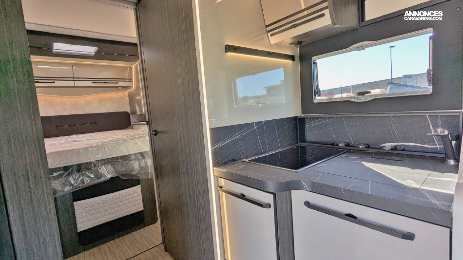 Mc Louis Yearling 81 version 2025, un profilé sur le nouveau Ford 165 cv en boîte auto avec lit central sur soute réglable en hauteur électriquement, salle d'eau/WC, douche indépendante, double séparation chambre /salon, cuisine avec frigo 158 L et maxi salon face/face avec sièges pivotants. Lit de pavillon électrique pour deux personnes au-dessus du salon.