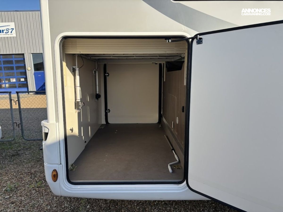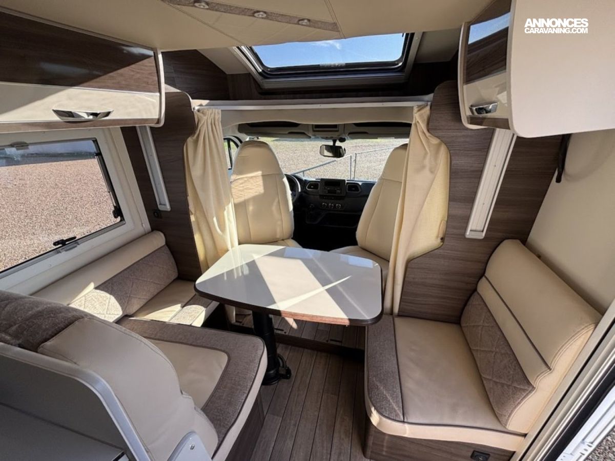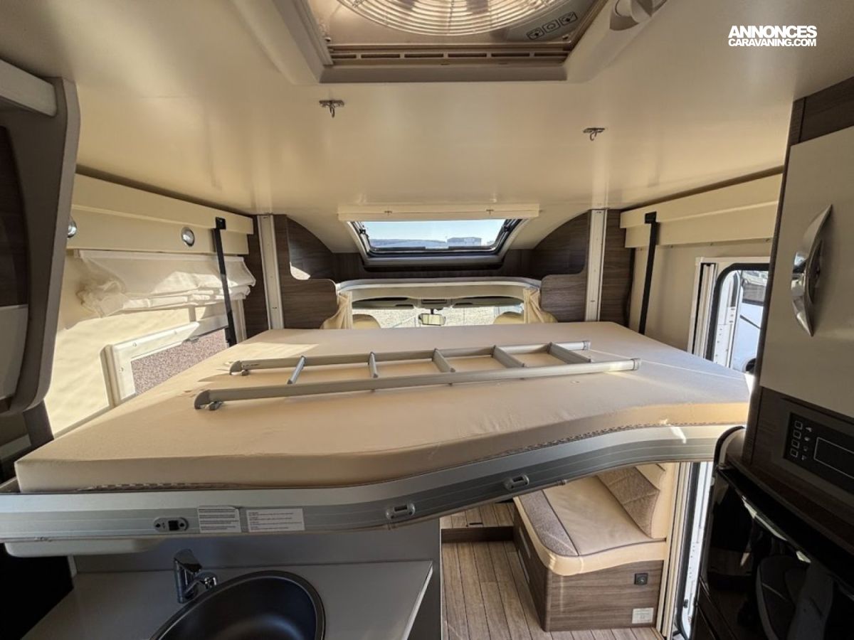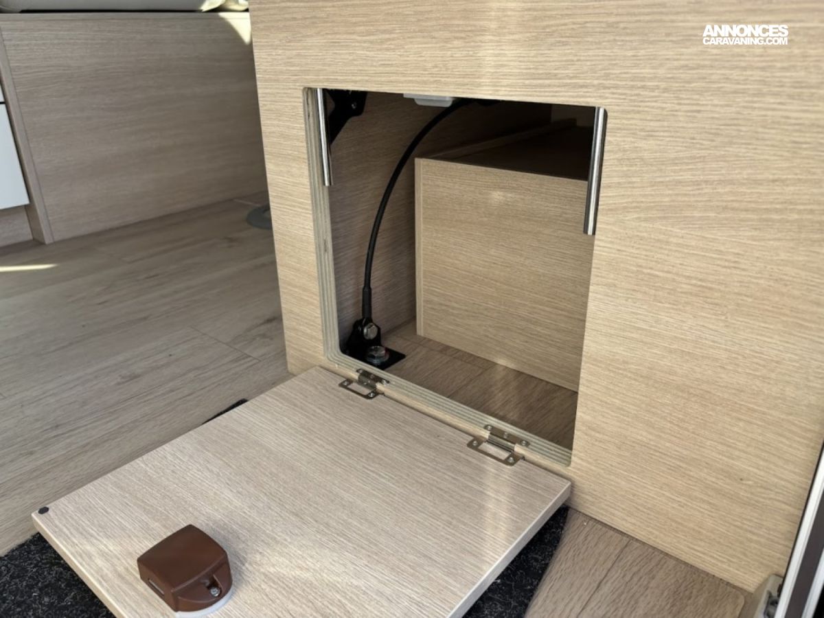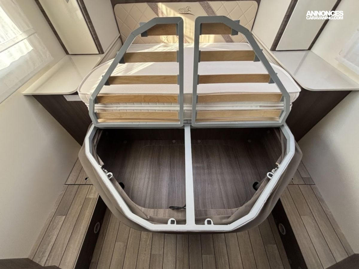Cuisine en L, Grande soute, Lit central, Lit dînette avant, lit pavillon, Salon avant sièges pivotants, Salon en L, Soute réglable en hauteur, WC Cassette.