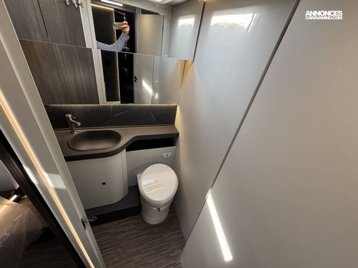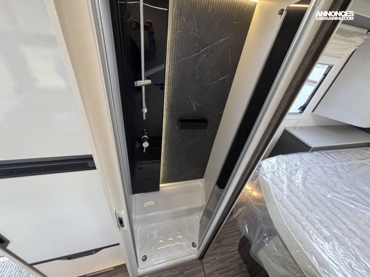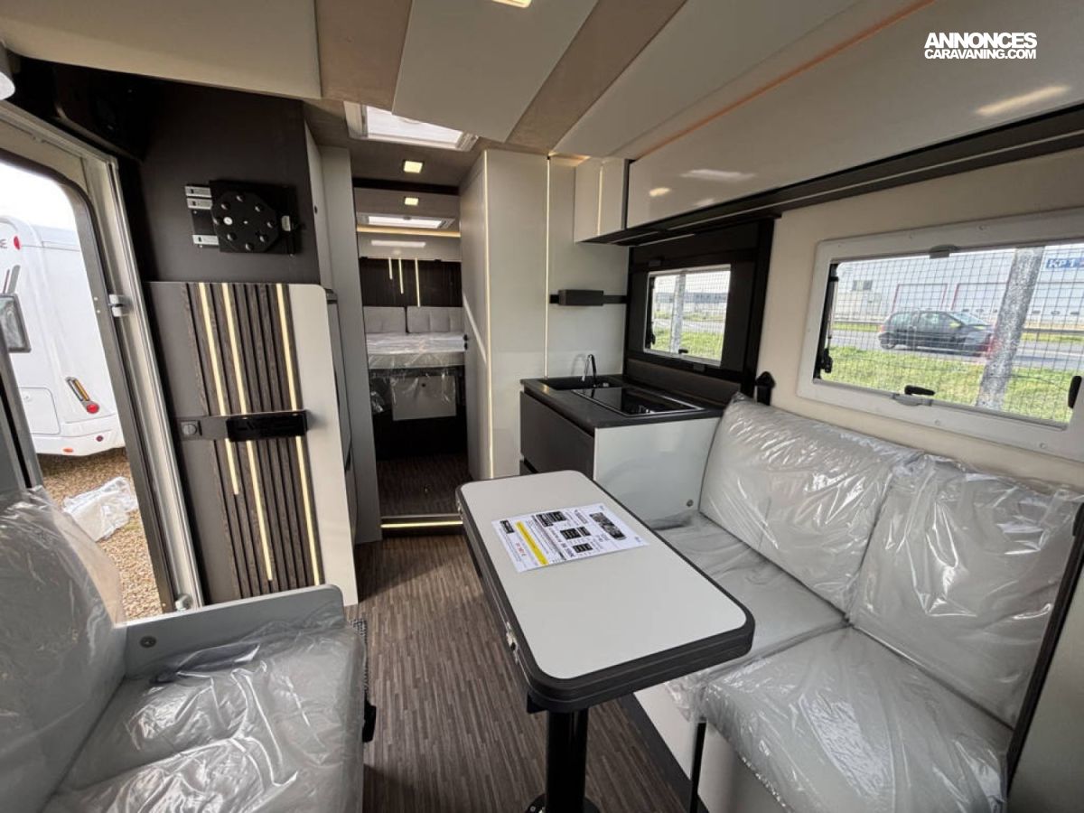 Cuisine en long, Douche indépendante, Grande soute, Lit central, lit pavillon, Salon avant banquettes face à face, Salon avant sièges pivotants, Soute réglable en hauteur, WC Cassette.
