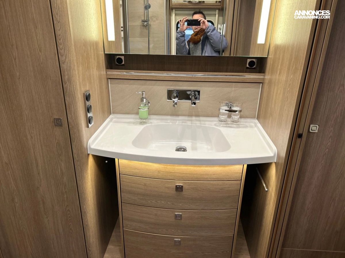 - Habitacle NOVEL : Banquette ouverte sur le salon, plan de travail de cuisine spacieux en résine minérale pleine masse, double vasque, tiroirs à grande extension, machine à café Nespresso avec porte-capsules et prise 230V (pas pour modèles Q)