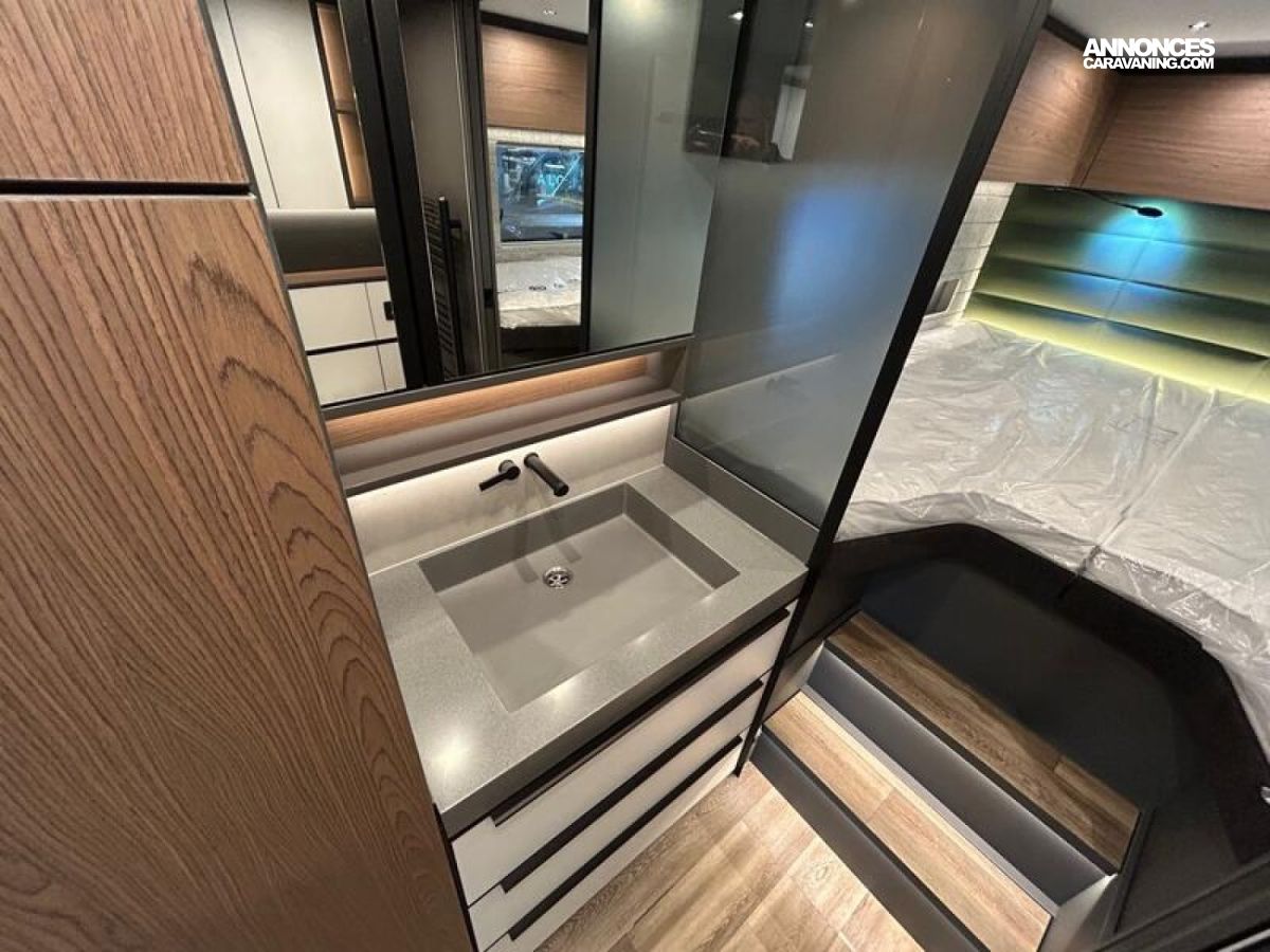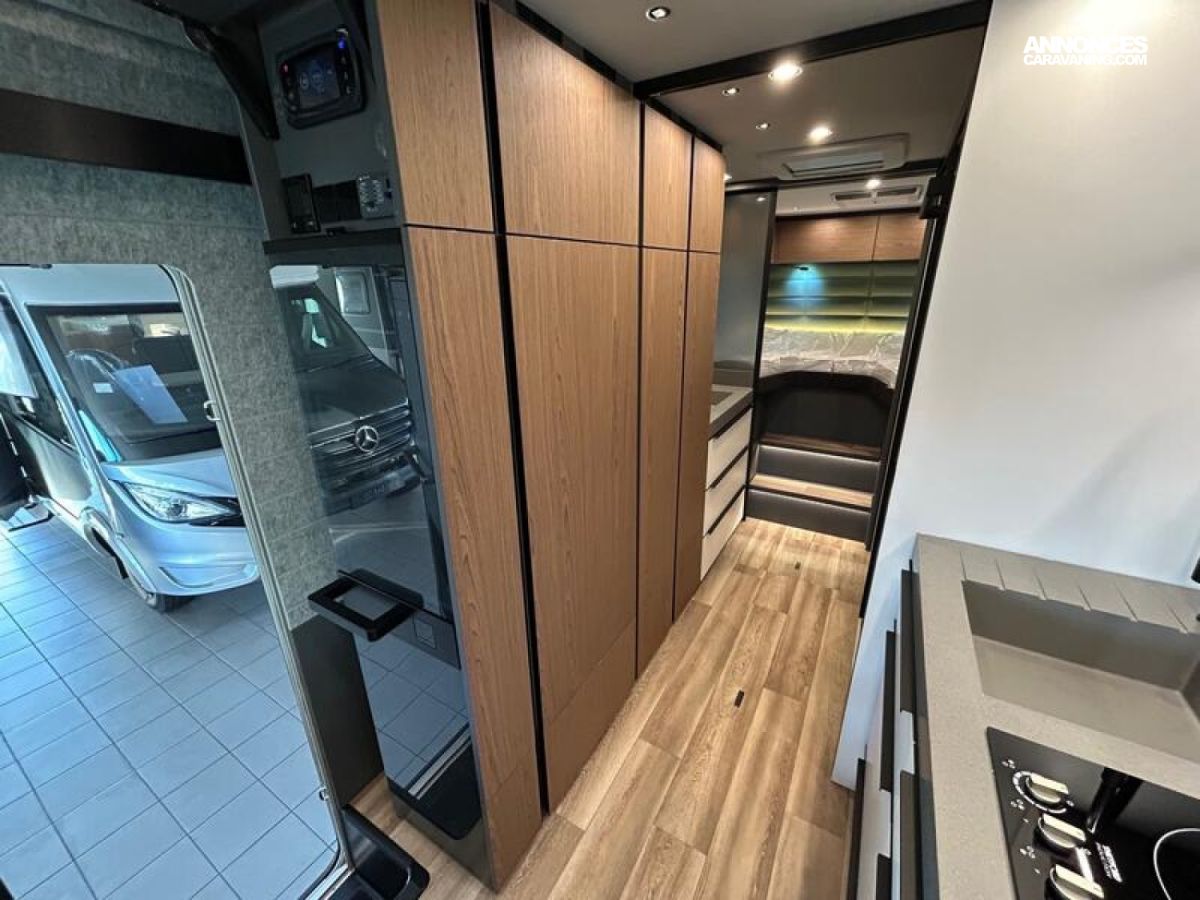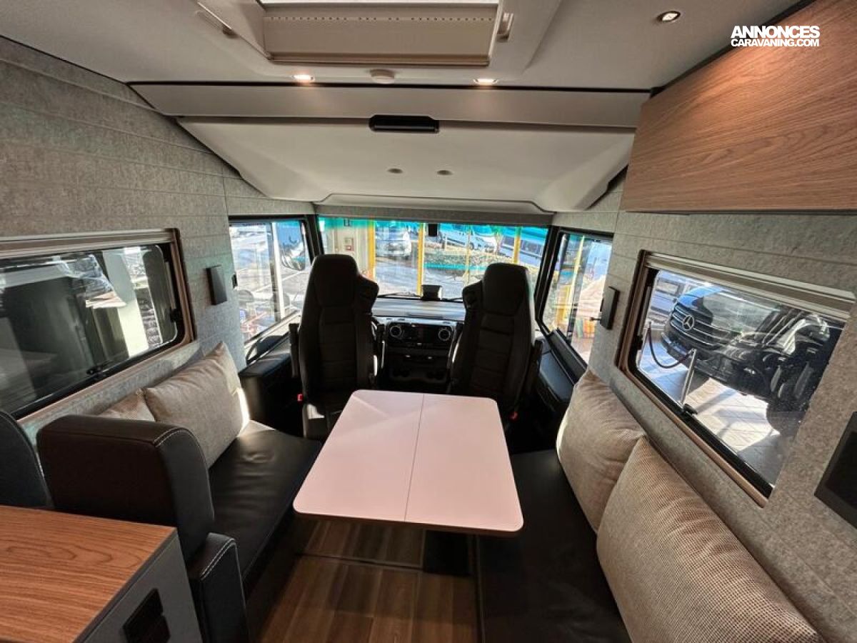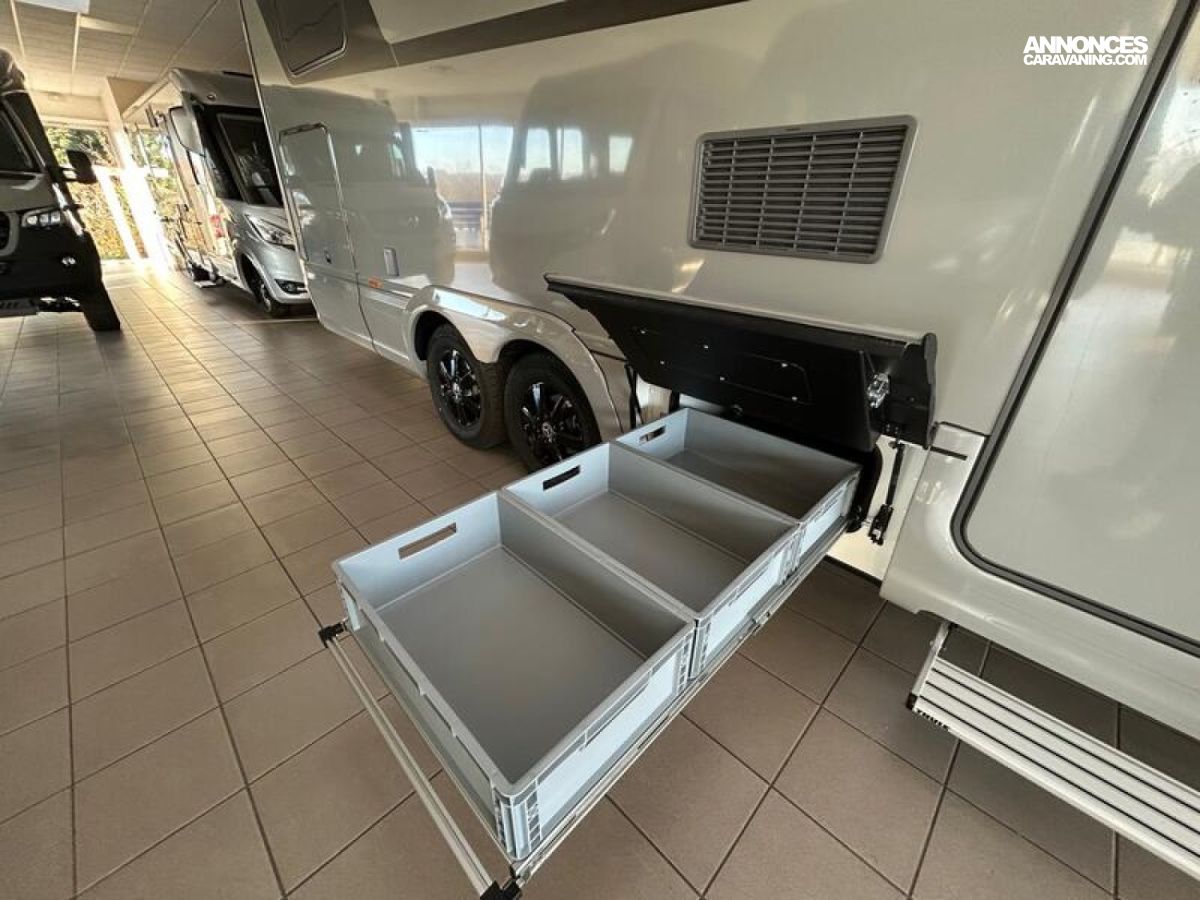 Attraction (cuir anthracite) + Armoire avec tringle à vêtements et tiroir à la place de suspension pour pantalons (pour le modèle 88) + Motorisation 125 KW/170 CV + Boîte de vitesses automatisée 9G-Tronic + Crochet d’attelage (amovible) + Vérins hydrauliques (AL-KO HY4) avec système de nivellement automatique et fonction pesée + Suspension pneumatique arrière avec mise à niveau + Sièges conducteur et passager, chauffants avec soutien lombaire + Feux anti-brouillard à LED 310€/Feux de croisement et de route à LED 1510€ + Ventilateur au-dessus de la cuisine + Système de rangement dans le double-plancher 95x85 cm + Store extérieur électrique, 6 m, éclairage LED & variateur + Lit de pavillon manuel en remplacement des placards avant + Banquette face à face transformable en banquette en L côté conducteur + Mini coffre fort + Machine à café (à capsules 230V) escamotable par push-lift dans le compartiment de rangement de la cuisine + Rangement coulissant 155 x 65 cm 930€/Rangement coulissant 125 x 65 cm 850€ + Tuyau de vidange escamoté dans un tube + Vidange à commande électrique du réservoir eaux usées + Détendeur de sécurité Truma DuoControl CS + 2 filtres pour bouteilles de gaz + Alarme en cas de fuite de gaz + Vidange à commande électrique du réservoir fixe WC Code V5001510A + Aération toilette SOG par le toit + Système de filtration de l'eau Aquaclear (procédé par traitement UV ) + Climatisation de toit chambre arrière (puissance de climatisation de 2.500 w. et de chauffage de 2.000 w + Échangeur de chaleur moteur + Prise de courant 230 V dans le garage + Prise gaz extérieure Code V50230JA + Valet pour les penderies situées sous les lits arrières : 52975 €
