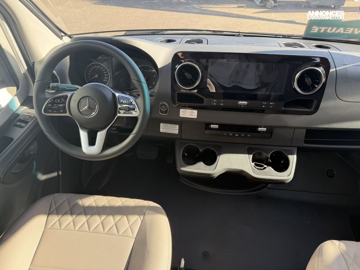 COMPLEMENT DE COUCHAGE 1 PERSONNE SALON, AMORTISSEURS SPECIFIQUES STABILISATION NIVEAU 3 (pack exclu), 2 BOUTEILLES 13 KGS, FERMTEURE CENTRALISEE DES 3 PORTES, PORTE CELLULE XL 2 POINTS, MARCHES PIEDS ELECTRIQUE ( pack exclusiv cellule), INVERSEUR DE GAZ AUTOMATIQUE, FEUX ANTIBROUILLARDS + ASSITANT FEUX DE ROUTE ( pack exclu), SYSTEME MEDIA MBUX ( paxk exclusiv ), JANTES ALU 17 POUCES MERCEDES ( pack exclusiv), COUPA BATTERIE MOTEUR ( pack exclusiv), CHAUFFAGE COMBI 6 GAZ, ISOLATION + CHAUFFAGE RESERVOIR D EAU USEE, BATTERIE LITHIUM 95 AH AGM GEL, REFRIGERATEUR DOMECTIC 153 L