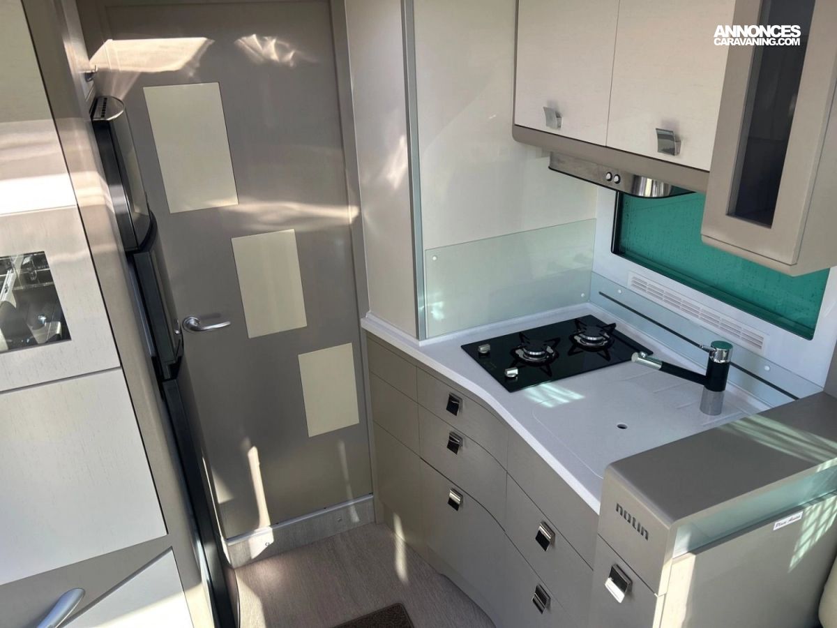 - Cuisine : plan de travail en résine Corian, évier haute qualité, poubelle intégrée, robinetterie luxe à tête pivotante, mini-four gaz, hotte aspirante avec éclairage leds, maxi tiroirs de rangement freinés, colonne à épices