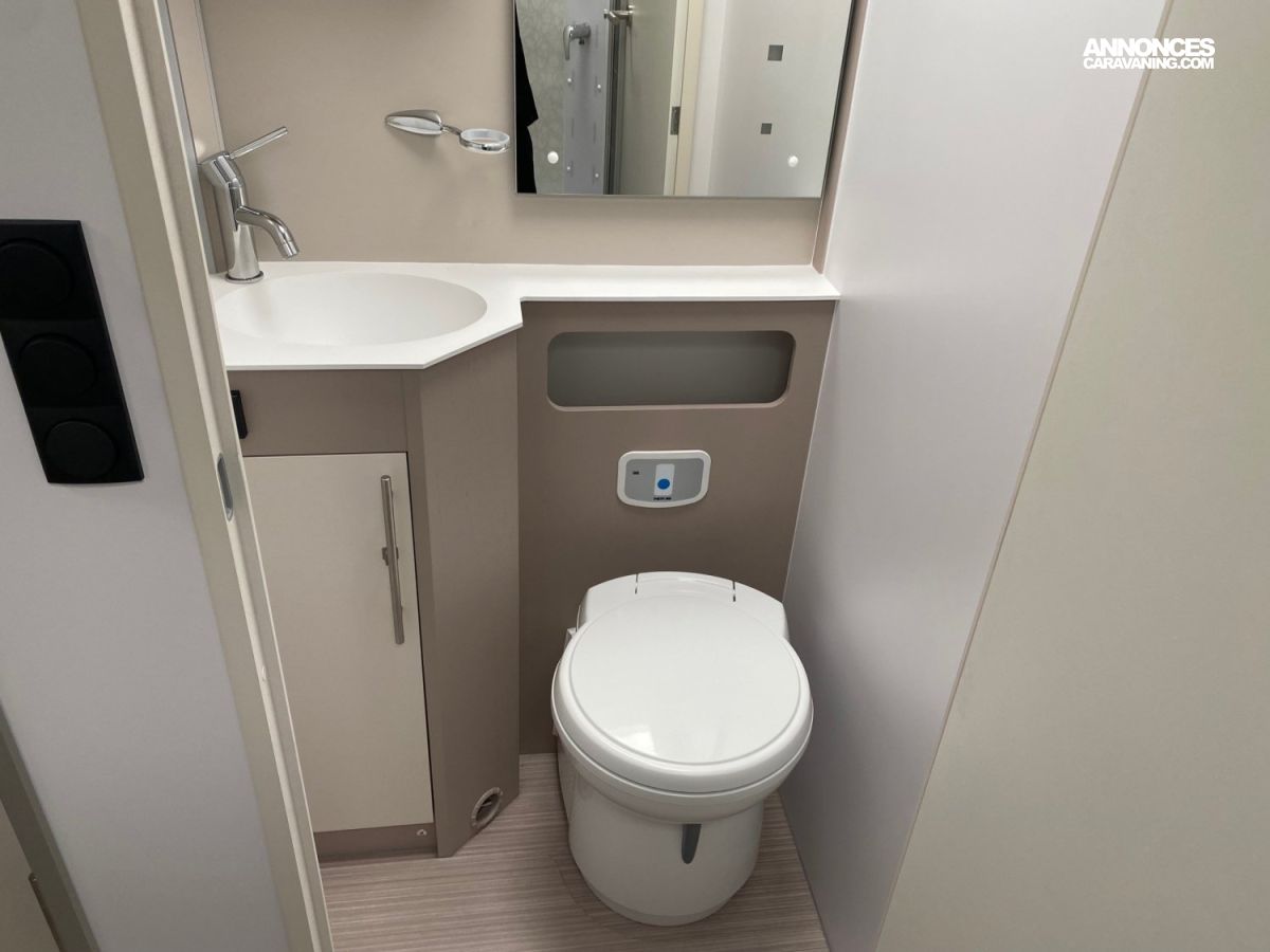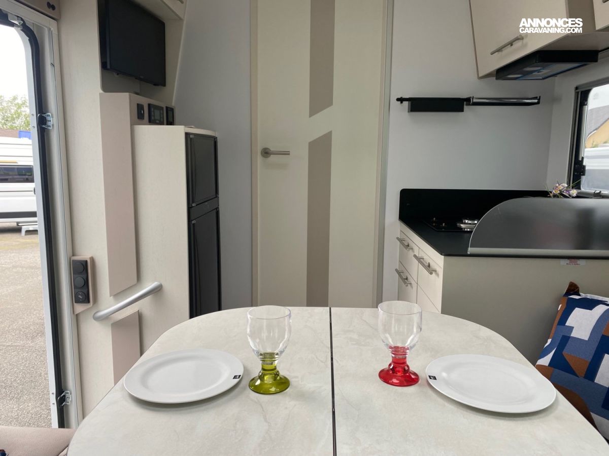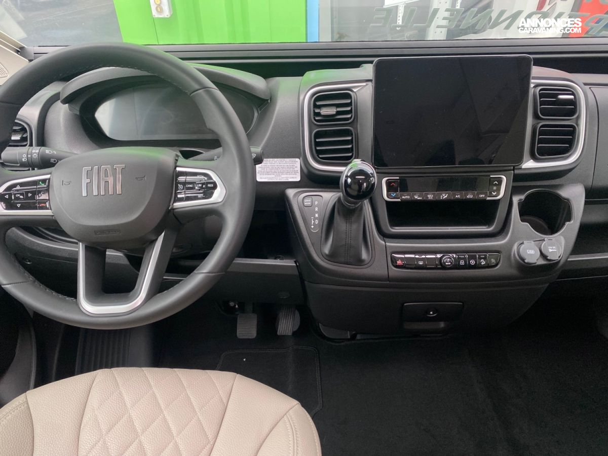 Équipements inclus :Pack Progress :- Antibrouillard avant- Pare-chocs peint- Feux avant full LED- Pack Lounge : Radio 10” avec DAB + Navigation, climatisation automatique, chargeur téléphone à induction, combiné numérique- Caméra de recul connectée sur l’écran 10”- Pack Volant Cuir : jantes aluminium bi-ton 16”, habillages intérieurs gris alu- Stores cabine avec fonction rideau d’intimité- Marchepied électrique, tapis de conduite, prédisposition lithium, support TV salon- Isolation & chauffage réservoir eaux uséesPack Autonomie Électrique - Batterie lithium 100Ah Ultimatron- Panneau solaire 200W- Régulateur MPPT