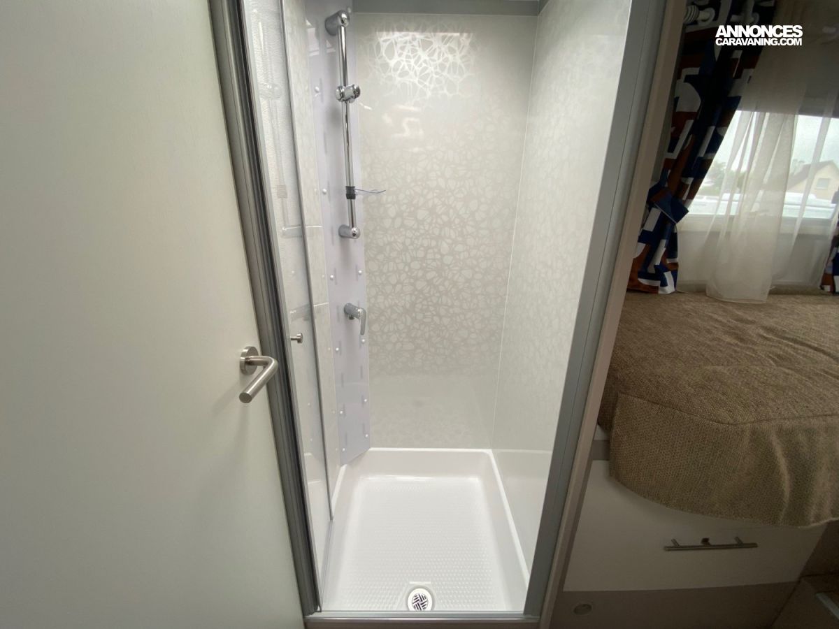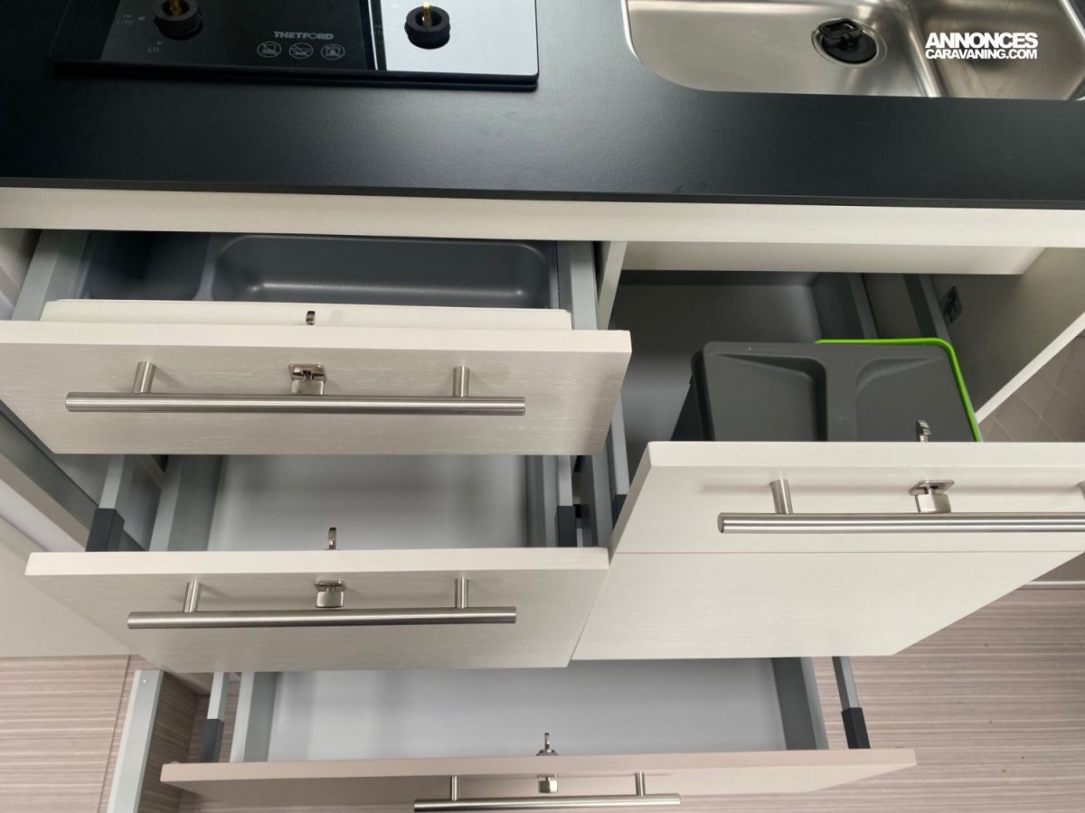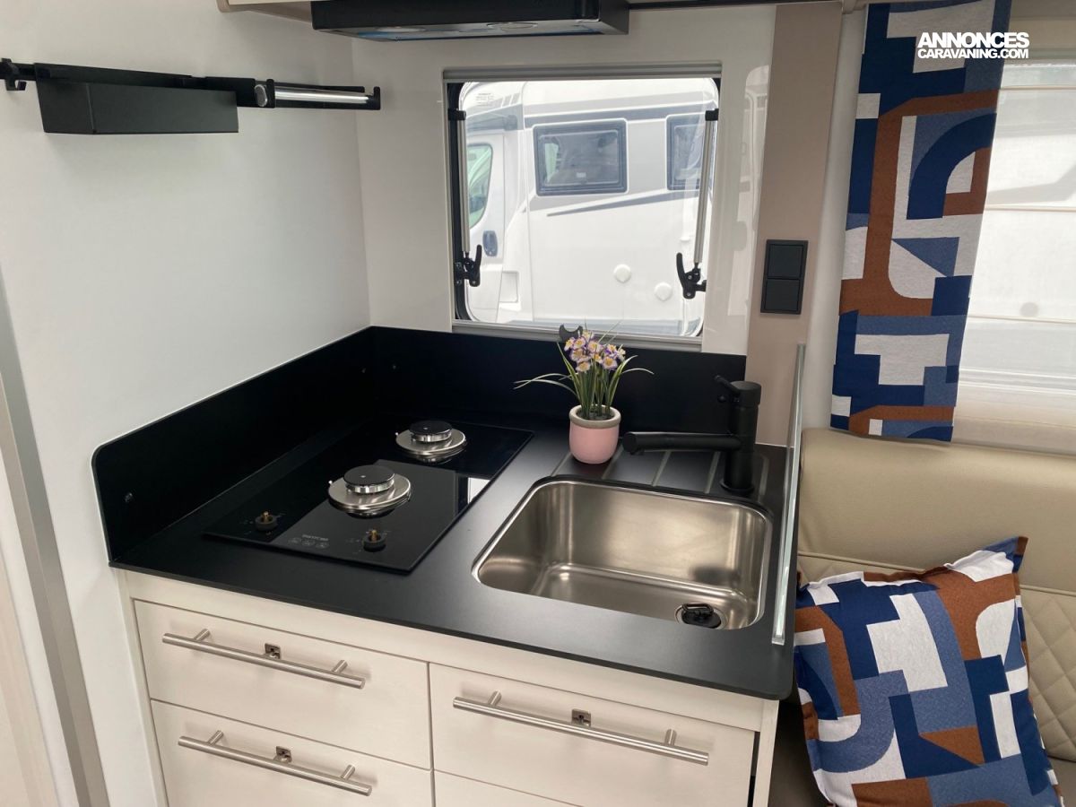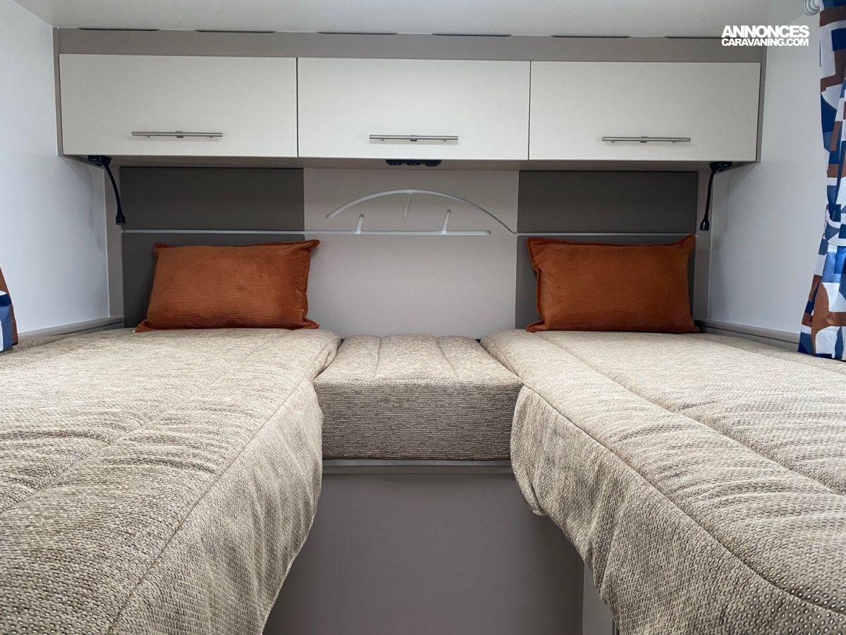 Équipements inclus :Pack Progress :- Antibrouillard avant- Pare-chocs peint- Feux avant full LED- Pack Lounge : Radio 10” avec DAB + Navigation, climatisation automatique, chargeur téléphone à induction, combiné numérique- Caméra de recul connectée sur l’écran 10”- Pack Volant Cuir : jantes aluminium bi-ton 16”, habillages intérieurs gris alu- Stores cabine avec fonction rideau d’intimité- Marchepied électrique, tapis de conduite, prédisposition lithium, support TV salon- Isolation & chauffage réservoir eaux uséesPack Autonomie Électrique - Batterie lithium 100Ah Ultimatron- Panneau solaire 200W- Régulateur MPPT