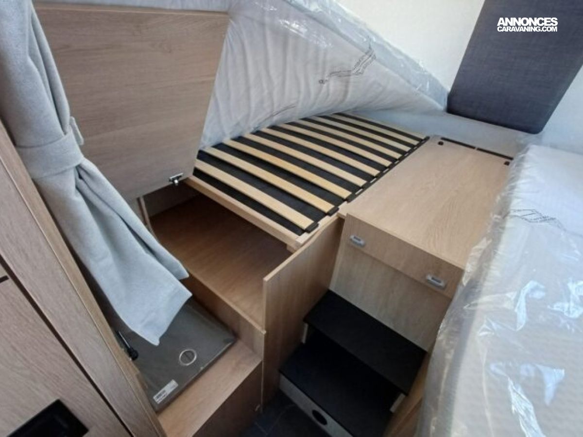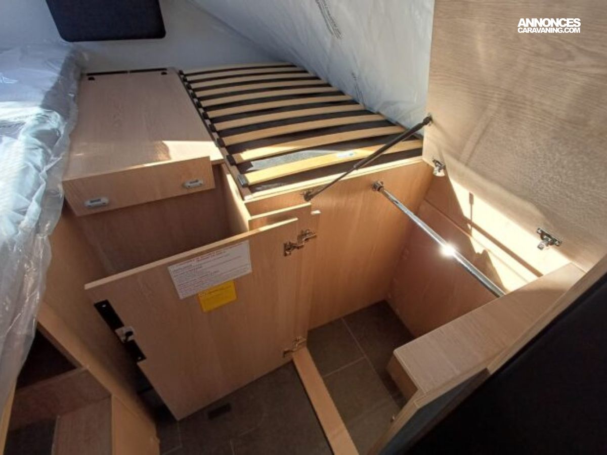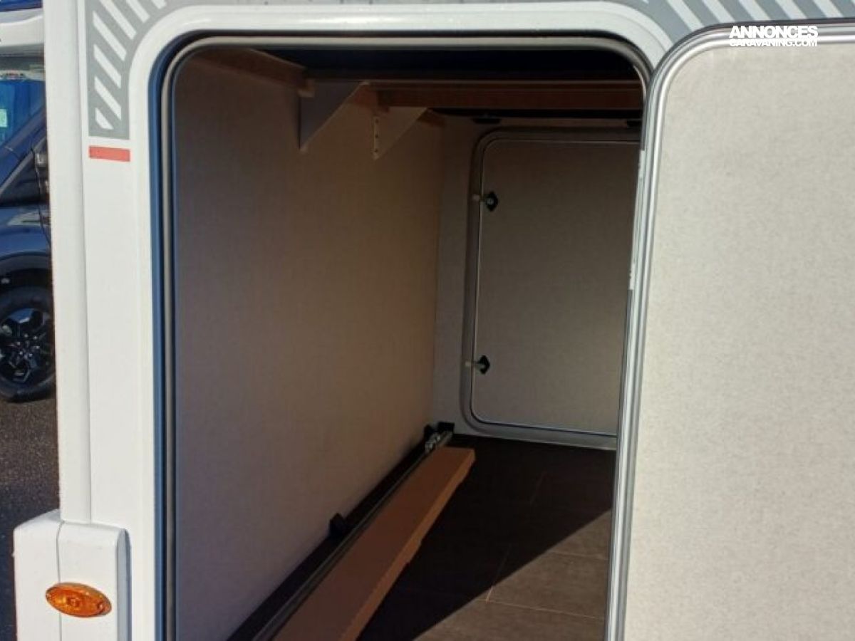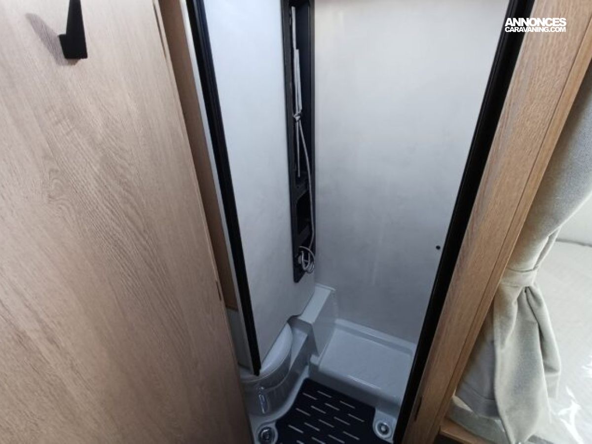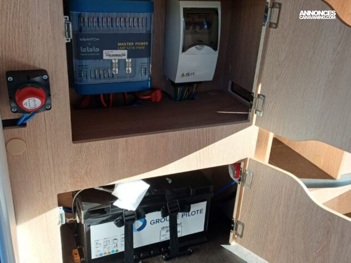 Soit : éclairage, prise 230V et rails en soute, douchette, store banne, caillebotis, inverseur automatique, crash sensor, réservoir eaux usées hors-gel, poubelle intégrée et porte-serviette