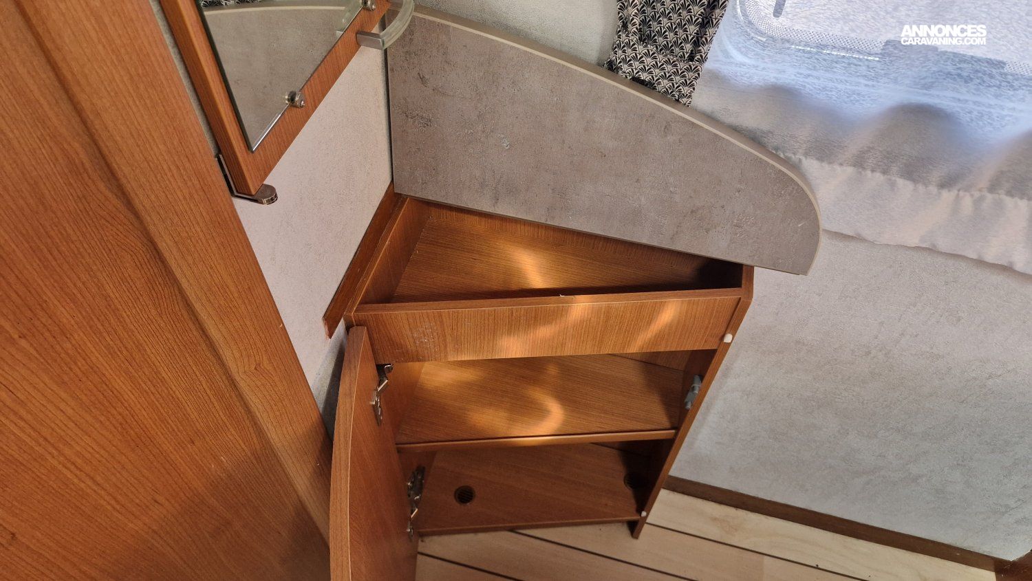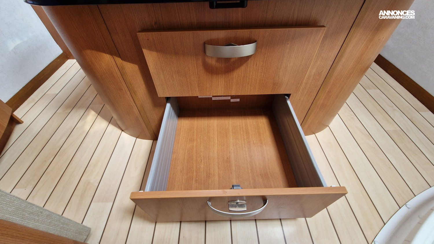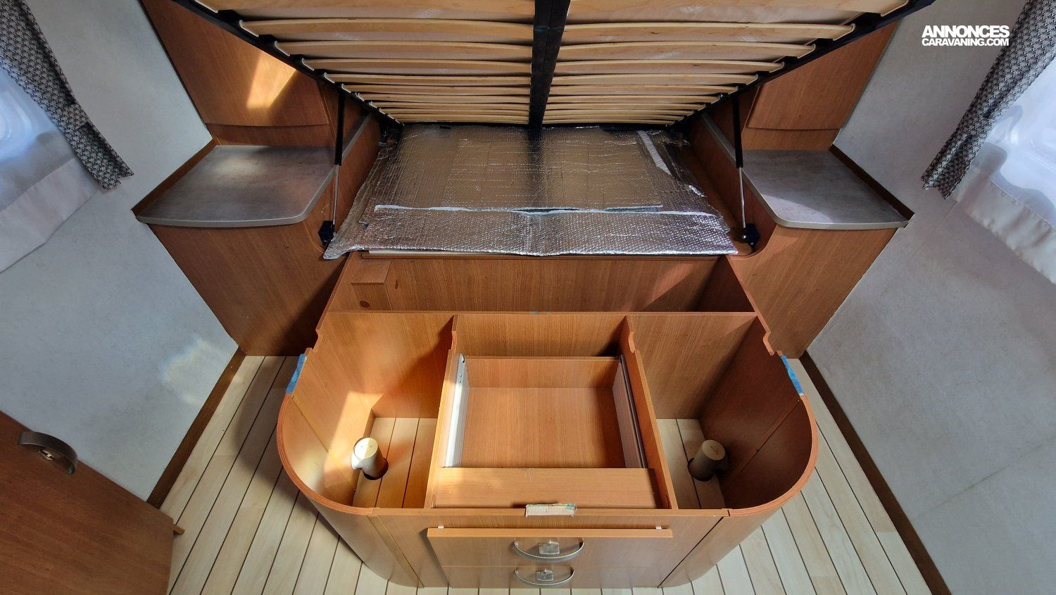 Une implantation idéale pour un couple ou une famille : lit permanent central et lit de pavillon aux dimensions généreuses, cuisine toute équipée, salon spacieux et convivial, cabine de douche et cabinet de toilette indépendants.