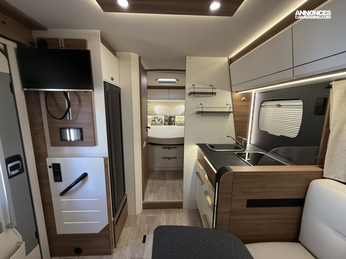 Pensé pour voyager en toute saison, ce modèle bénéficie d’une bonne isolation thermique (structure Isotek), de réservoirs hors gel, et d’un équipement énergétique renforcé avec une batterie lithium 150 Ah, un convertisseur 2000 W et un panneau solaire haute performance. Le store extérieur 4,50 m et le kit Soplair extérieur isolant complètent l’équipement pour des étapes confortables été comme hiver.