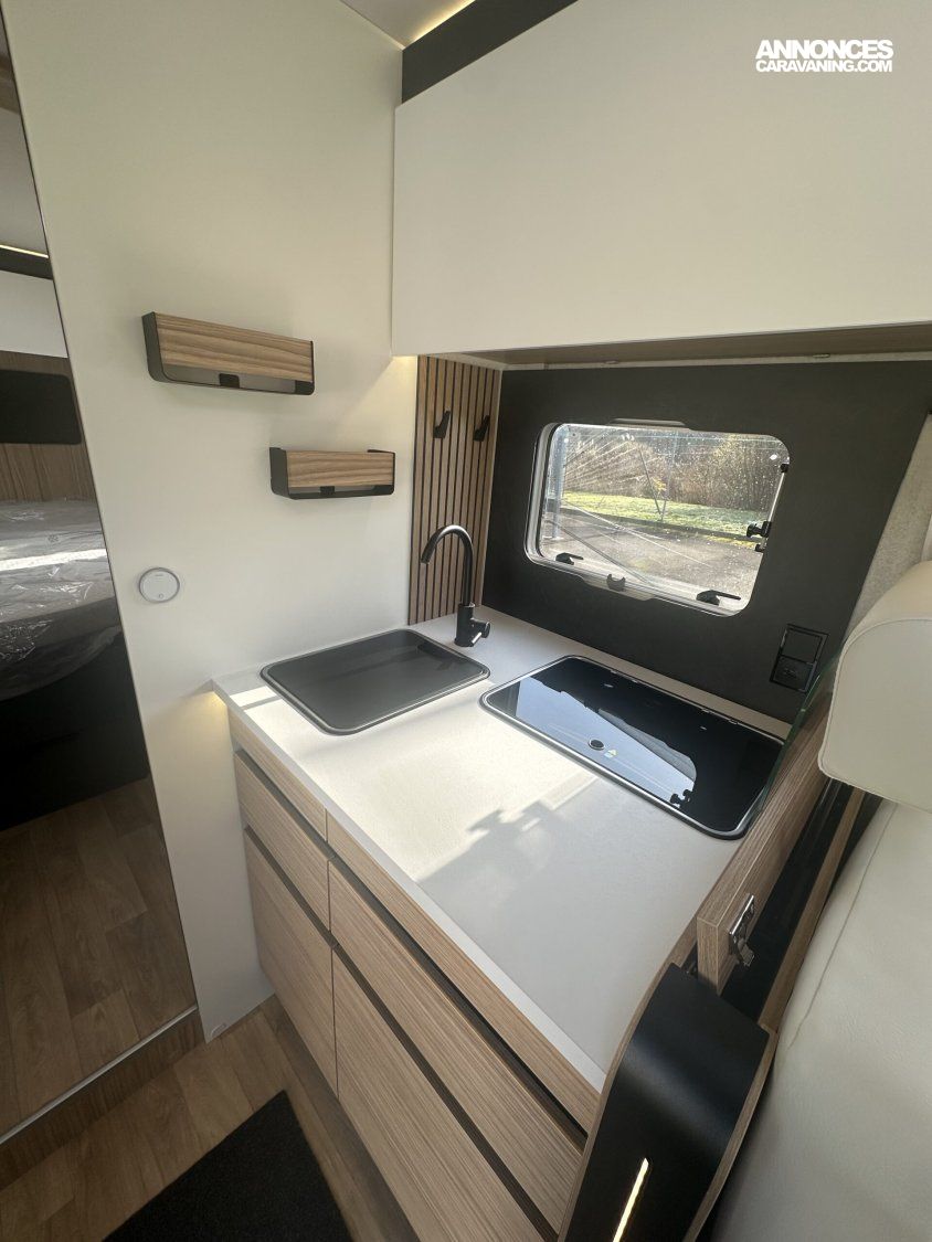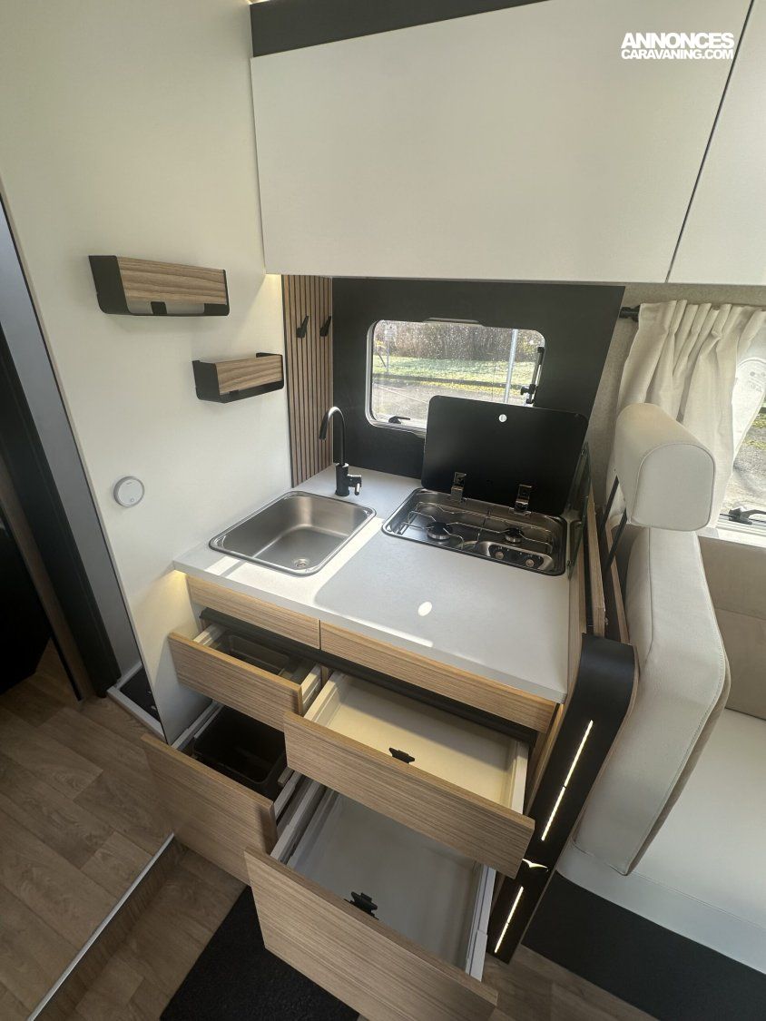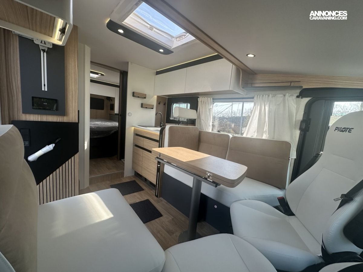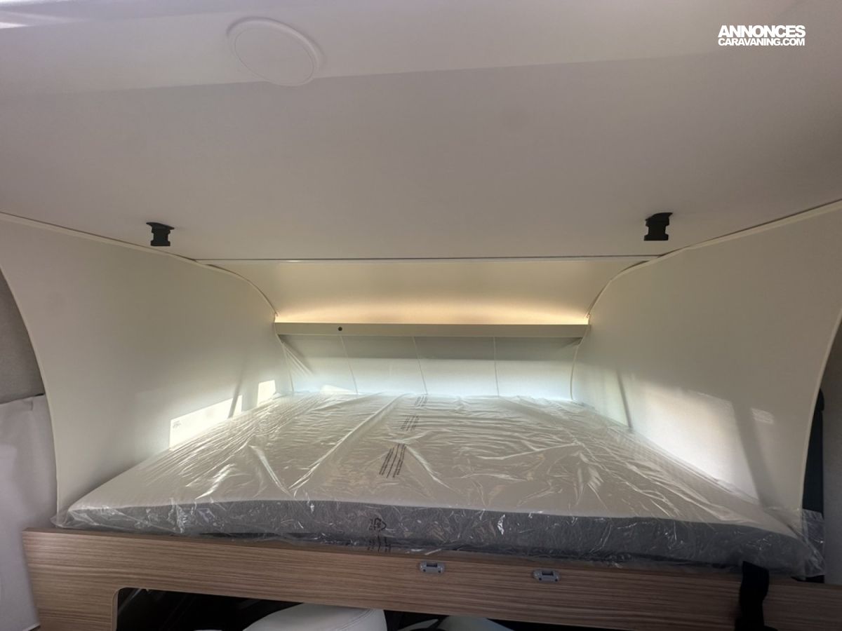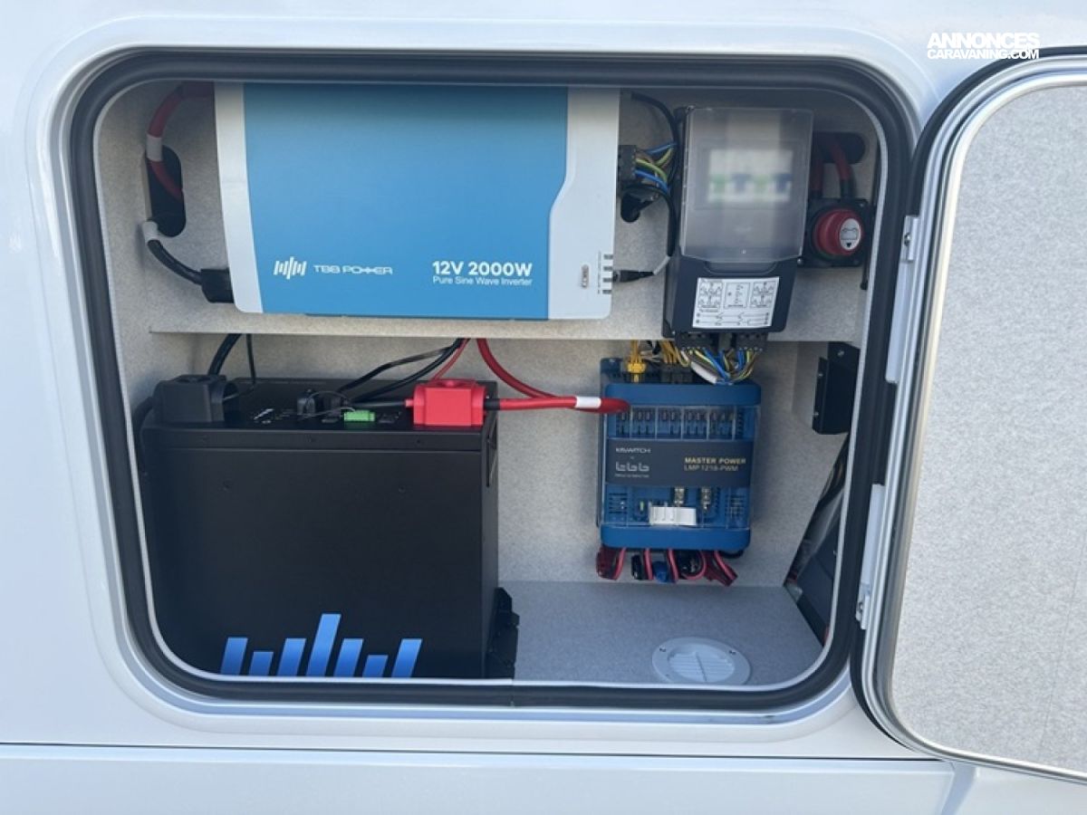 Motorisation 2.2L - 180cv Boite automatiquePack jantes : jantes alliage 16'', volant simili et aérateur gris aluPack média 10'' : autoradio 10'', GPS, DAB, Apple carplay/android auto, caméra de recul, haut-parleurs dans la cabine et la cellule, climatisation automatique, chargeur a induction et tableau de bord digitalBatterie lithium 300Ah et 2 panneaux solaires 210 W monocristallinsConvertisseur 12V / 230V pur sinus 2000WCombi D6E Truma chauffage / boiler 6000w (Diesel/230V)Grand éclairage, rails et prise 230V en souteDouchette eau chaude / eau froide dans la souteTiroir bas de caissePrise gaz extérieurePoubelle intégrée et accessoires pour compartimenterTapis anti-dérapants dans les tiroir cuisineRéfrigérateur a compressionCaillebotis de douchePorte-serviette repliableEclairage dans la penderie de la chambreHousses de draps adaptés aux matelasNouvelle sellerie bi-ton et bi-matière simili et TissuSoute réglable en hauteur électriquement sous le lit central