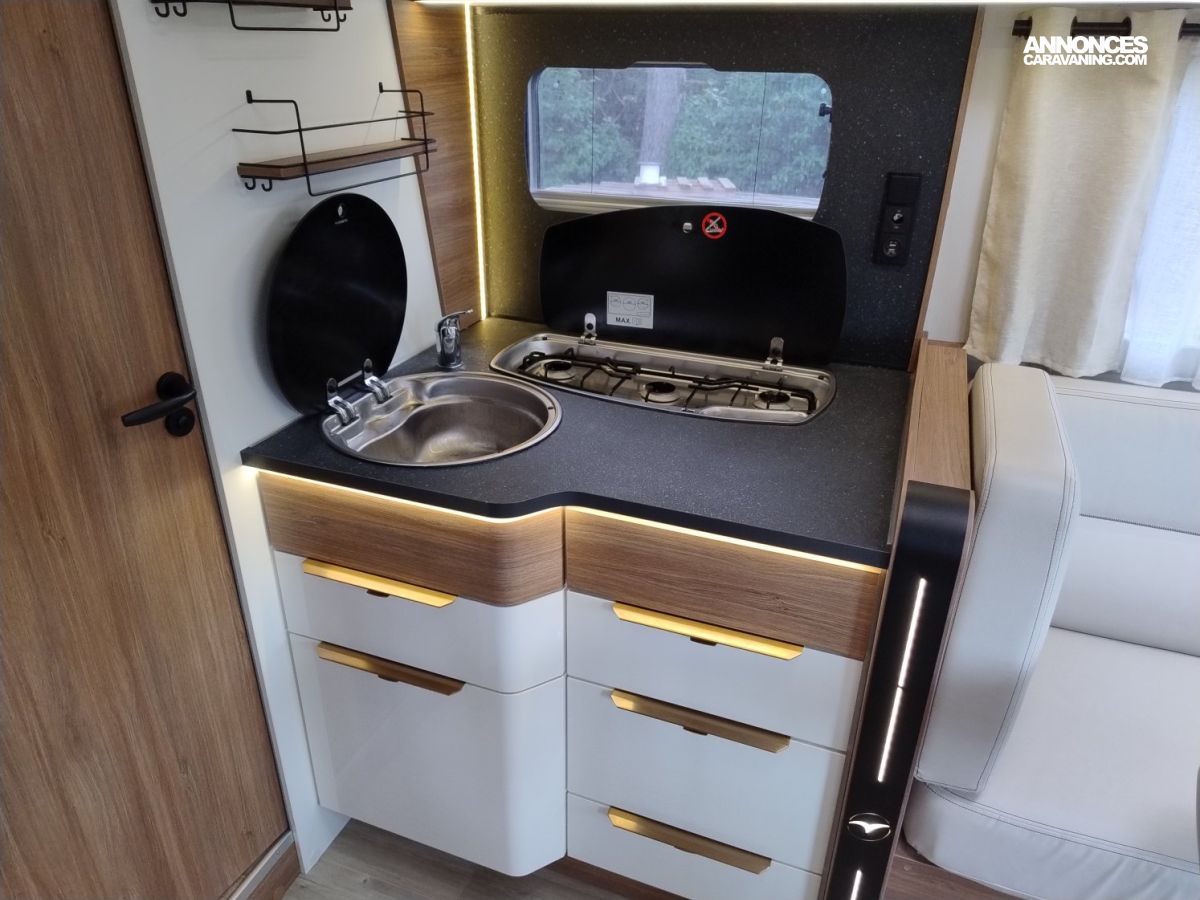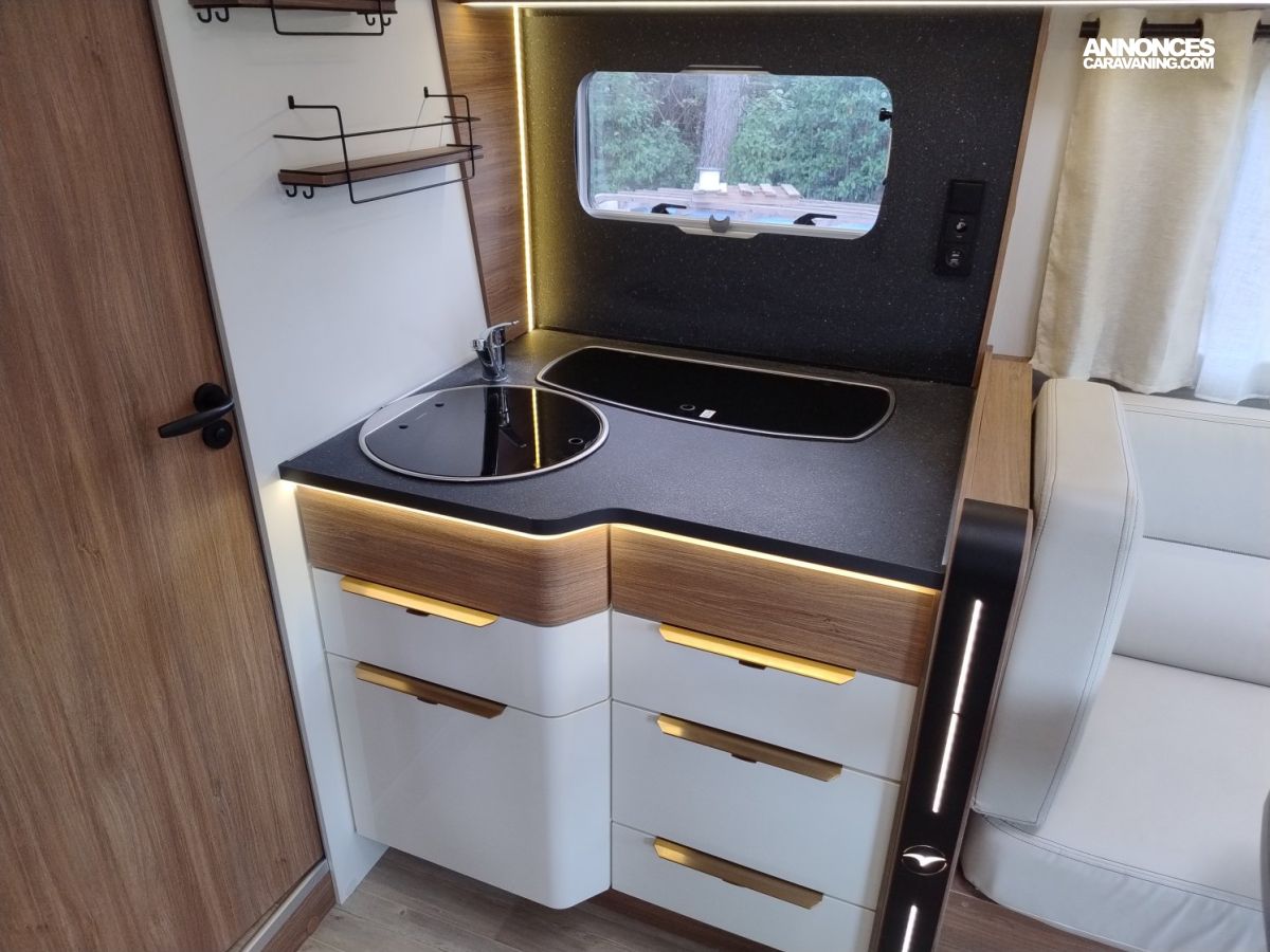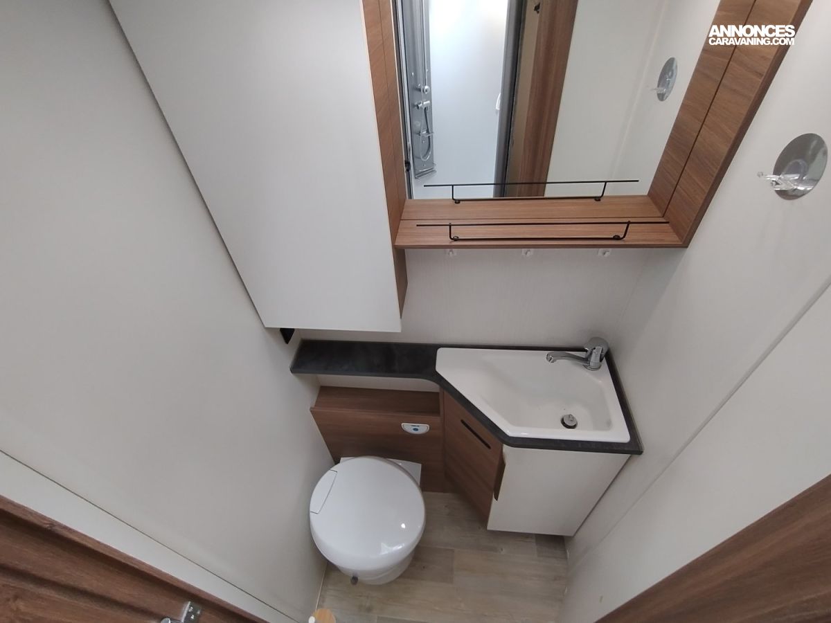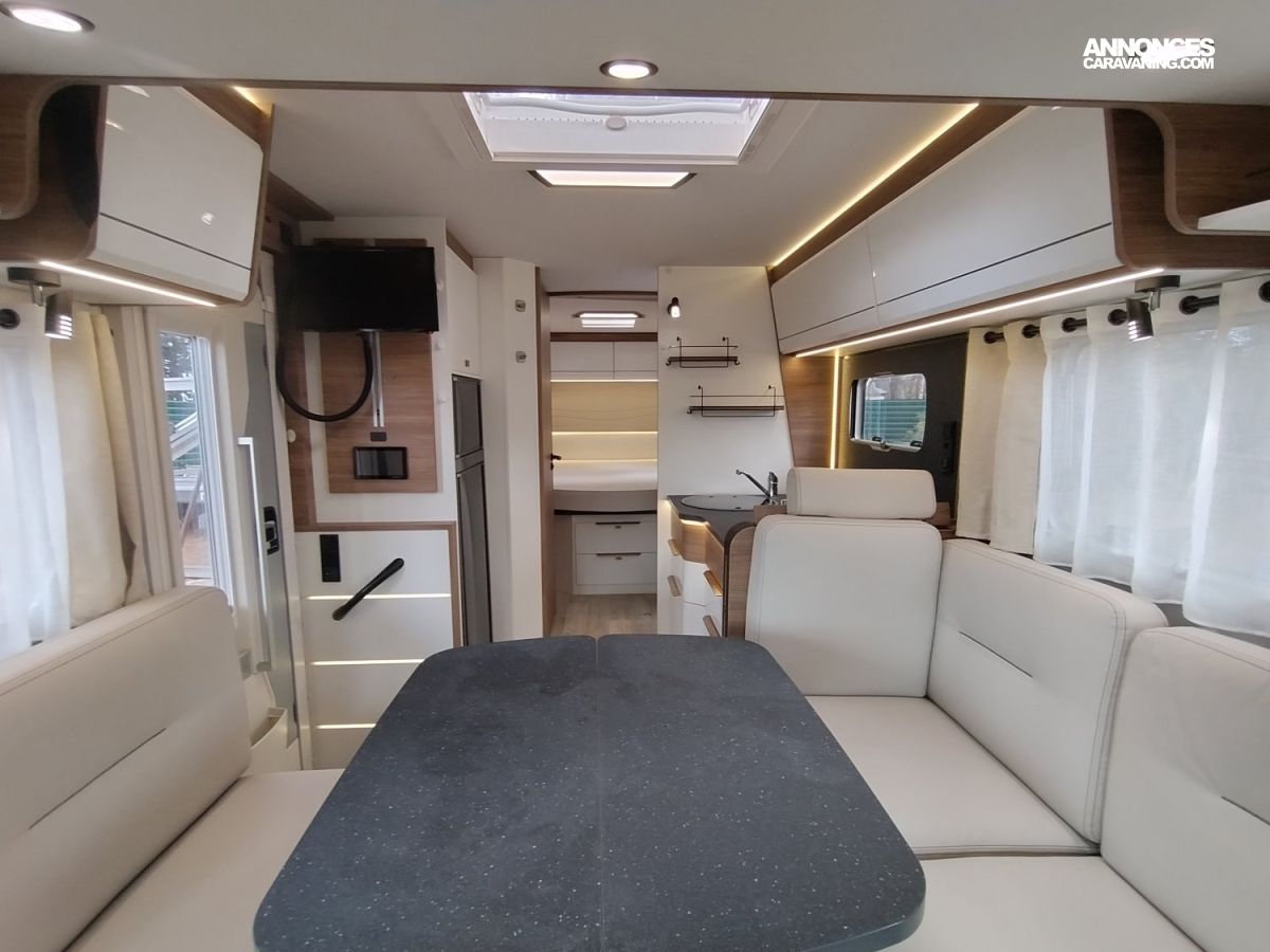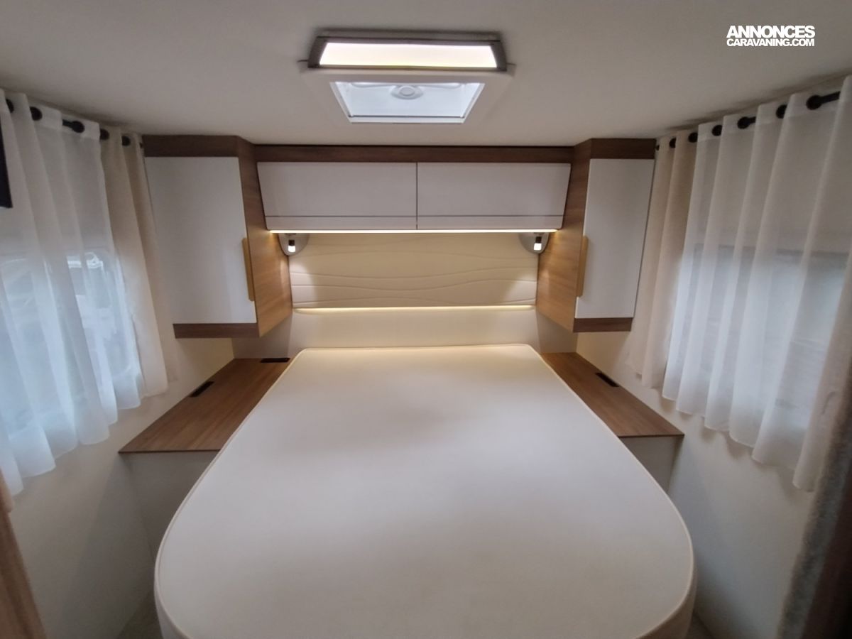 Une implantation idéale pour un couple ou une famille grâce à ses 4 places carte grise : grand lit central permanent et lit de pavillon à l’avant, cuisine toute équipée avec grand frigo et congélateur, salon face à face spacieux, cabine de douche et cabinet de toilette indépendants.