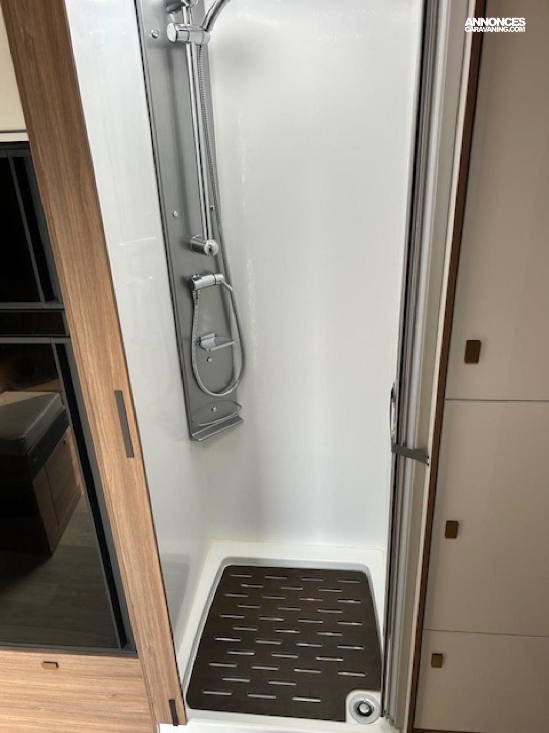 la salle d'eau située derrière la cabine de conduite avec cloison mobile de séparation et également de très grande taille avec une douche de grande dimension.